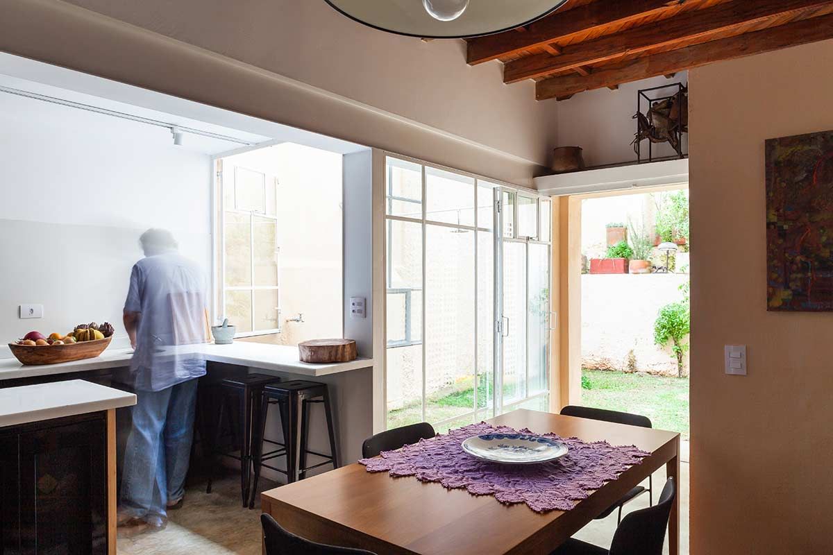 A casa tinha espaços sem aberturas para o exterior, então para começar, paredes foram retiradas e uma grande sala, onde hoje é o jardim, suprimida, sempre respeitando as limitações estruturais. Removeu-se também na íntegra o piso, restos de cerâmica, carpete, vinil e vários níveis do forro. A demolição desses elementos trouxe luz aos acabamentos originais que estavam em bom estado e foram submetidos a lixamento, tratamento contra fungos e regularização com óleos adequados para sua homogeneização. Atualizada, a morada agora é funcional e superinteressante.