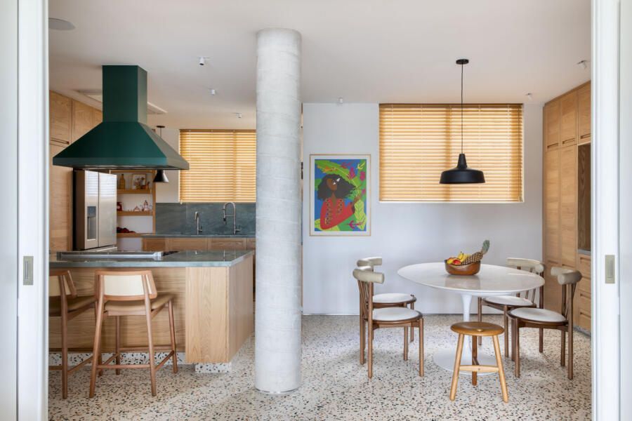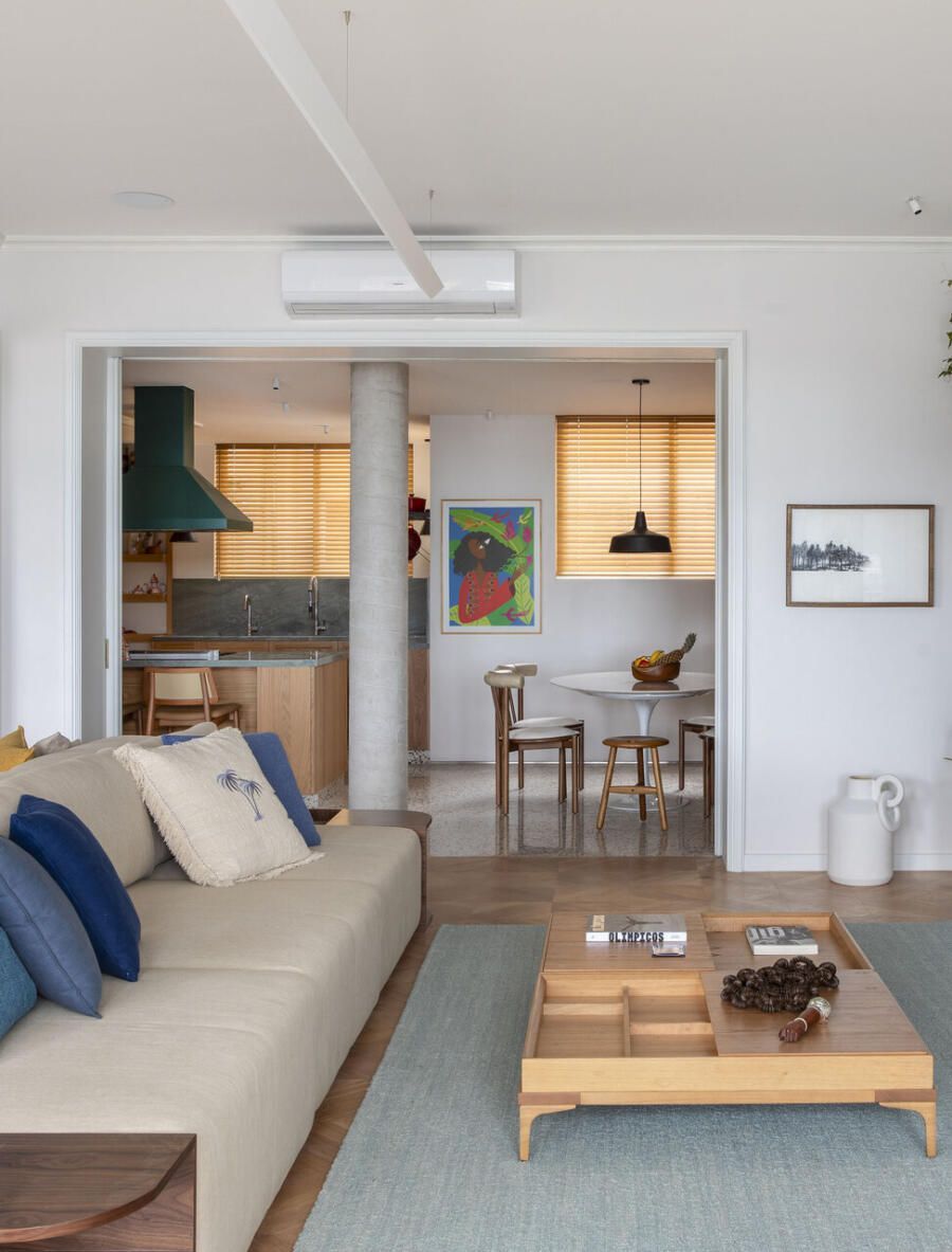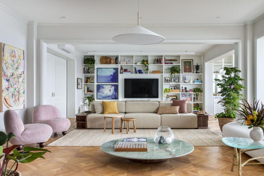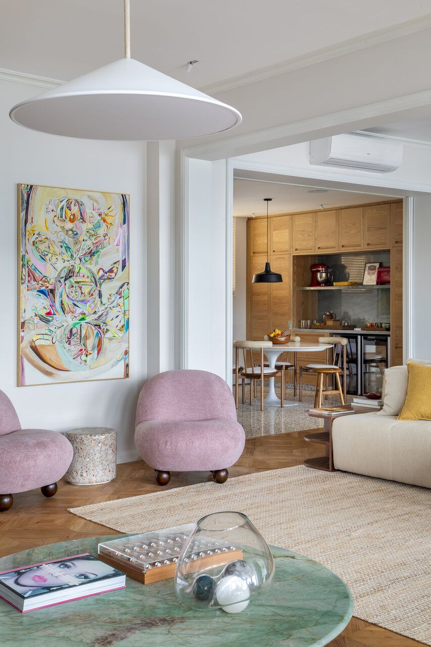 A decoração foi pensada para traduzir a identidade da família, combinando mobiliário brasileiro assinado com elementos que remetem à história do casal. Obras de arte, objetos afetivos e uma paleta de cores que mescla tons terrosos, rosados, verdes e azuis criam uma atmosfera acolhedora e sofisticada. O piso de granilite na cozinha adiciona textura e cor ao projeto, reforçando a estética contemporânea.