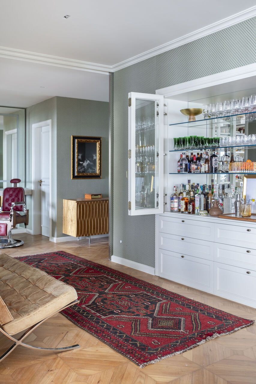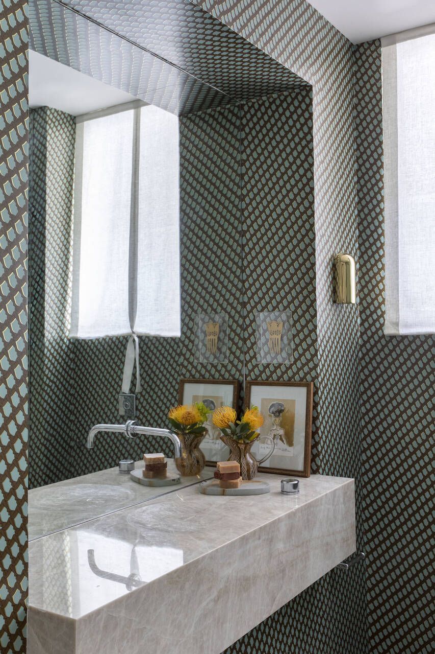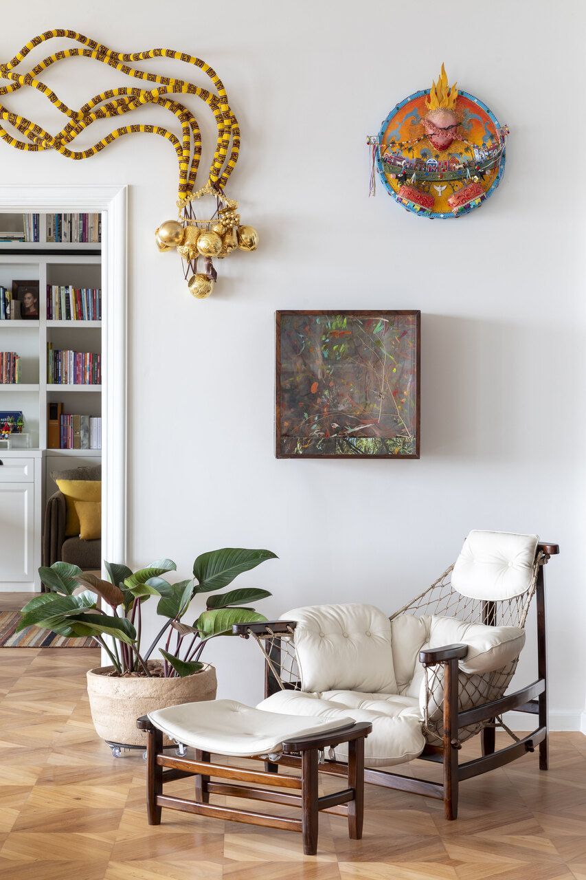 A decoração foi pensada para traduzir a identidade da família, combinando mobiliário brasileiro assinado com elementos que remetem à história do casal. Obras de arte, objetos afetivos e uma paleta de cores que mescla tons terrosos, rosados, verdes e azuis criam uma atmosfera acolhedora e sofisticada. O piso de granilite na cozinha adiciona textura e cor ao projeto, reforçando a estética contemporânea.