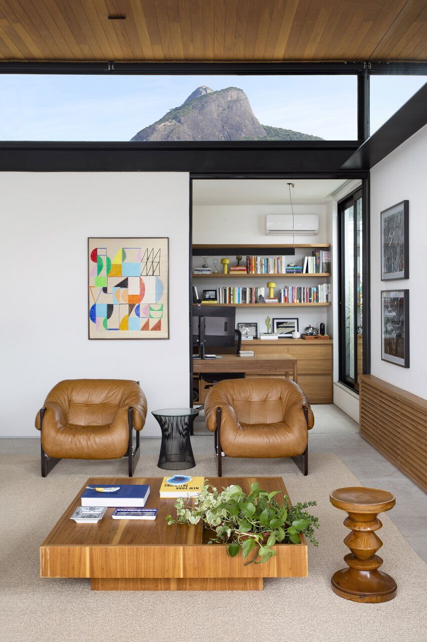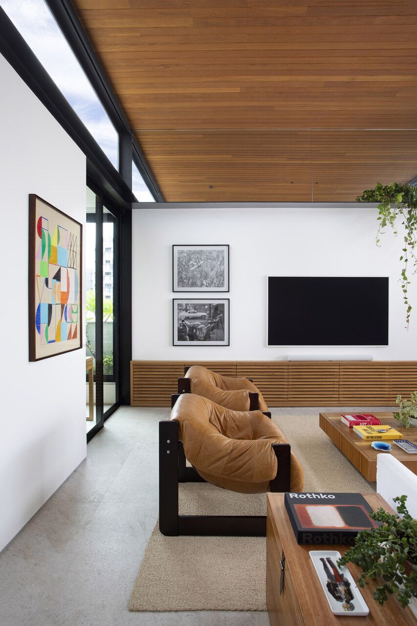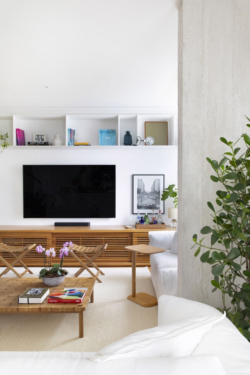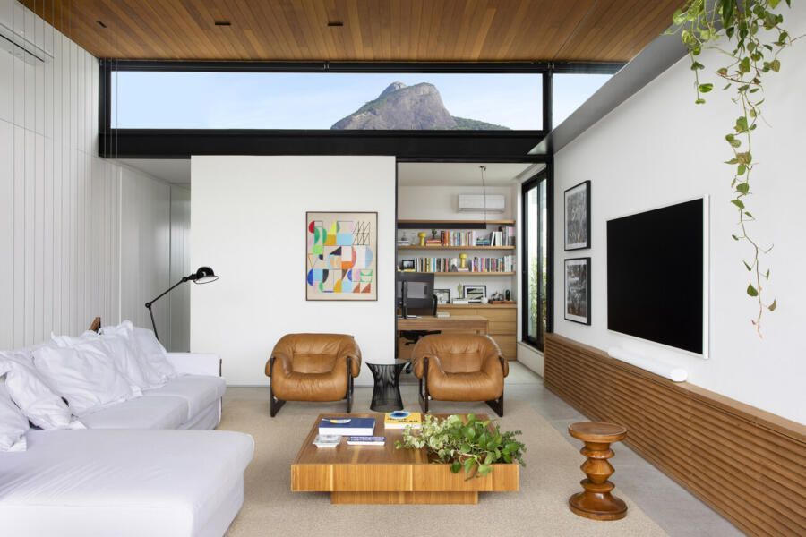 No andar de cima, chama atenção a janela horizontal criada no alto da parede para emoldurar a vista do Morro Dois Irmãos e ampliar a entrada de luz. Outro detalhe é o rack planejado, semi-embutido na parede da TV, que ajuda na organização e otimiza o espaço sem atrapalhar a circulação.
