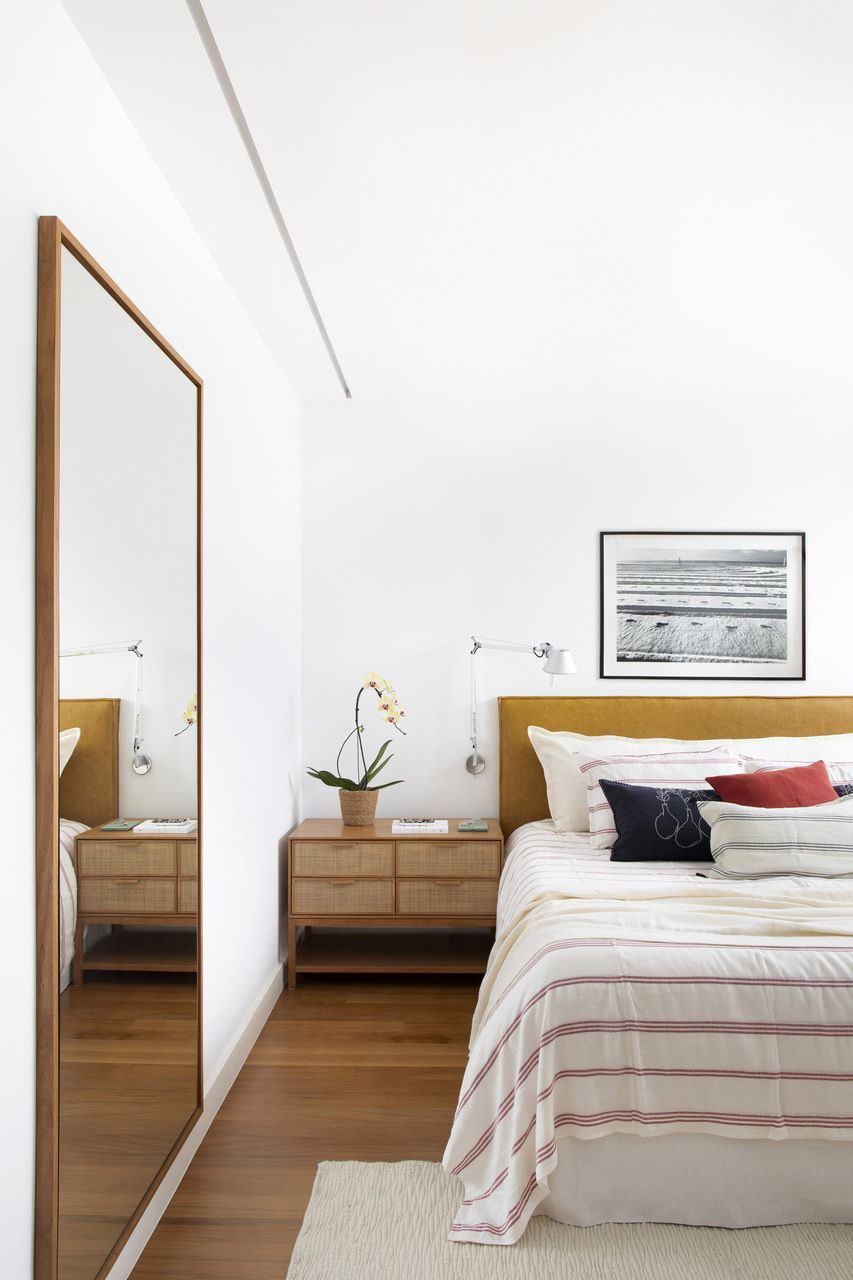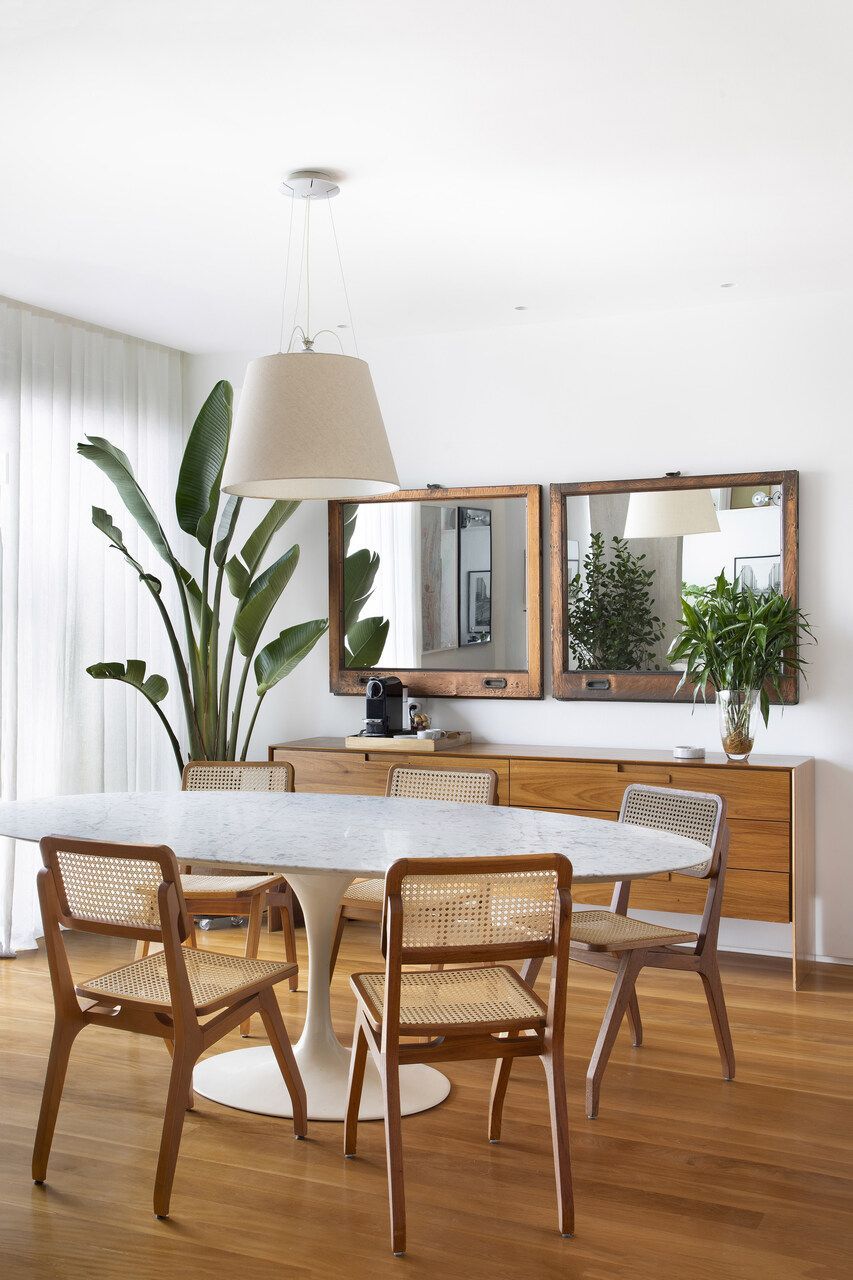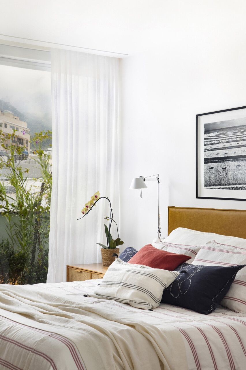 No andar de cima, chama atenção a janela horizontal criada no alto da parede para emoldurar a vista do Morro Dois Irmãos e ampliar a entrada de luz. Outro detalhe é o rack planejado, semi-embutido na parede da TV, que ajuda na organização e otimiza o espaço sem atrapalhar a circulação.