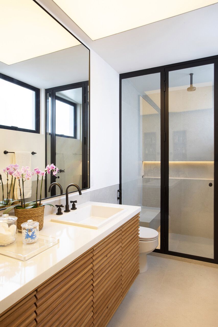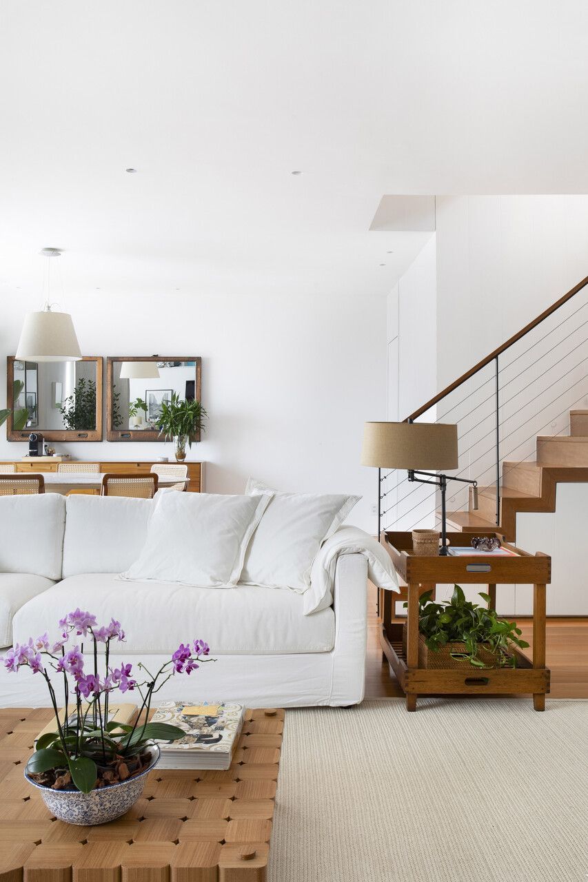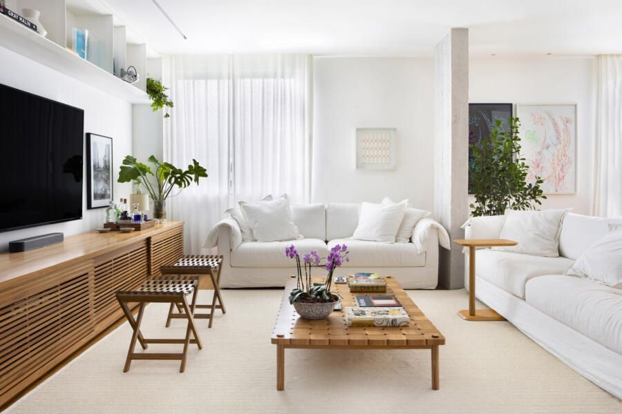 A base da decoração tem tons neutros, como branco e areia, usados em paredes, cortinas, tapetes e estofados. A madeira clara aparece em móveis e marcenaria para dar um clima mais aconchegante, enquanto detalhes em preto nas estruturas e esquadrias trazem um ar contemporâneo.