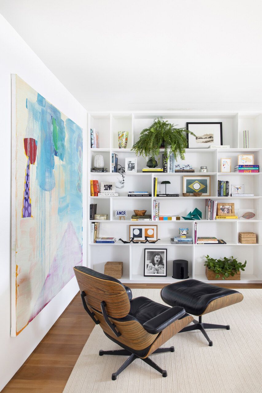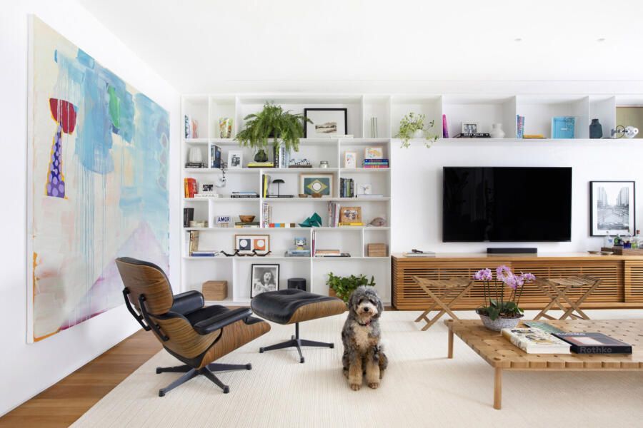 A decoração reflete a história e o gosto pessoal dos moradores. Muitas peças foram reaproveitadas do antigo apartamento, como sofás, cadeiras e objetos de arte. Um destaque é a grande tela colorida da artista Maria Lynch, que dá vida à sala de TV.