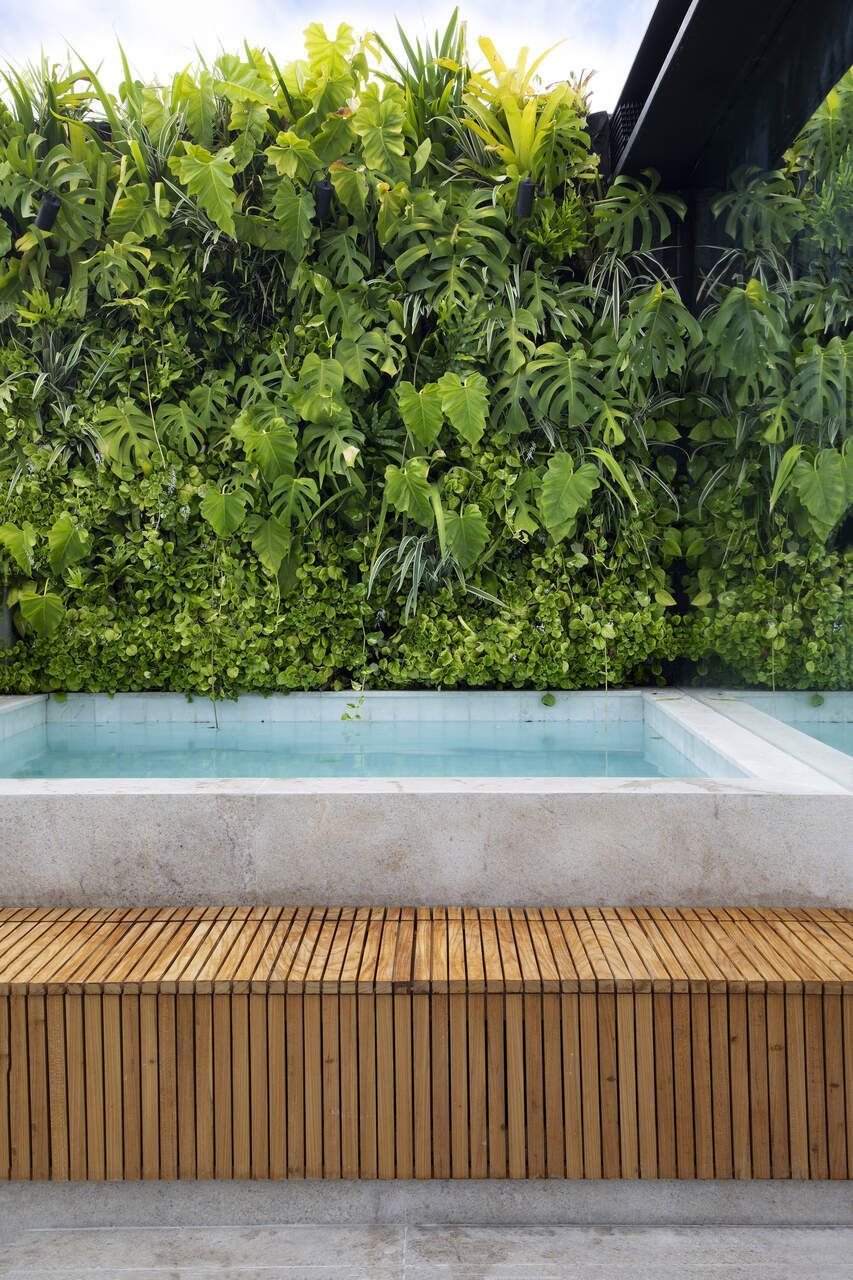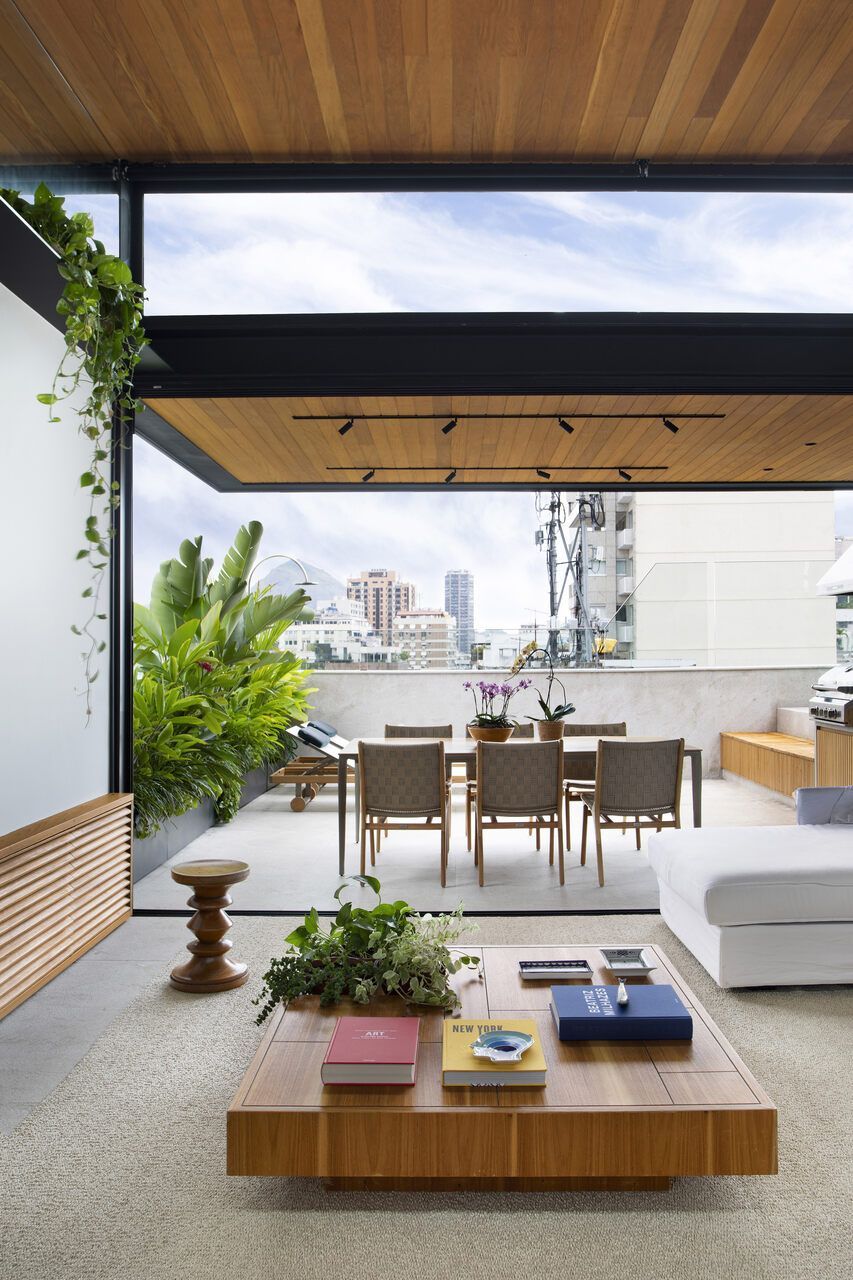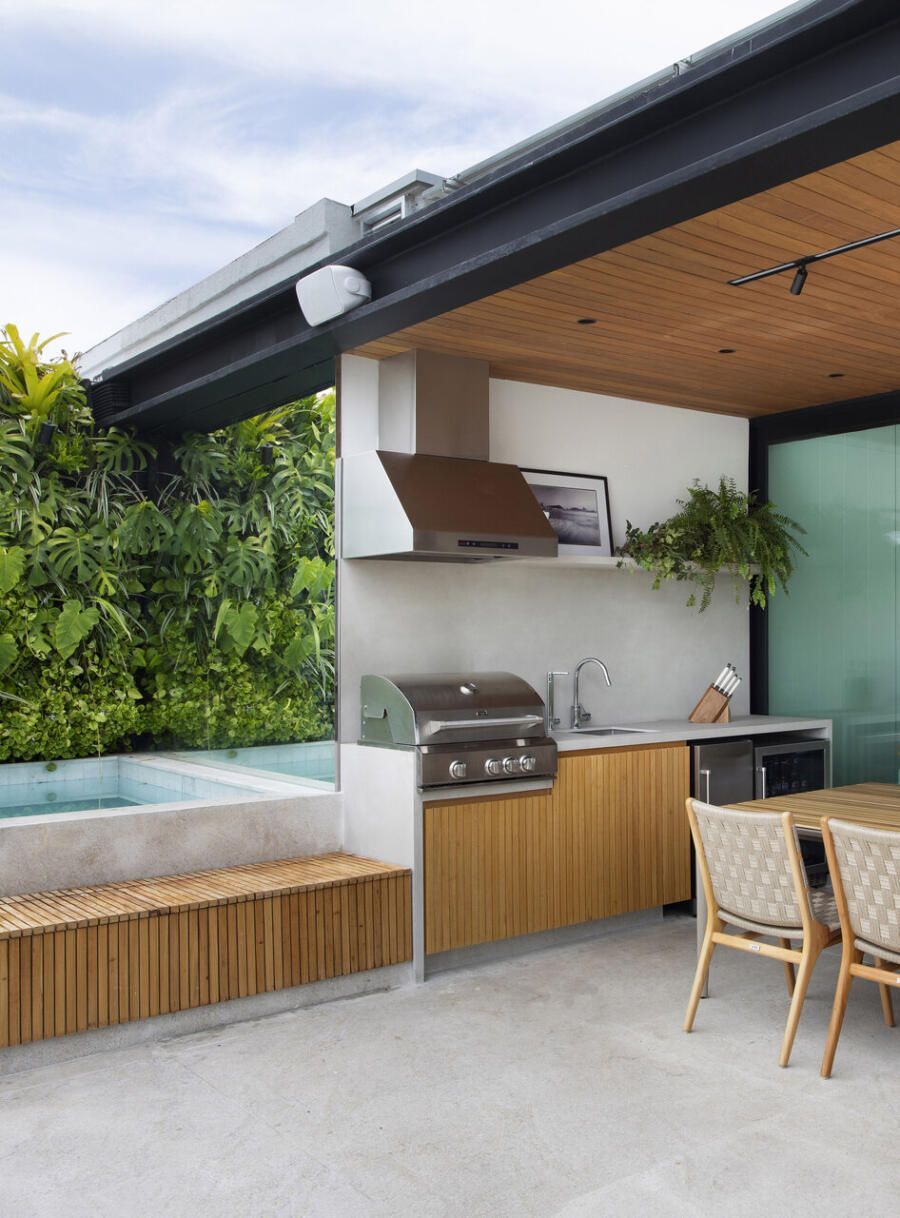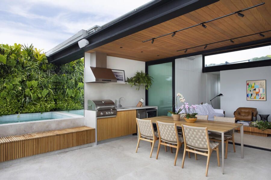 A área externa da cobertura também recebeu atenção especial. O paisagismo foi planejado para criar um clima de bem-estar, com mais privacidade para os momentos de lazer em família ou entre amigos. A escolha das plantas e a forma como foram posicionadas ajudam a compor um ambiente tranquilo, que funciona como uma extensão da casa.