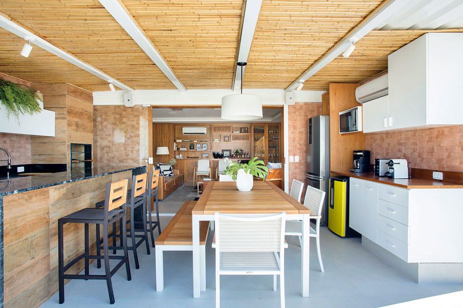 Foi criada uma varanda gourmet climatizada, que se tornou o ambiente mais disputado da casa. Esta nova área também pode ser integrada tanto à área externa como ao family room, que concentra a função de estar, home theater e bar.
