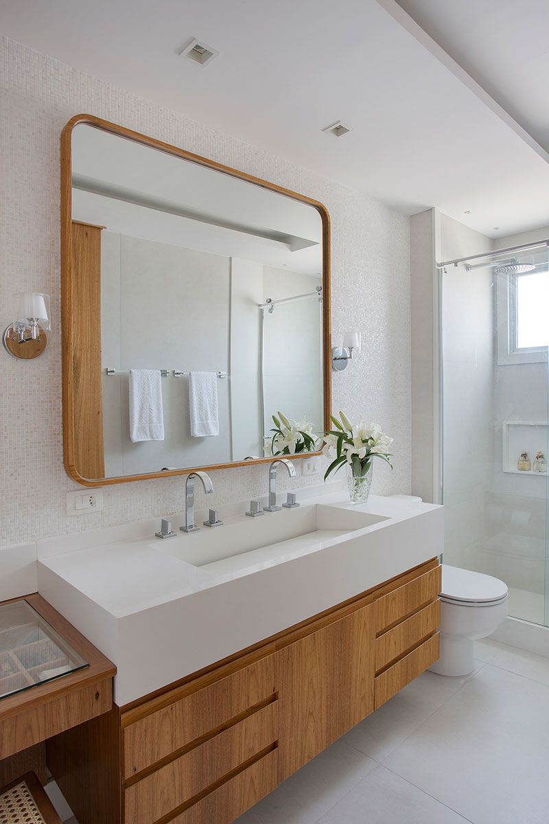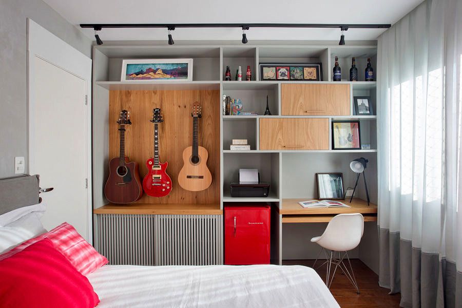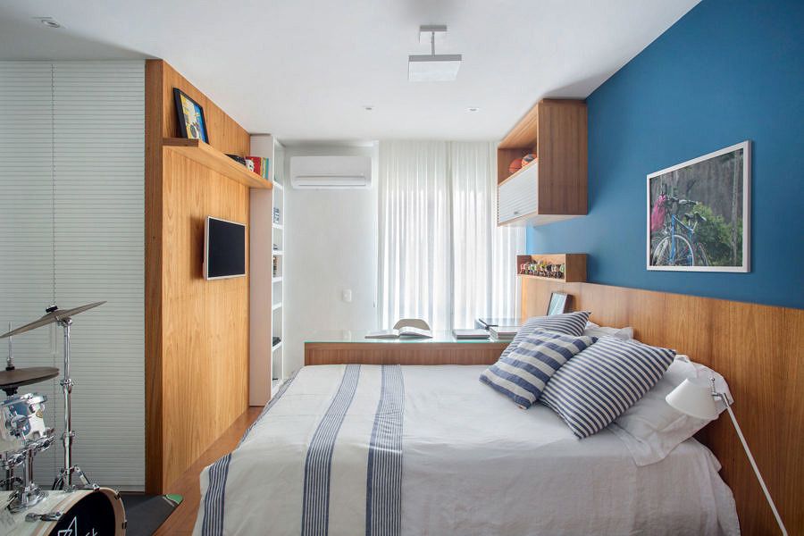 O closet do suíte do casal foi eliminado para aumentar o banheiro, que ganhou espaço para acomodar uma penteadeira e um armário embutido com função de rouparia. No mesmo pavimento, o quarto de empregada também foi demolido para aumentar tanto a área de serviço como o quarto do filho, agora com espaço para acomodar sua bateria.