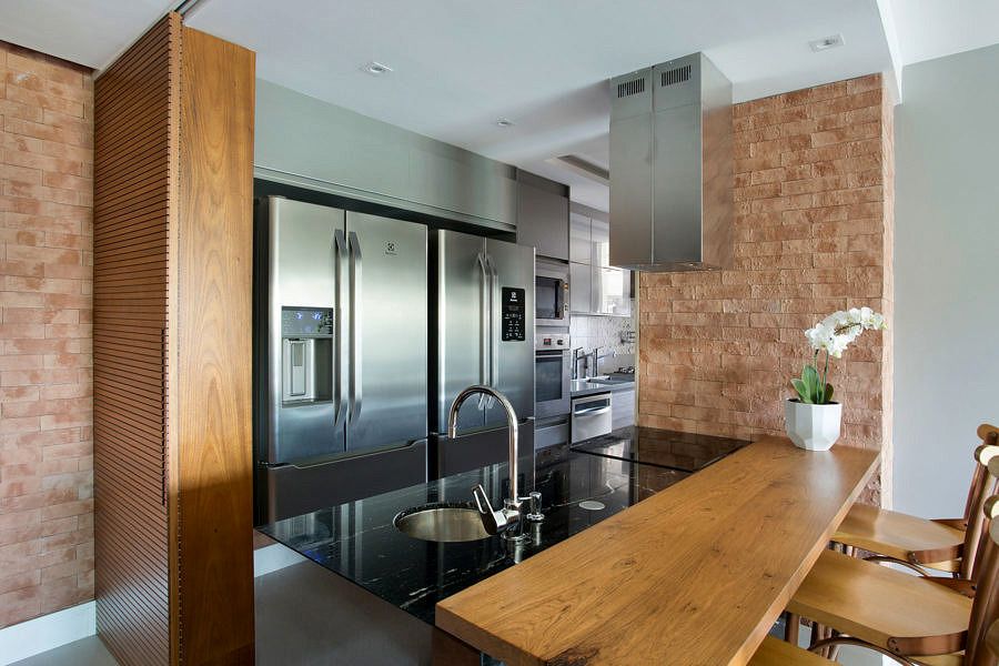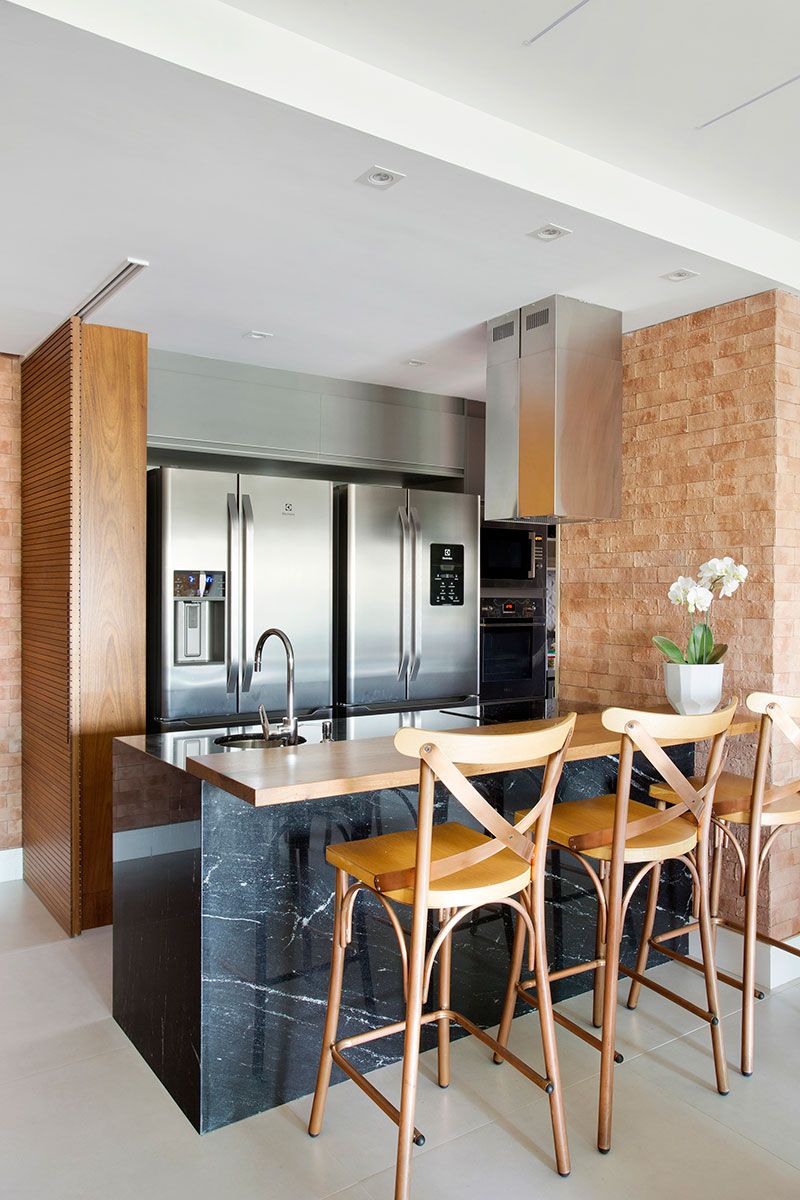 A pedido da moradora, que adora cozinhar para os amigos, no primeiro pavimento, foi criada uma cozinha em ilha aberta para a sala, porém preservando ao lado dela a cozinha principal para uso no dia a dia.