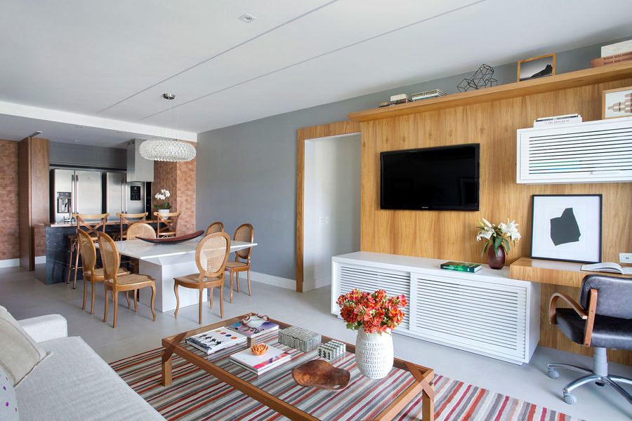 A decoração tem estilo contemporâneo e atemporal com base neutra, em tons de cinza e off white, pontuada por cores nos detalhes, como objetos, tapetes e quadros. A marcenaria foi desenhada pela profissional para otimizar cada cantinho.