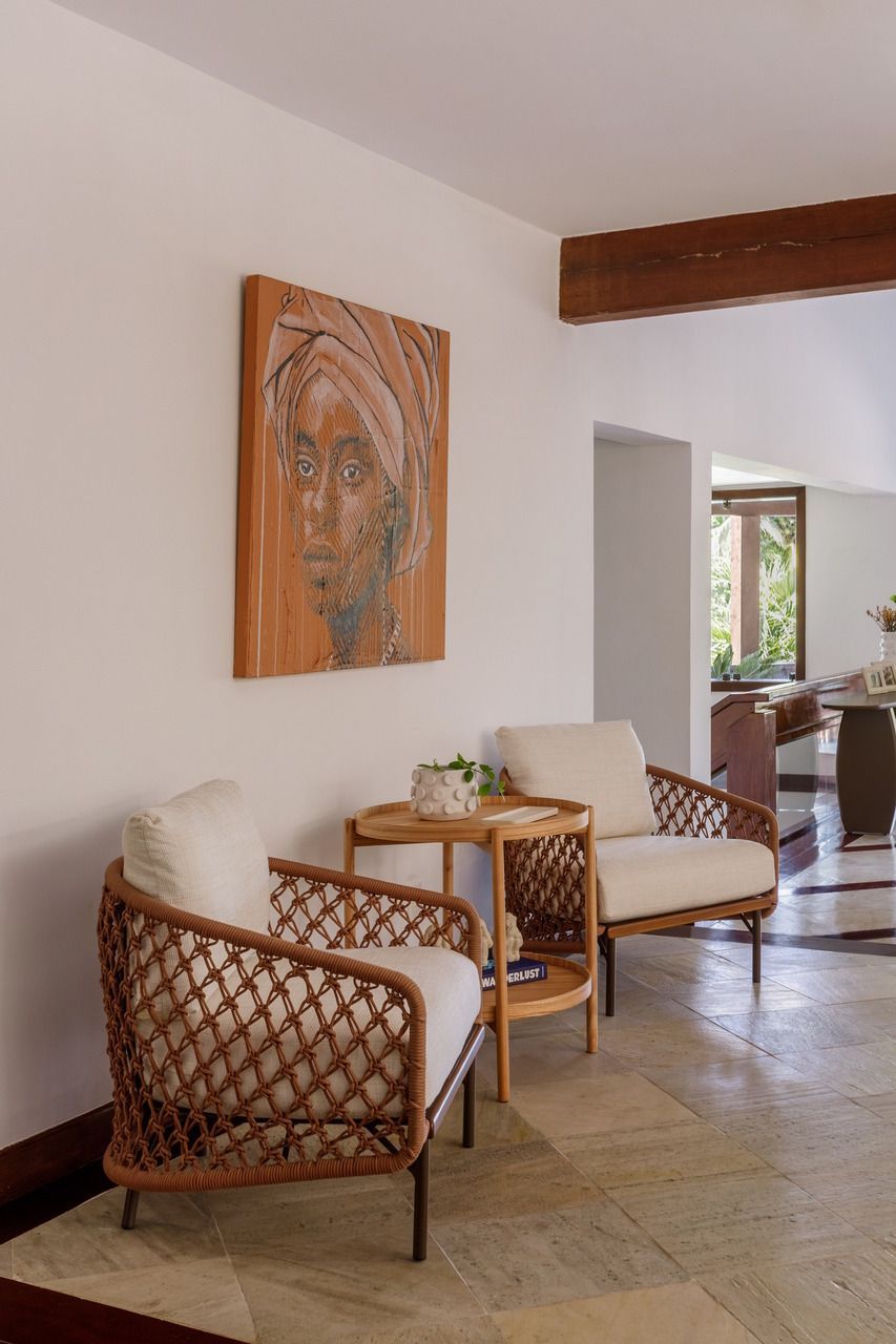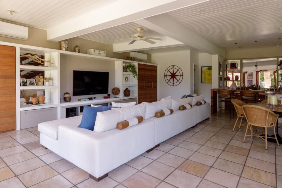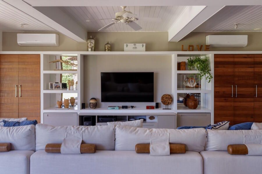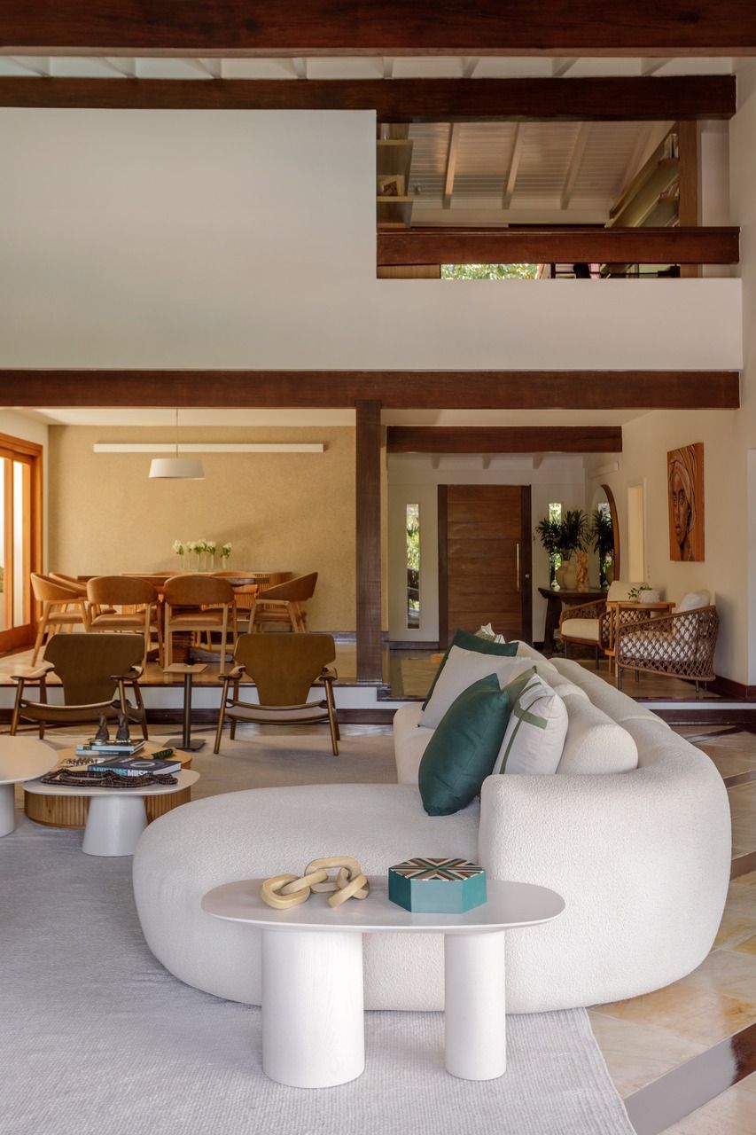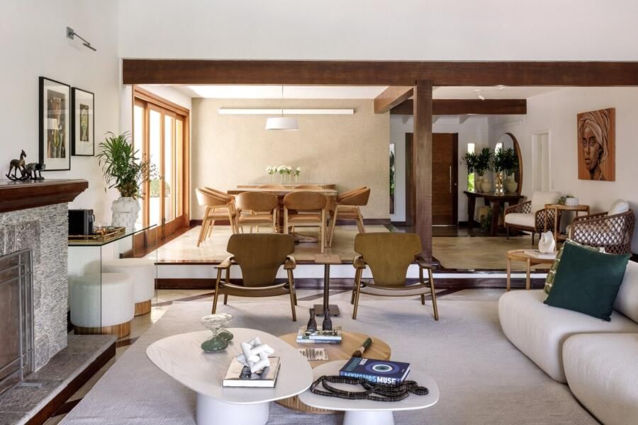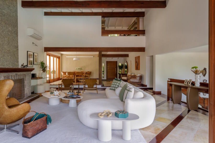 Na área social, as mudanças foram principalmente estéticas. A maior parte dos móveis foi mantida, incluindo peças de design como as poltronas Egg, de Arne Jacobsen, e Diz, de Sergio Rodrigues. Mas foram incluídos novos itens como o sofá Moove, de Victor Leite, as mesas de centro, o aparador, as cadeiras de jantar e tapetes. A mudança no layout permitiu ainda criar um ambiente de leitura e um hall de entrada.