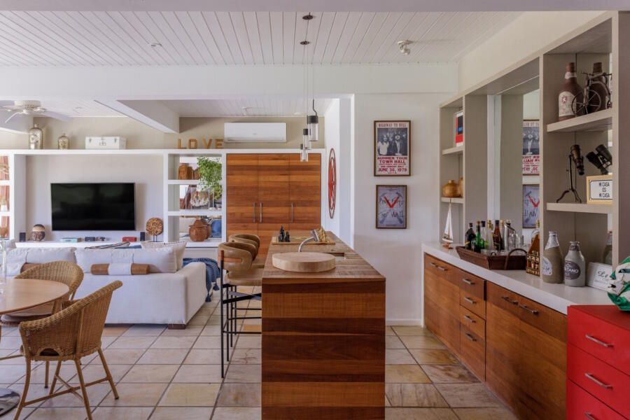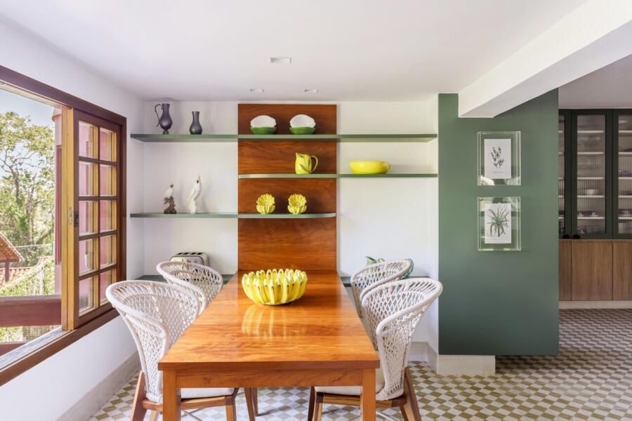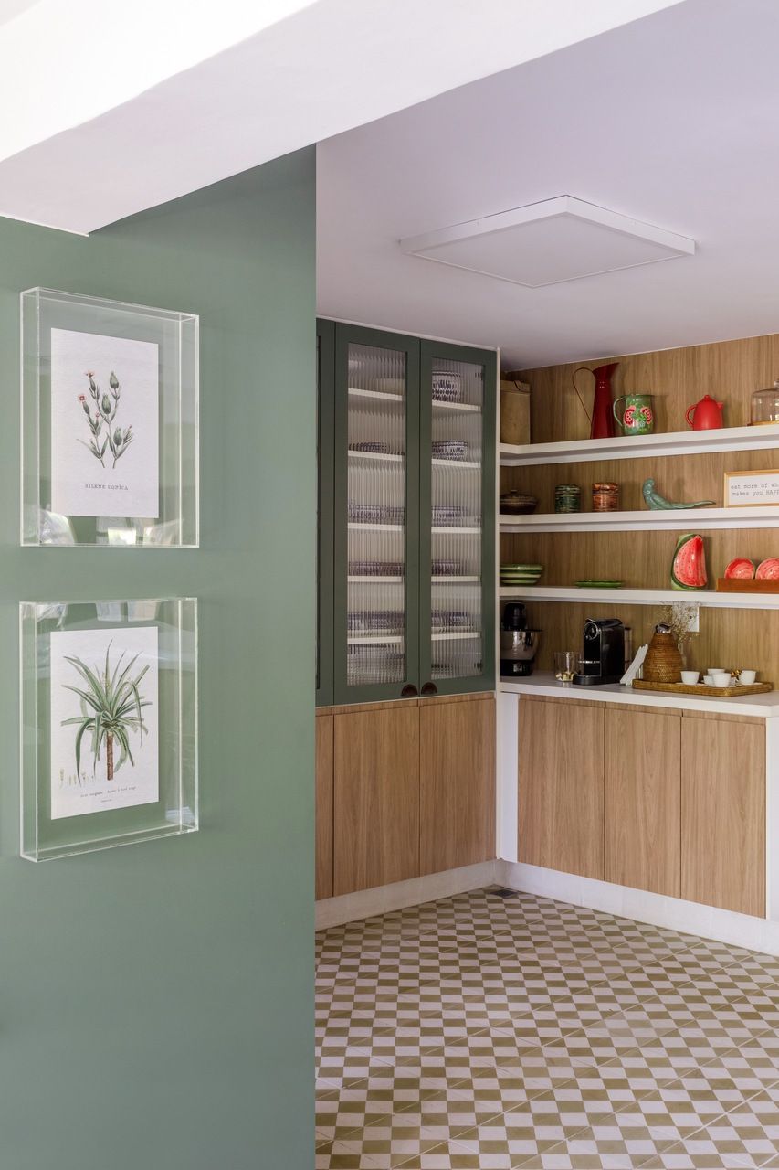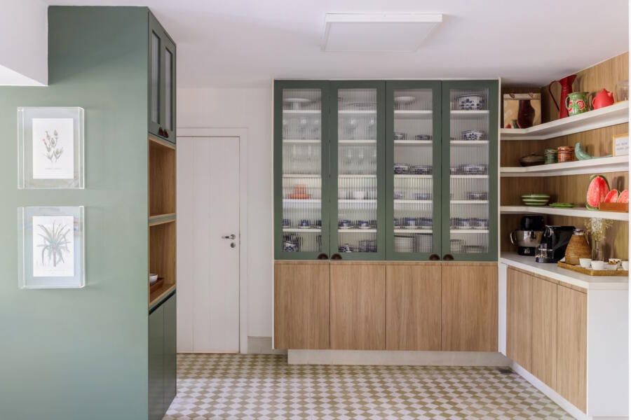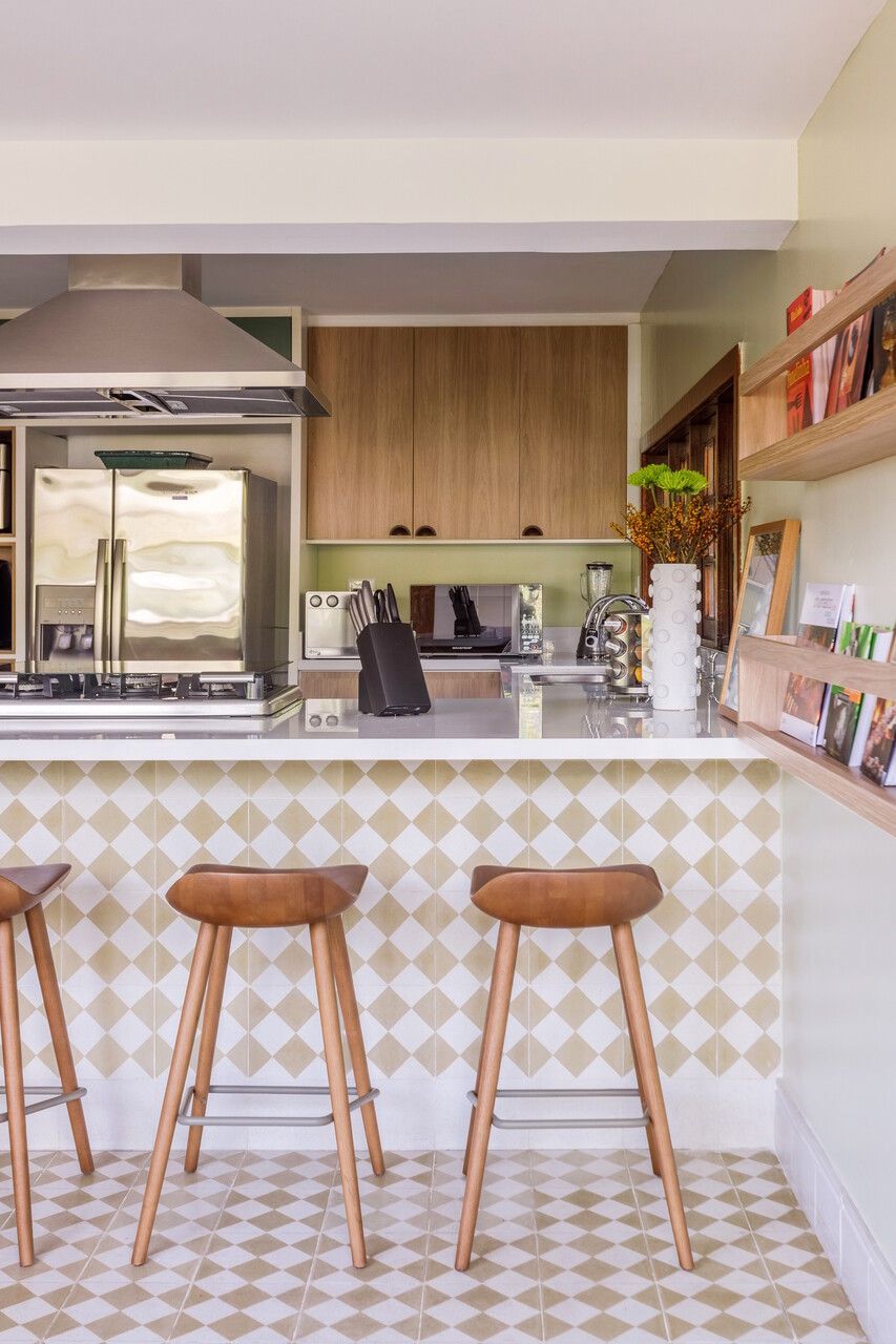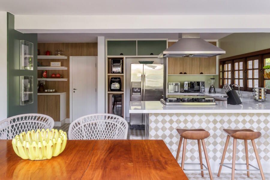 Como a planta do imóvel não sofreu alterações, a marcenaria foi uma das grandes aliadas para o sucesso da transformação. Na cozinha, além de criar mais espaços de armazenamento, os armários existentes ganharam tons de freijó e verde acinzentado. Também foram escolhidas novas banquetas para o balcão e cadeiras para a mesa da copa. O projeto de iluminação garantiu um toque especial e charmoso para o ambiente.