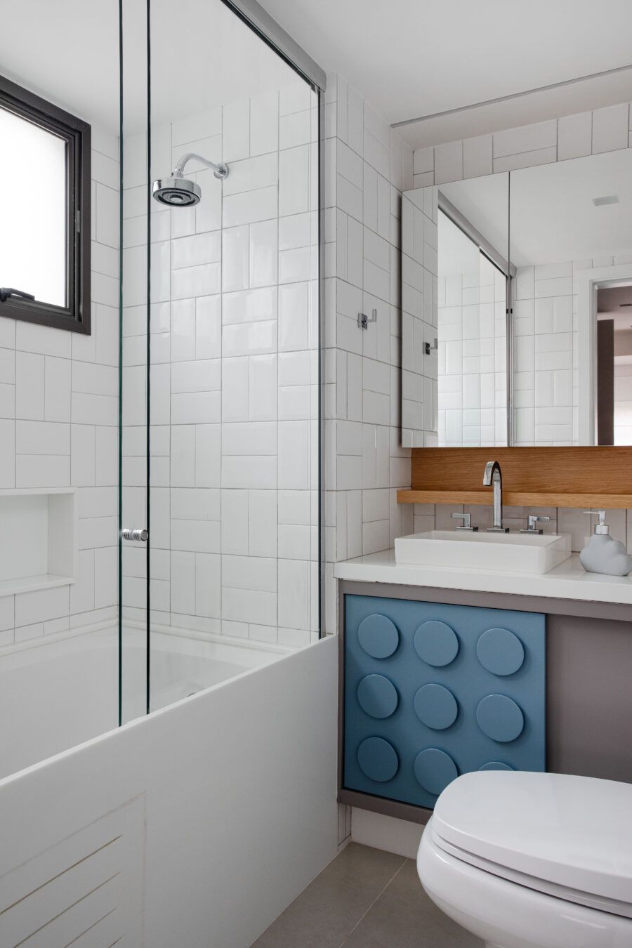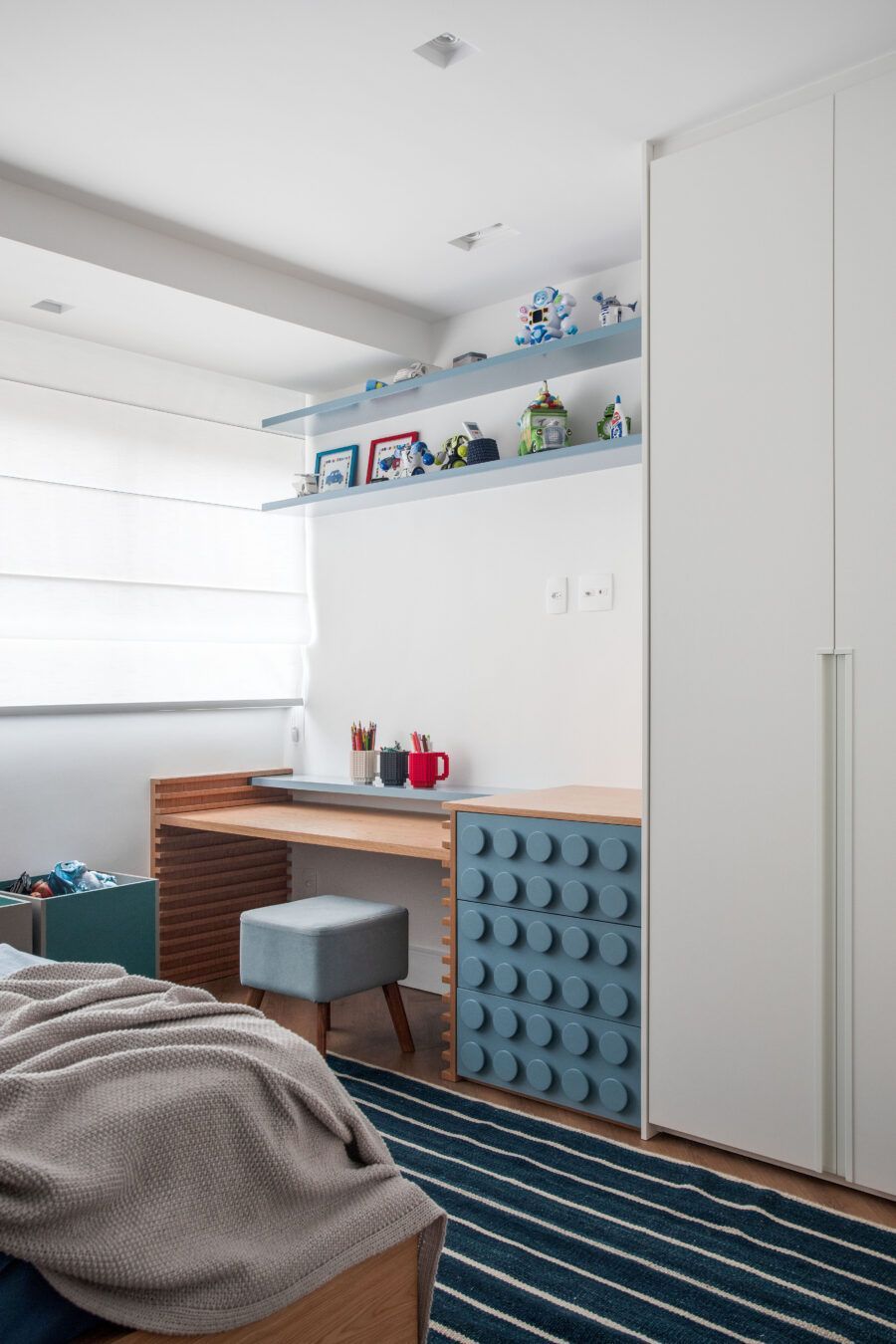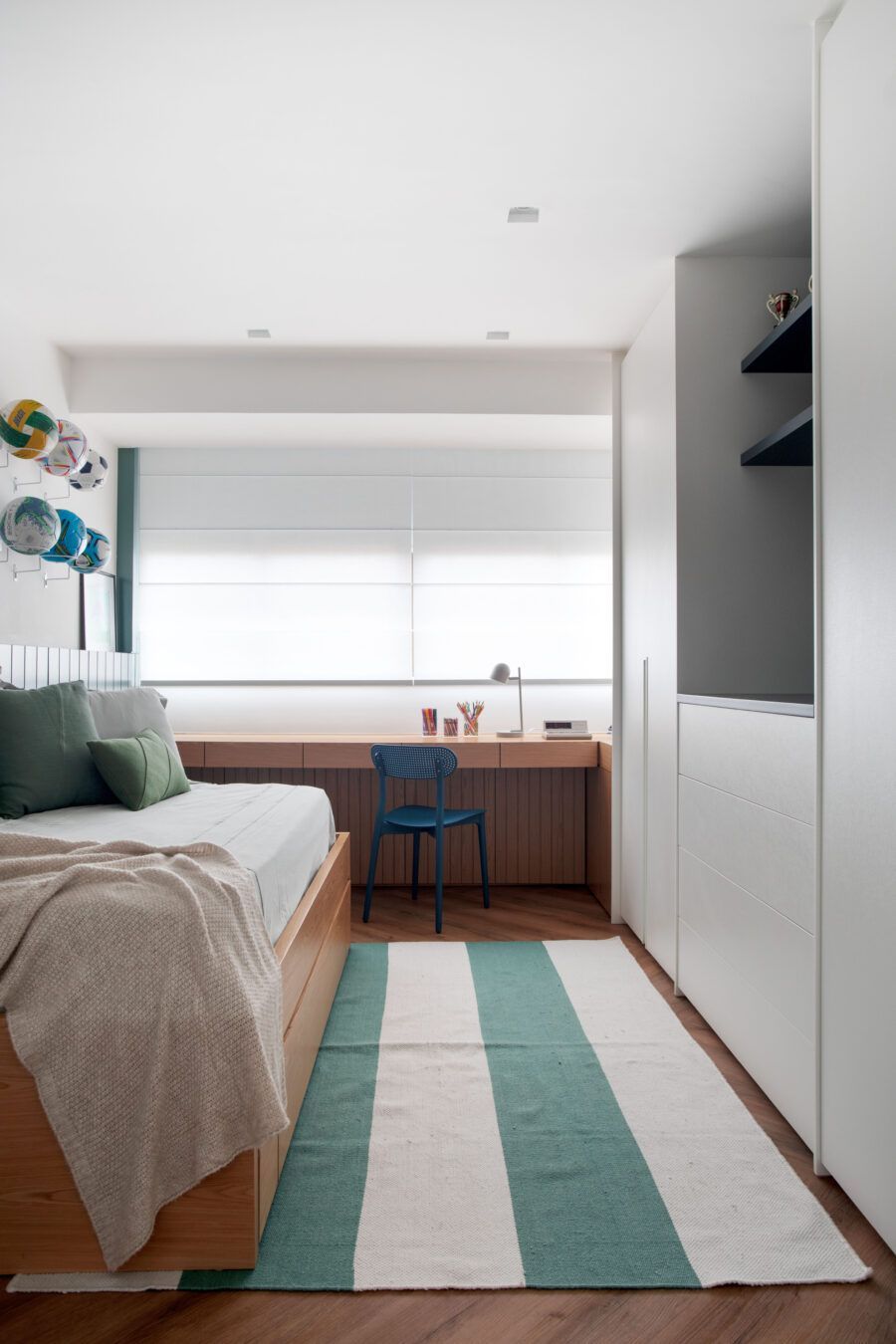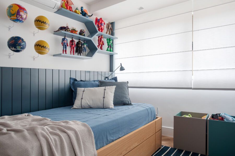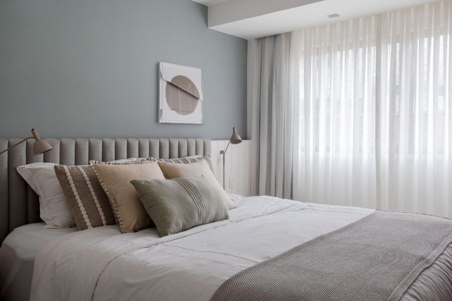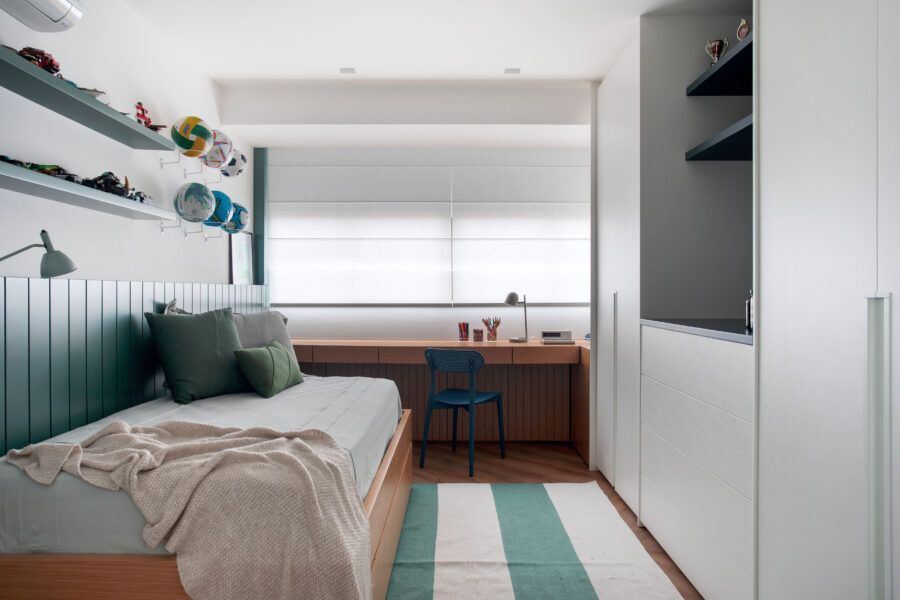 A arquiteta destaca ainda que um grande desafio do projeto foi reformar a área íntima. Como os clientes precisavam de três suítes, a deles e uma para cada filho, Gabriela Campos eliminou o banheiro social para ampliar a suíte master, que ganhou um closet, e redistribuiu os espaços para criar as outras duas suítes.