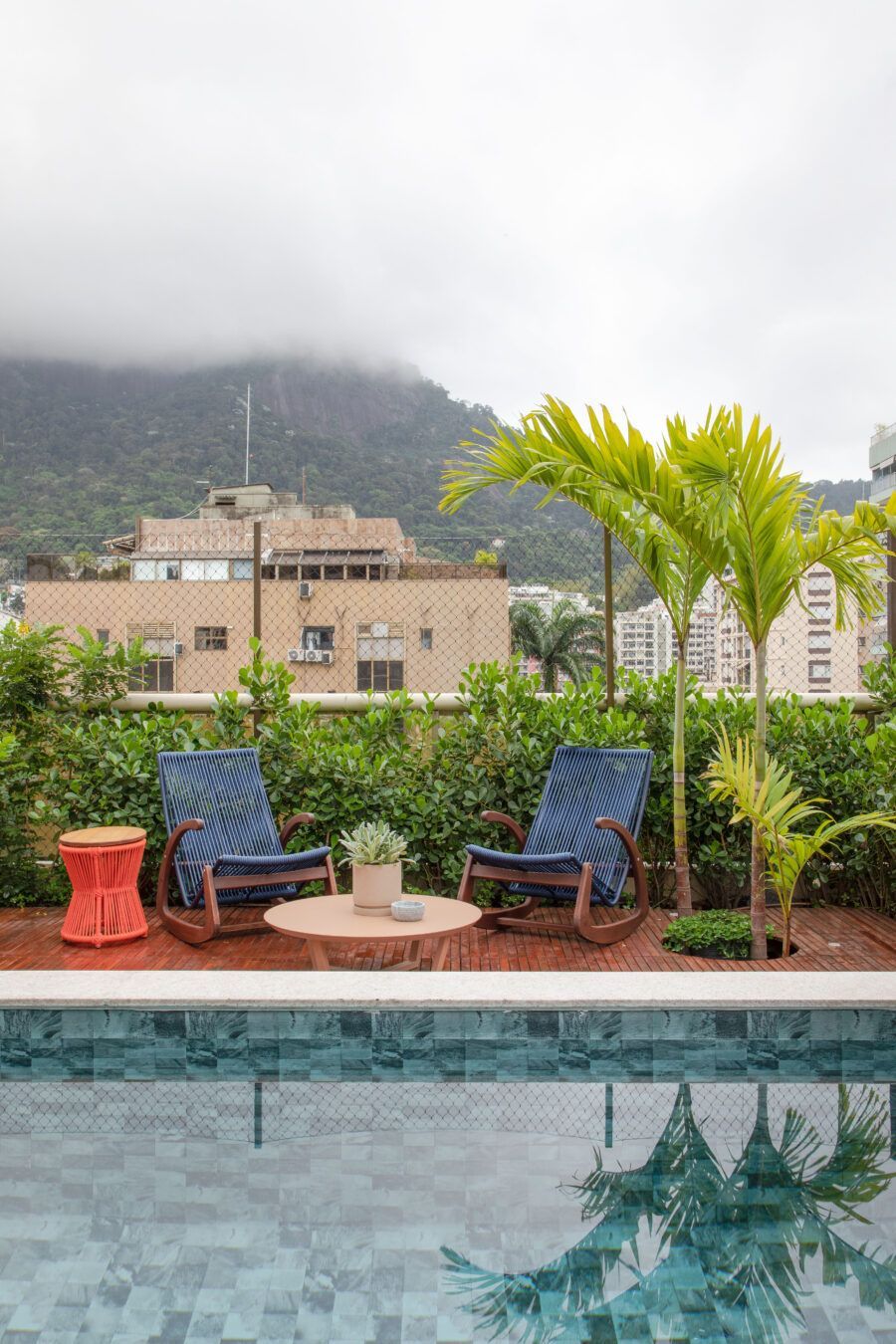 Na reforma, a arquiteta trocou o piso do apartamento inteiro, colocando porcelanato no setor social e de serviço e piso laminado com a paginação em espinha de peixe no setor íntimo. Na área externa, a piscina e o deck foram reformados e uma sauna que não existia foi criada.
