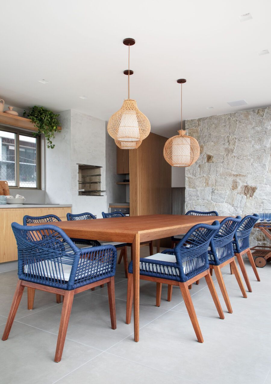 “Eles queriam criar espaços amplos, integrados e confortáveis no andar inferior para receber amigos e familiares, deixando a área íntima mais reservada, com as três suítes dos moradores, a sala de TV que também funciona como brinquedoteca dos filhos e o escritório. Já o segundo andar deveria concentrar a área de lazer, com espaço gourmet, piscina e sauna, além de uma suíte para hóspedes.”