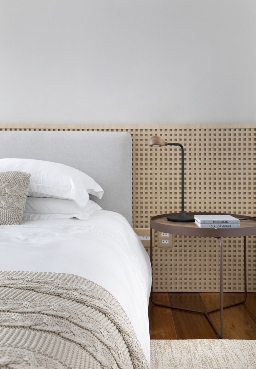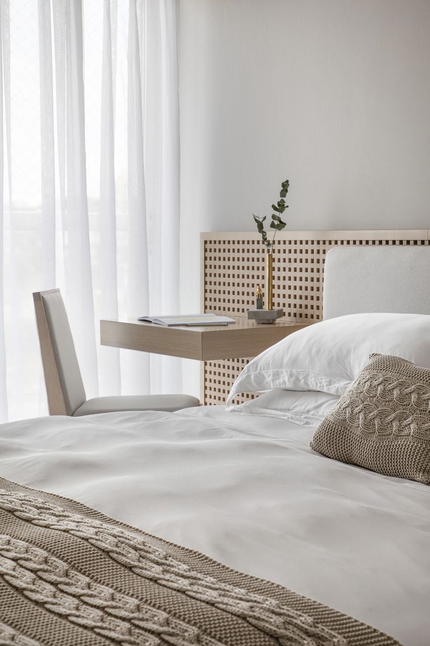 No quarto principal, a leveza domina. A cama em tons neutros, combinada a mesas de cabeceira discretas, cria um ambiente perfeito para descanso. Já o quarto de hóspedes surpreende com um painel de muxarabi, que adiciona textura e charme ao ambiente.