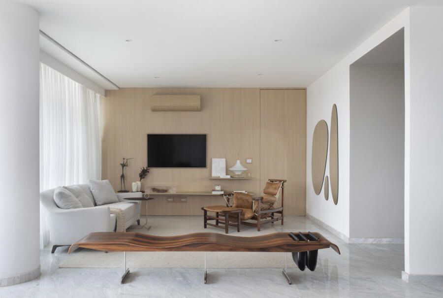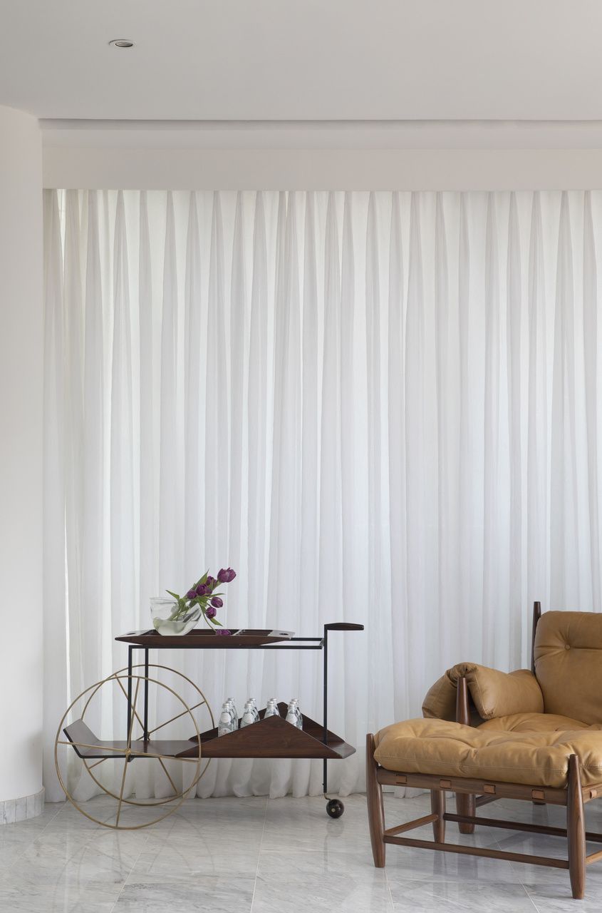 A sala de estar é o verdadeiro coração do projeto. Com paredes, teto e cortinas em tons claros, o espaço se transforma em uma tela neutra que valoriza os móveis escolhidos a dedo pelo casal. Peças de antiquário e móveis vintage trazem o calor da madeira e a riqueza dos detalhes artesanais.