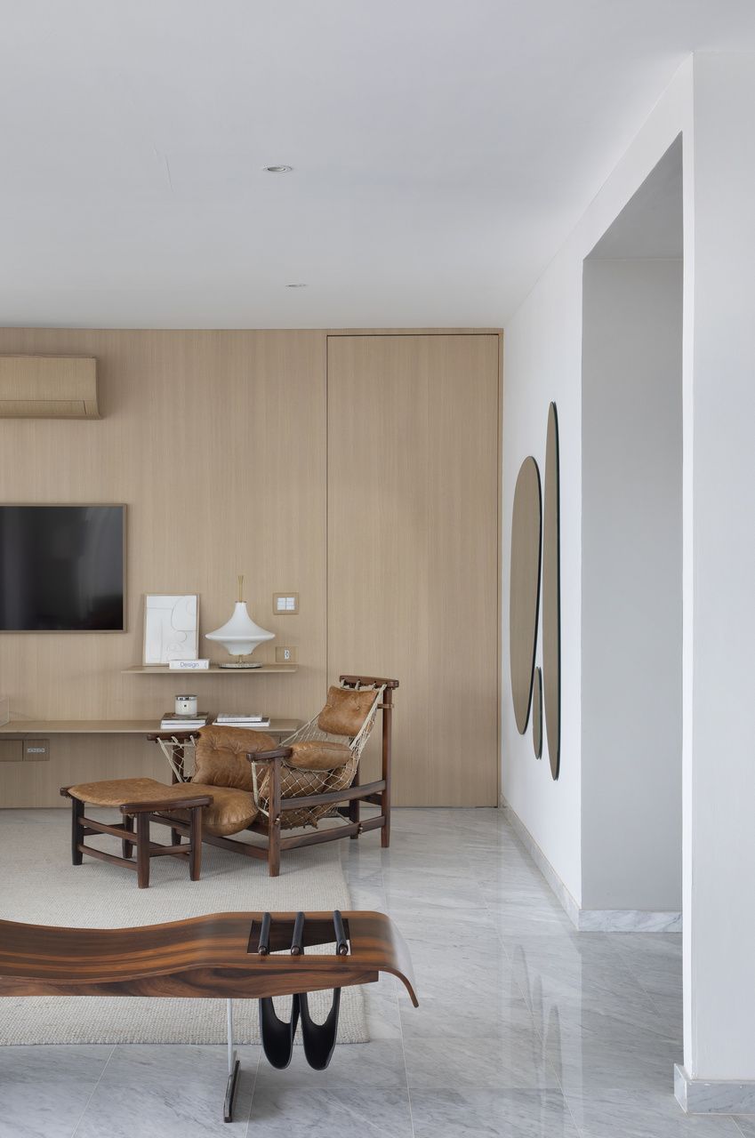 Um dos pontos mais importantes do projeto foi a restauração dos elementos originais. O piso em mármore nas áreas sociais e o piso de madeira nas áreas íntimas foram totalmente recuperados, respeitando a história do apartamento.