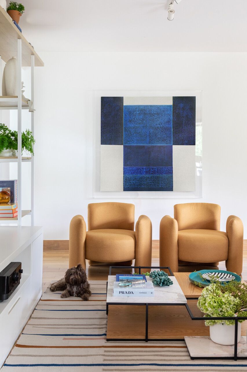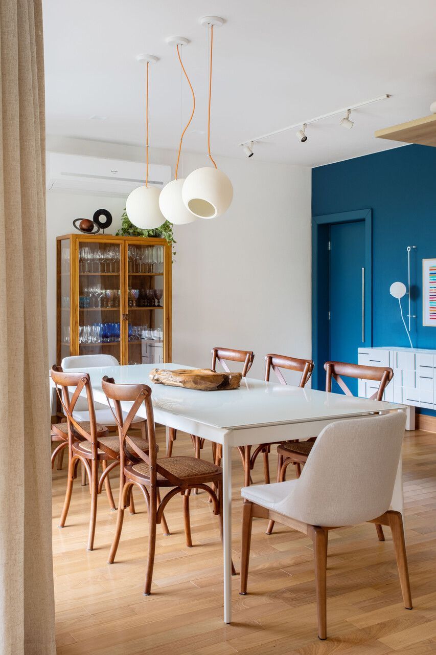 A decoração contemporânea se encaixa com a personalidade dos proprietários, e boa parte do mobiliário já pertencia ao acervo dos clientes. Dentre as novidades, as poltronas C221 e C224 da Carbono Design e buffet azulejado da RicMelo Design, de autoria de um dos arquitetos.