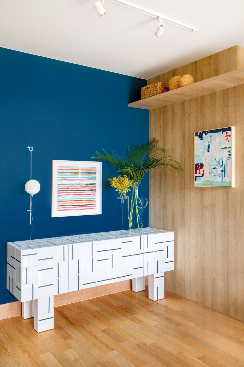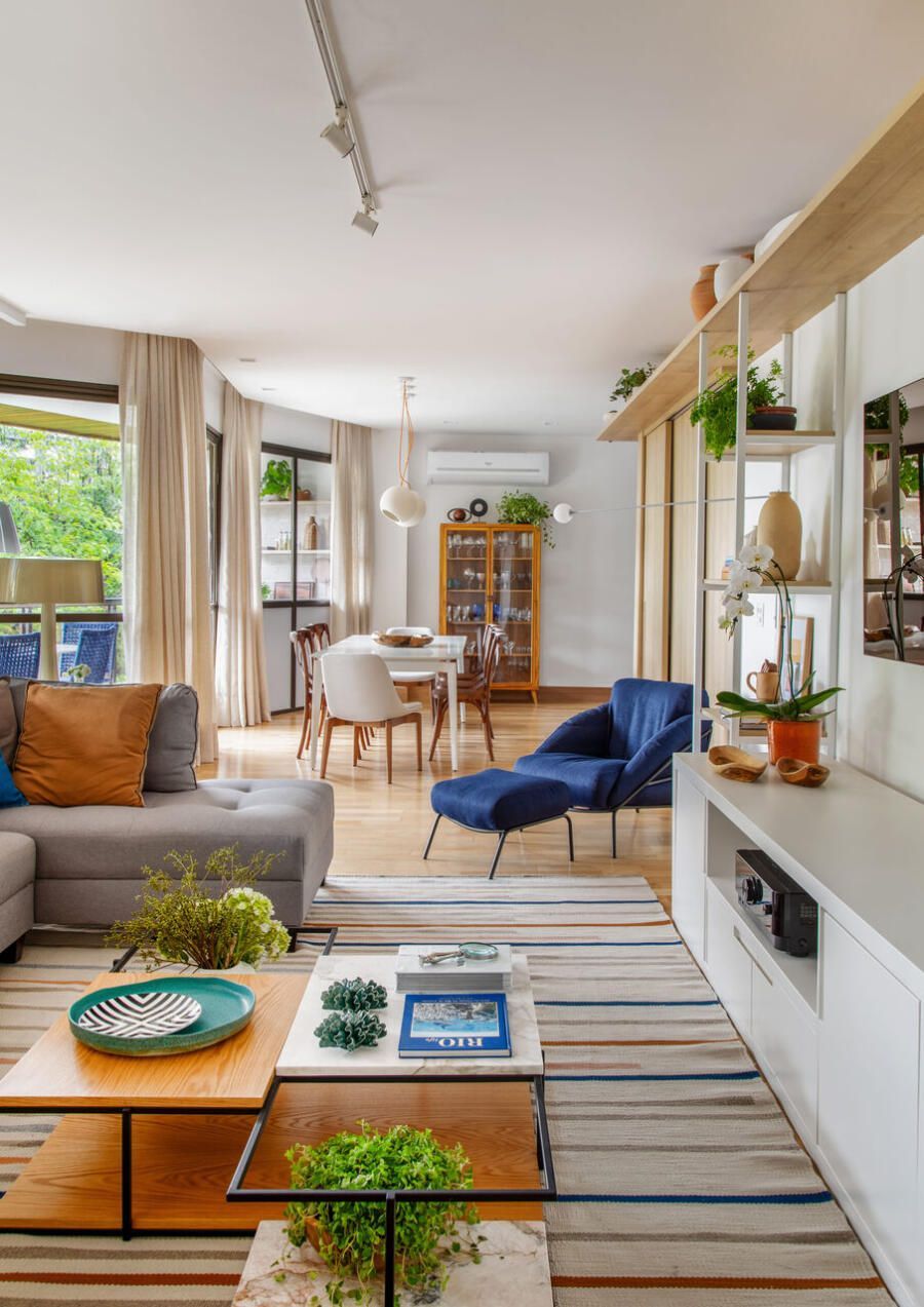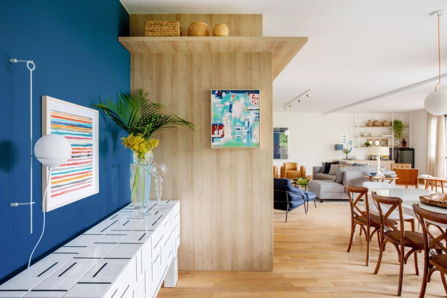 A fim de criar um clima aconchegante de casa, os arquitetos apostaram em uma paleta predominantemente composta por tons suaves em azul e ocre. Além disso, a madeira tem destaque no projeto, presente tanto no piso de tauari natural quanto no acabamento das marcenarias.