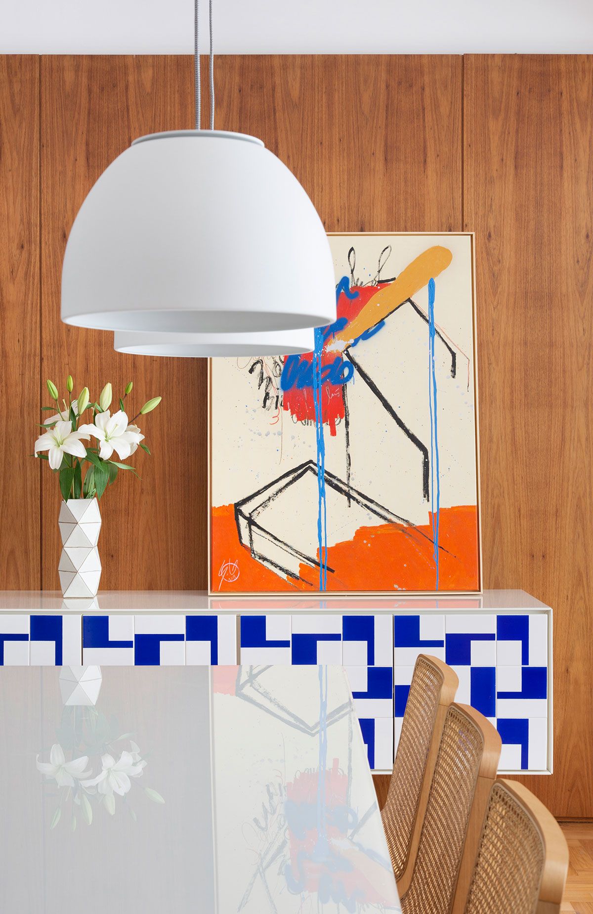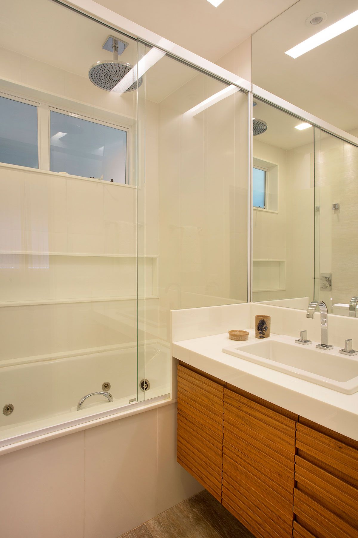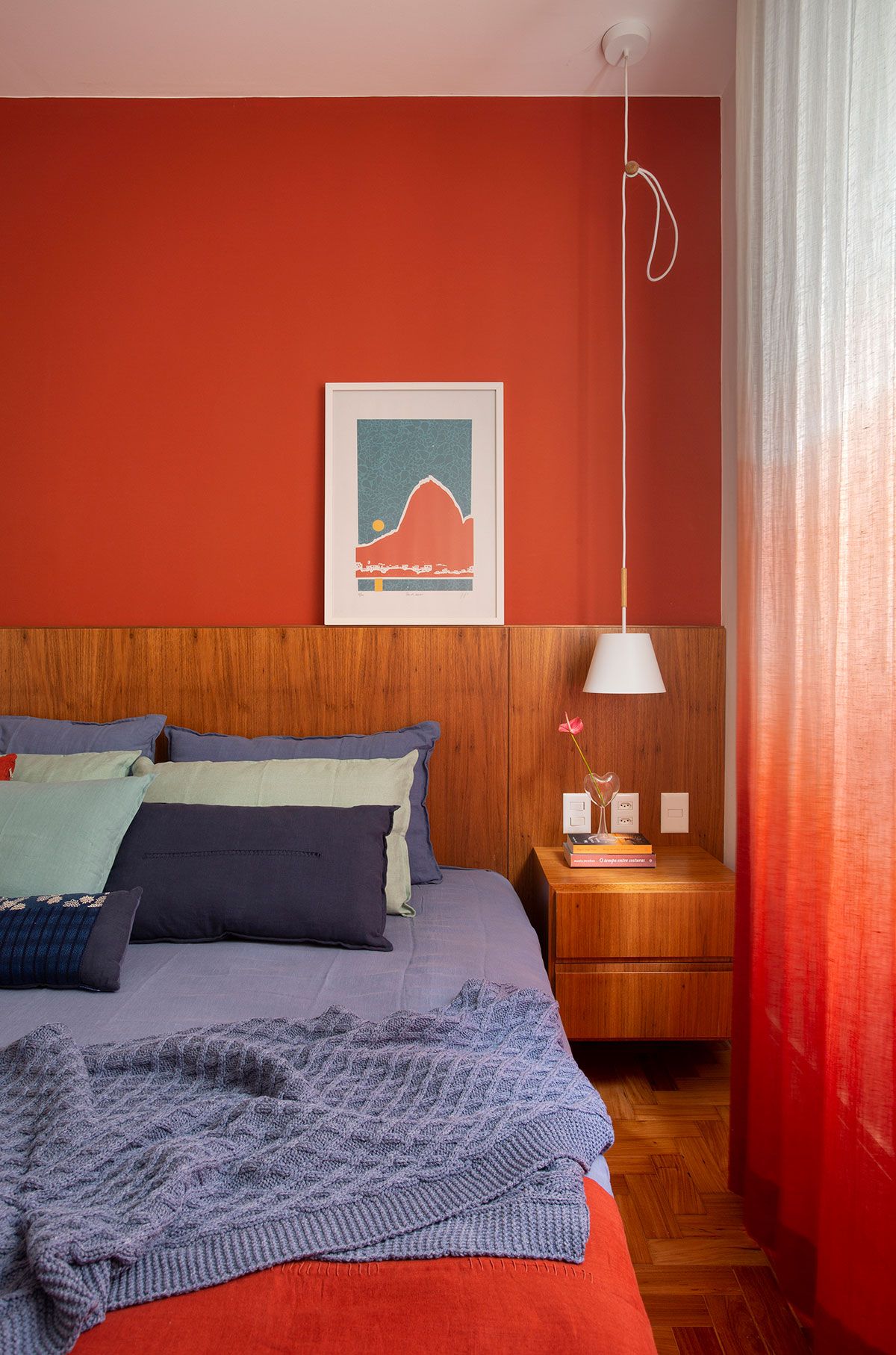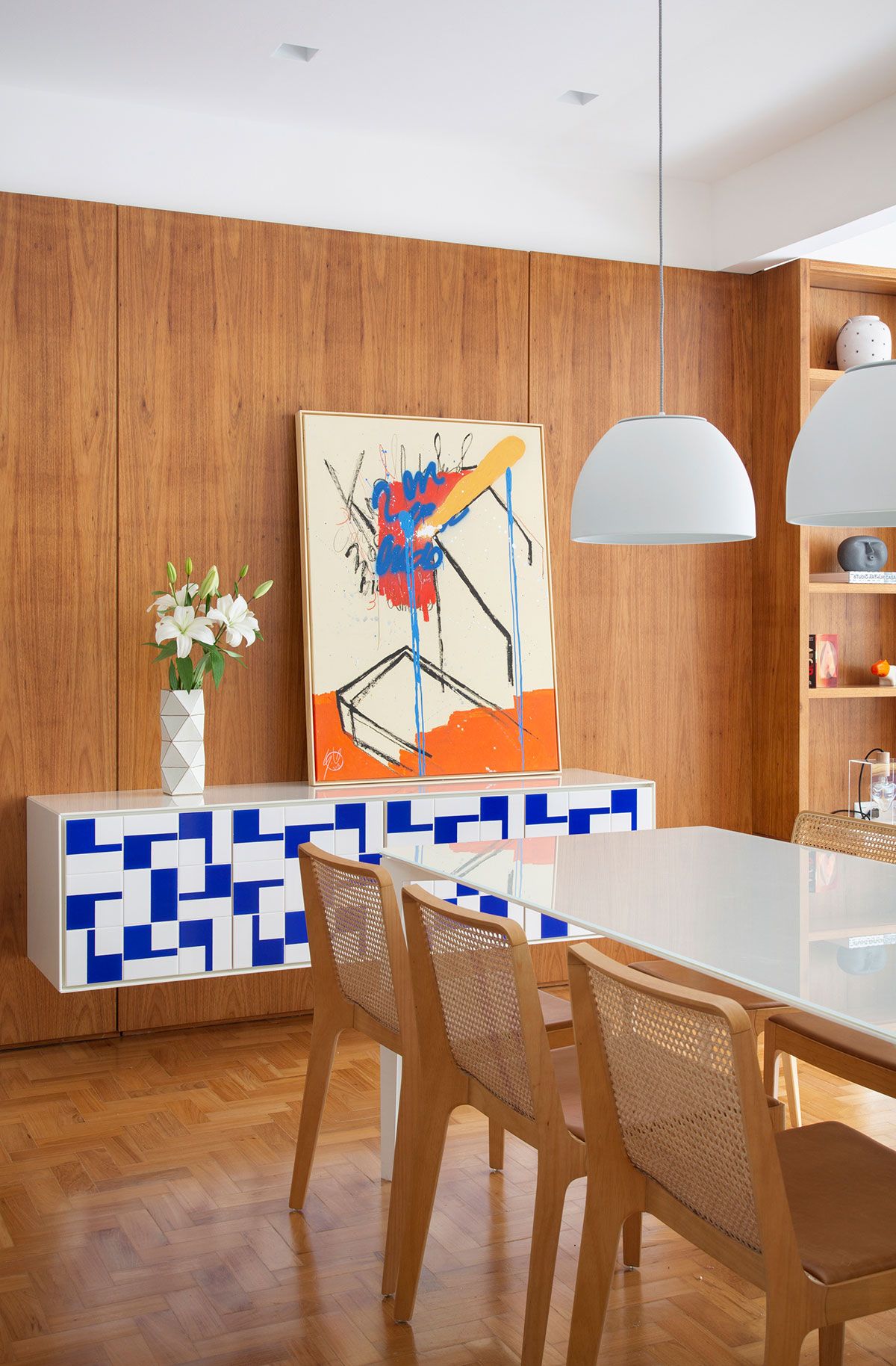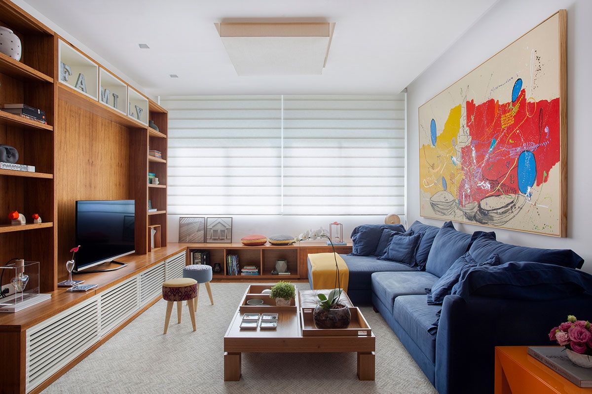 Desde o início, o casal solicitou as designers uma marcenaria bem planejada, sob medida para o imóvel, com destaque para a grande estante de madeira na sala de estar com tv, que se estende sob a janela em forma de banco. Já a parede ao lado do móvel, em frente a mesa de jantar, foi revestida com um painel na mesma madeira até o limite do hall de entrada, trazendo mais aconchego ao espaço e equilíbrio nas proporções da marcenaria.