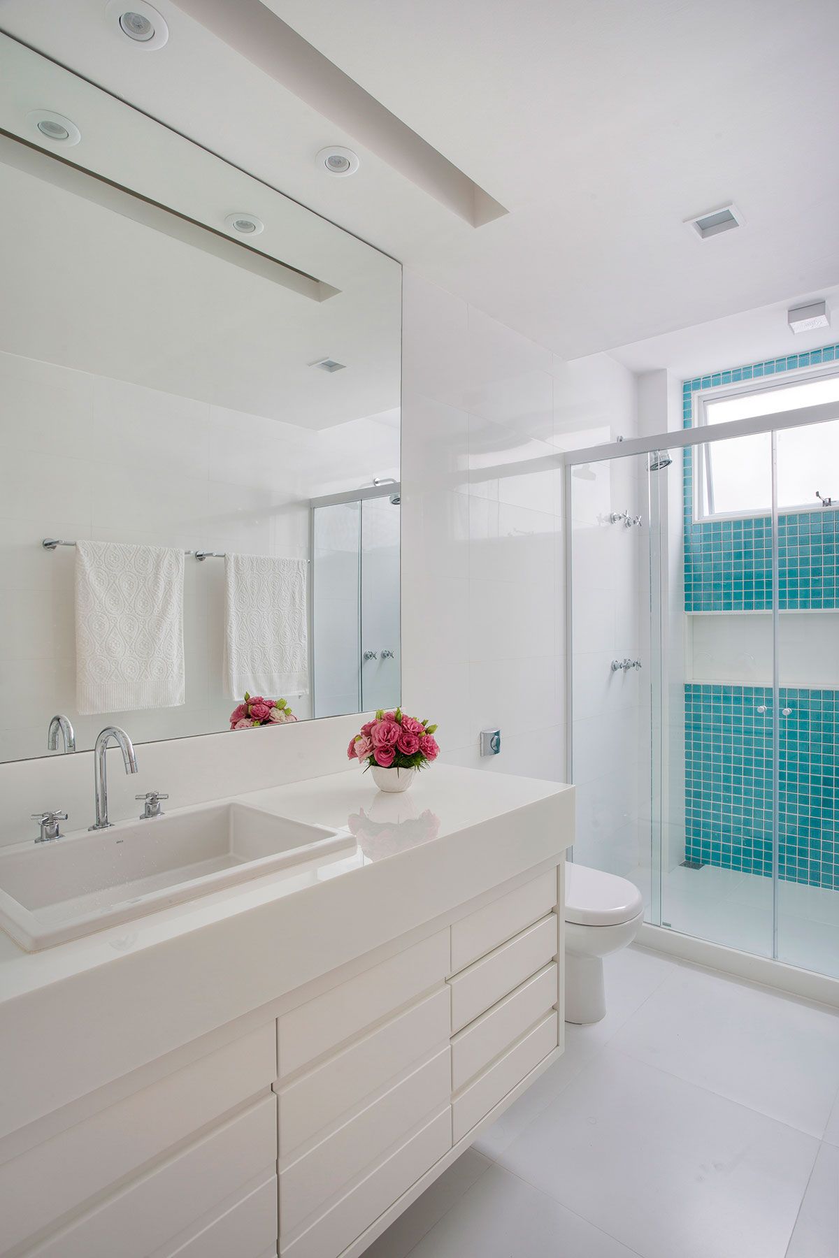 Na nova planta, o quarto de empregada foi transformado no banheiro do casal, que solicitou a inclusão de uma banheira. Já o banheiro do corredor foi ampliado para uso das crianças, incorporando dois chuveiros no box, a pedido da mãe. O vão de acesso ao hall que dá acesso aos quartos foi ampliado ao seu limite máximo, deixando apenas os pilares estruturais.