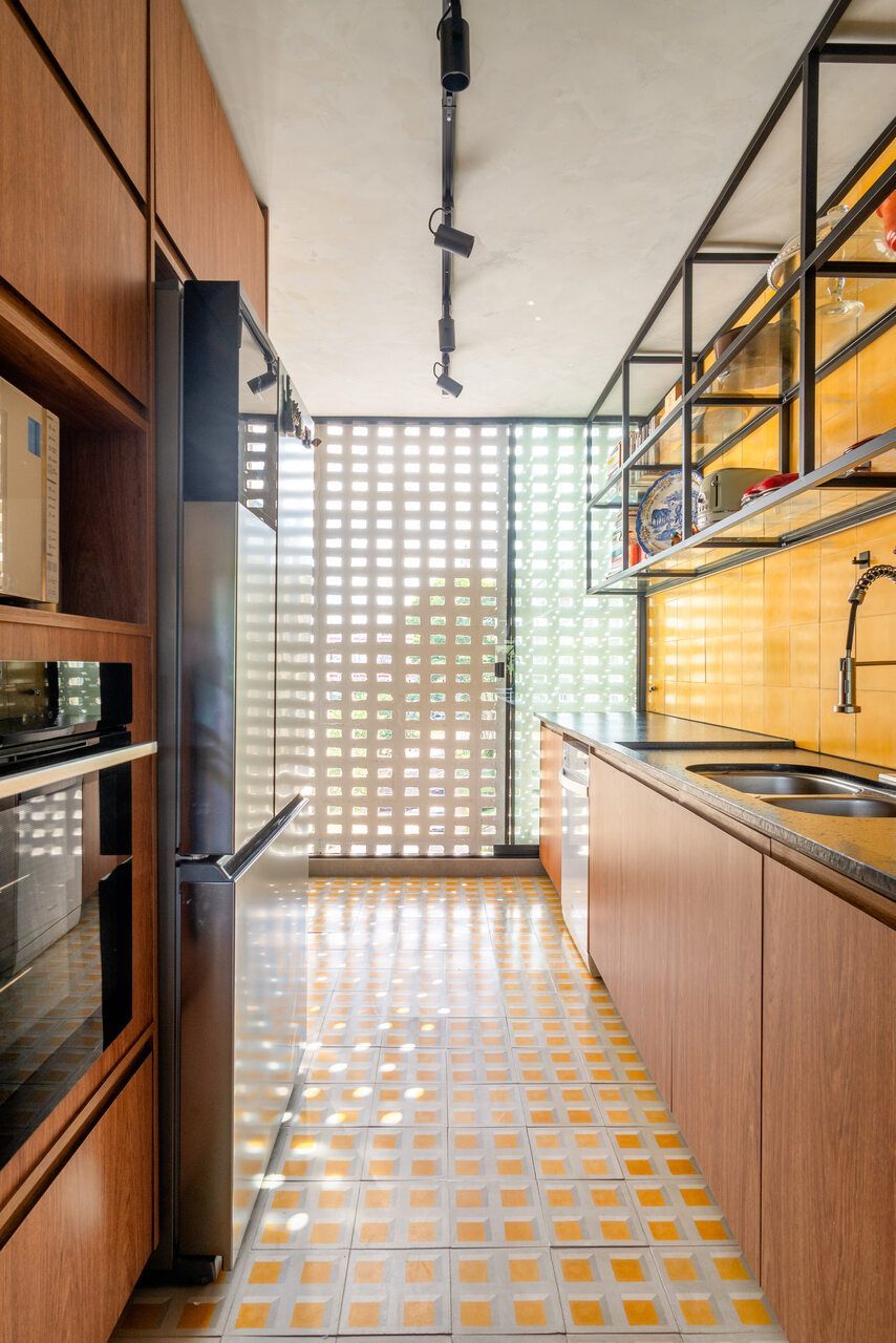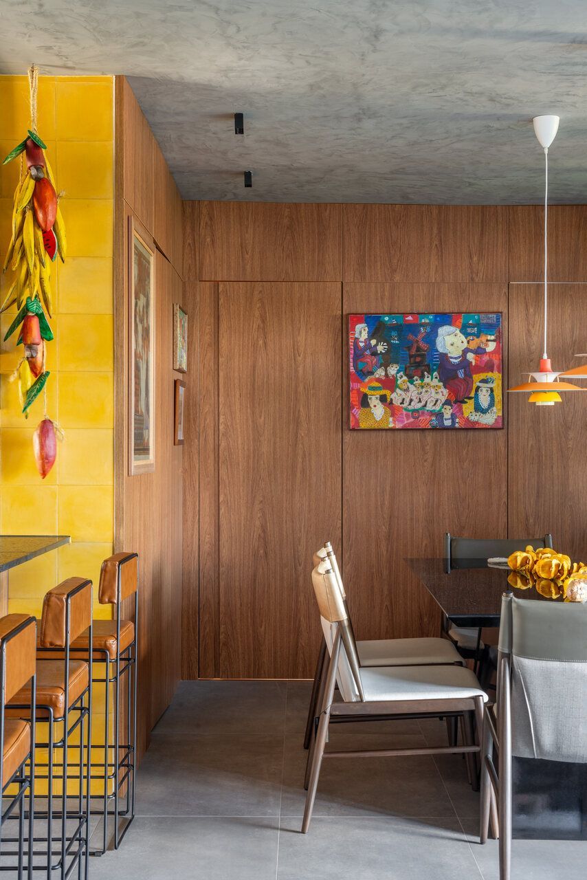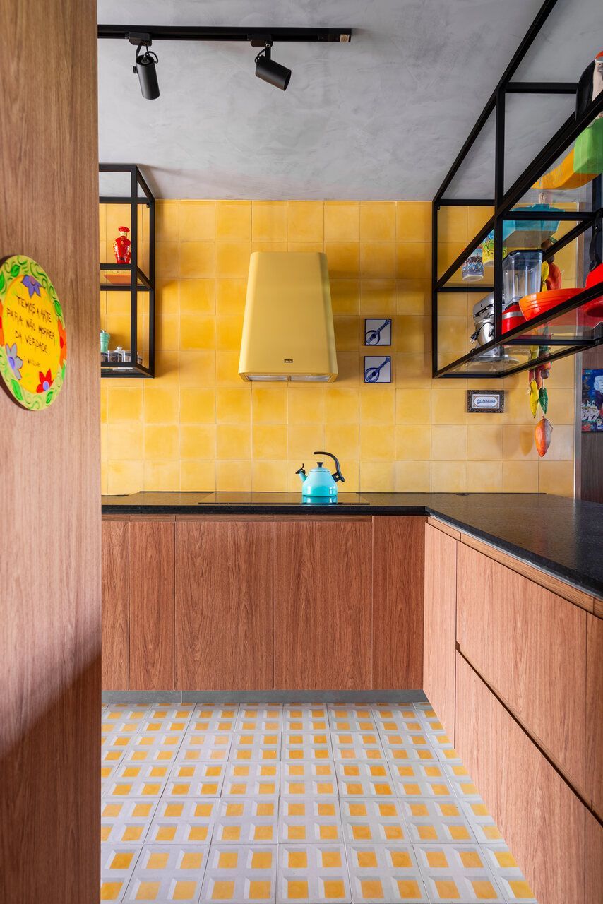 A cozinha ganhou cor com tons de amarelo nas paredes e nos ladrilhos, enquanto os armários em madeira louro freijó trazem aconchego. A lavanderia foi integrada de forma discreta, escondida por painéis próximos à geladeira.