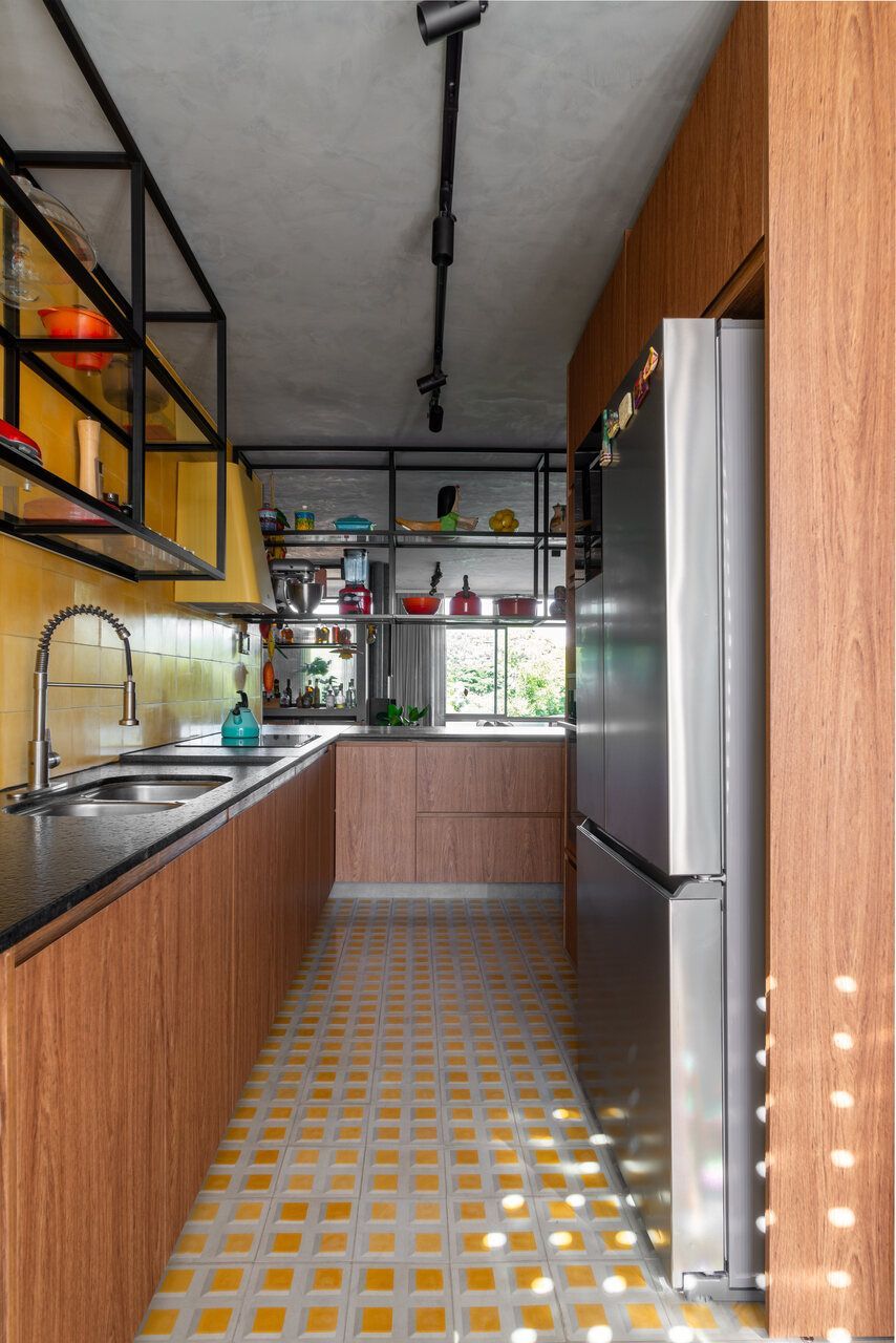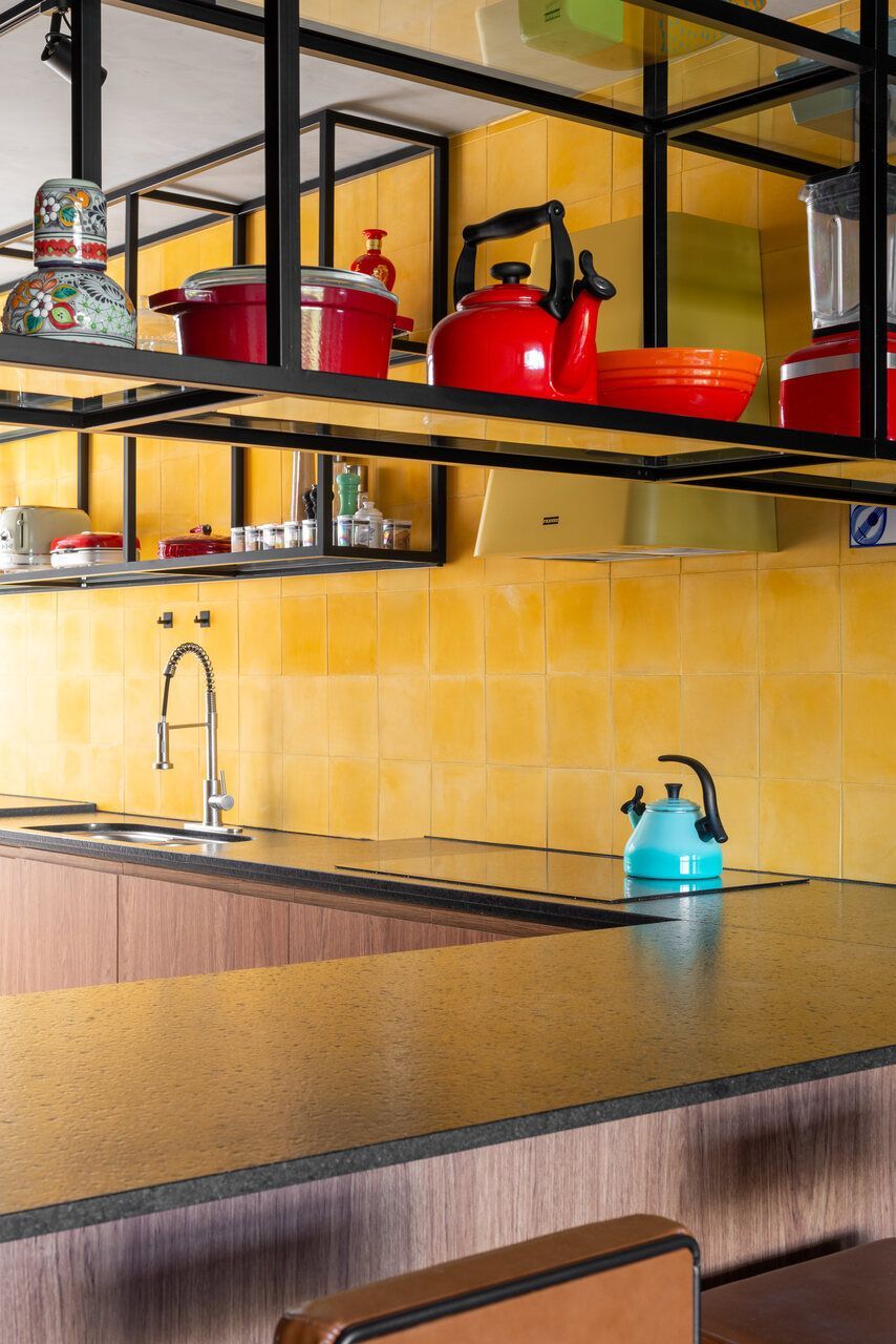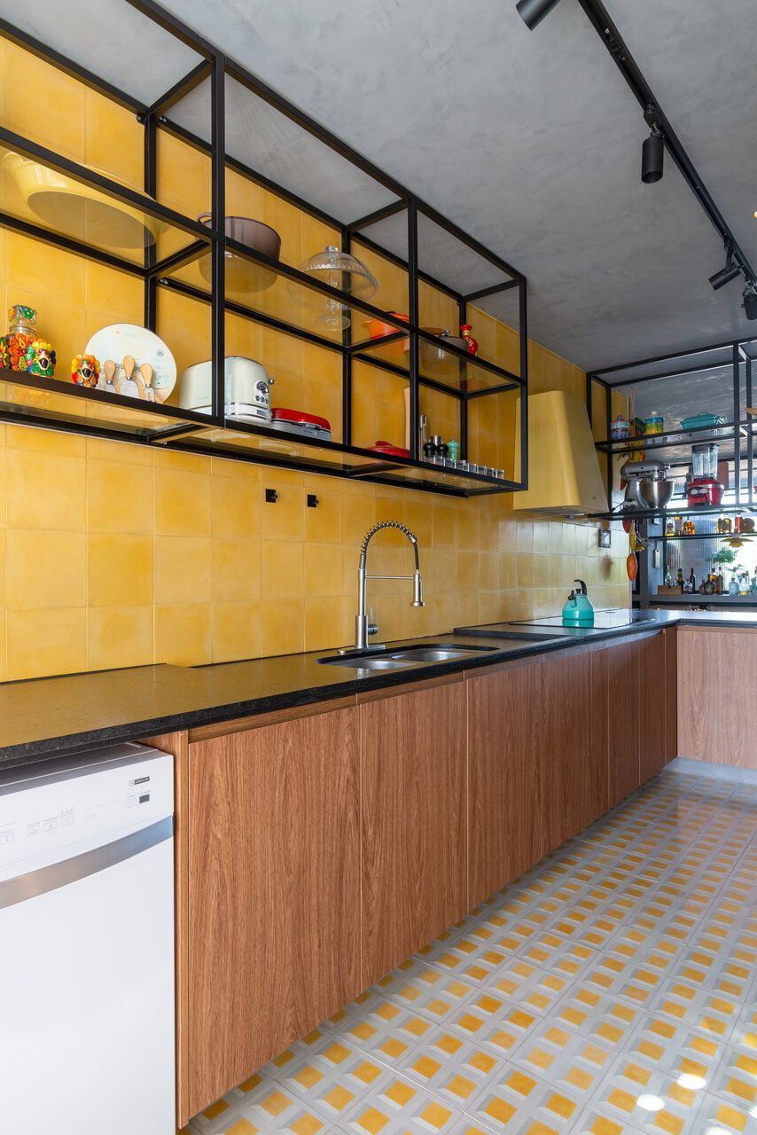 A cozinha ganhou cor com tons de amarelo nas paredes e nos ladrilhos, enquanto os armários em madeira louro freijó trazem aconchego. A lavanderia foi integrada de forma discreta, escondida por painéis próximos à geladeira.