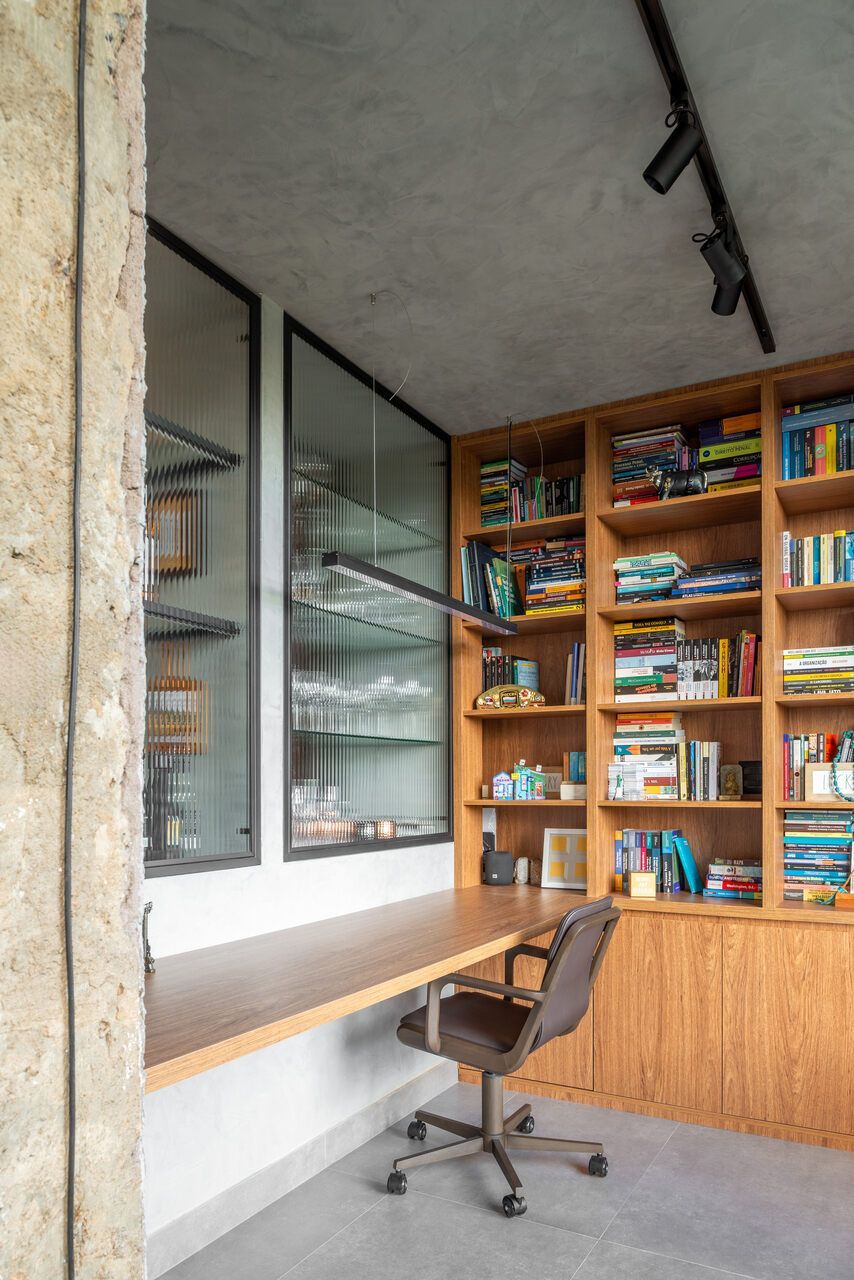 O projeto passou por mudanças importantes no layout original. Um dos quartos foi aberto para criar uma sala de jantar e escritório, o lavabo mudou de lugar, e novos banheiros foram construídos para a suíte master e o quarto de hóspedes. A cozinha e a área de serviço também foram reorganizadas para melhorar a circulação. A integração dos espaços sociais deixou o apartamento mais prático para o dia a dia e para receber visitas.