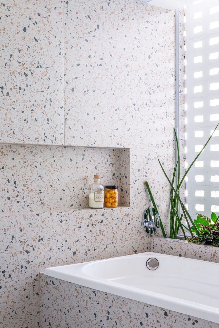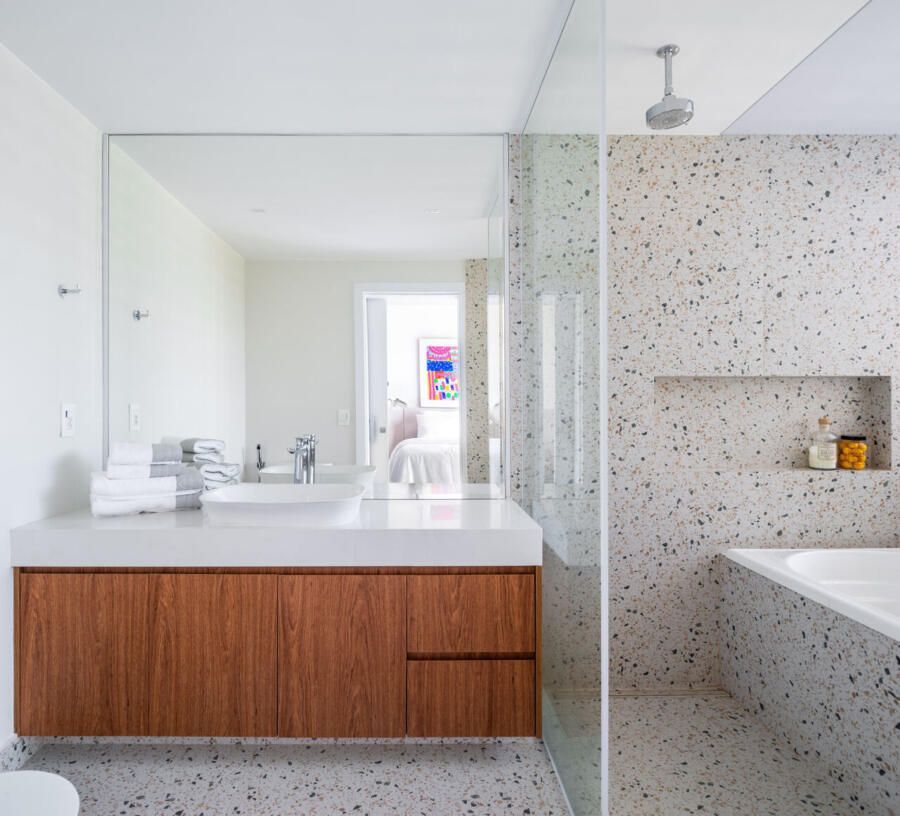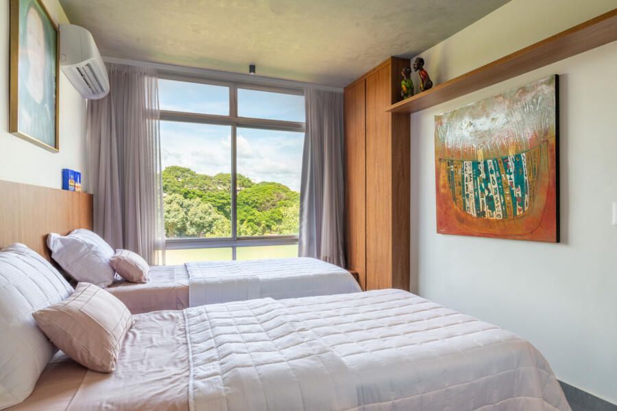 A antiga suíte virou closet, e o quarto de serviço foi transformado em um banheiro espaçoso para a nova suíte master, com banheira, iluminação natural e um pequeno jardim, criando um espaço relaxante. O quarto de hóspedes, pensado para familiares e amigos, foi equipado com camas confortáveis, armários práticos e um banheiro funcional, seguindo o mesmo estilo da suíte principal.