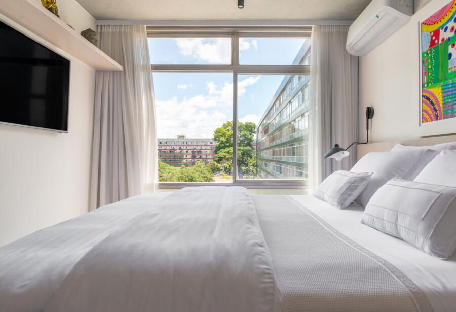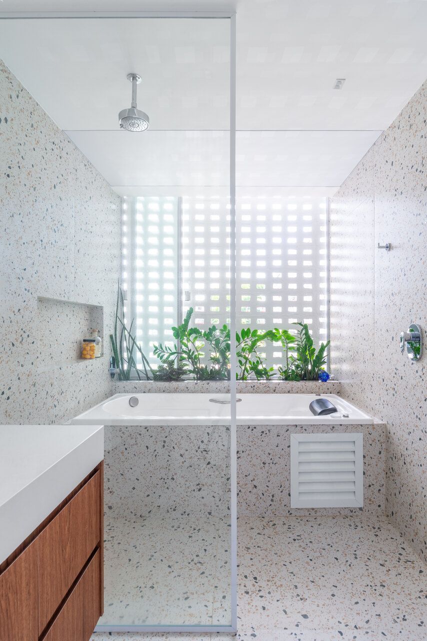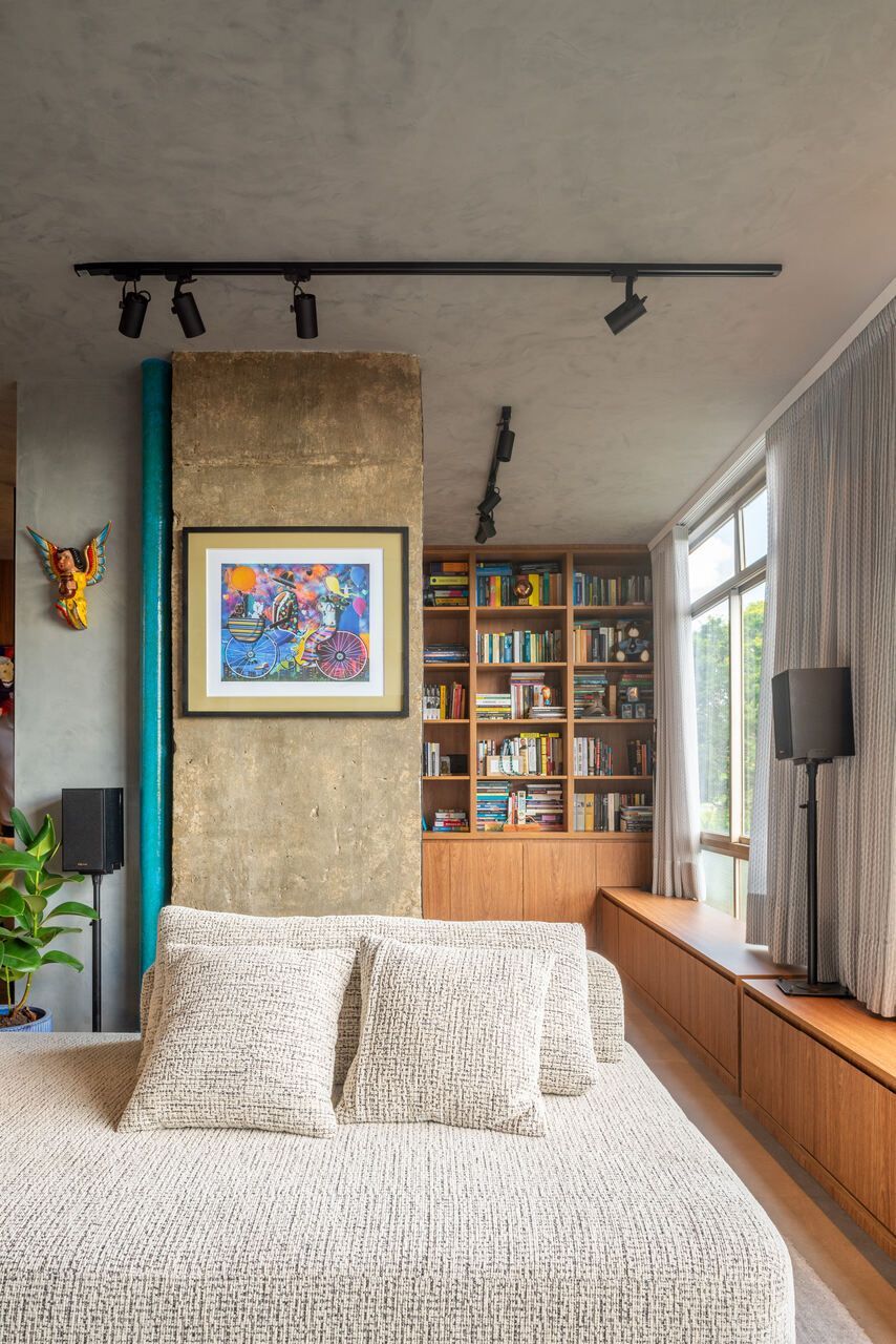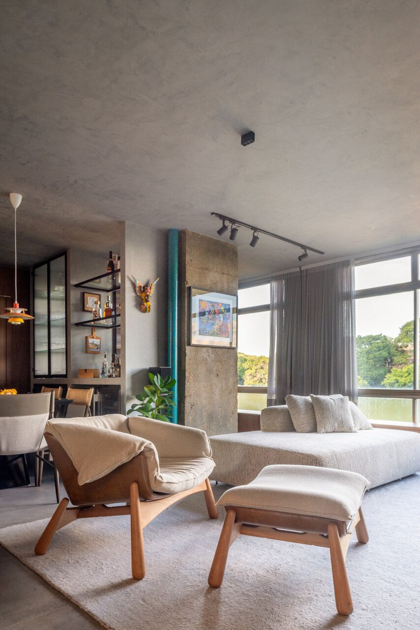 Este apartamento de 110m² fica na Asa Sul, em Brasília, o projeto, assinado originalmente pelo arquiteto Eduardo Negri, passou por uma reforma assinada pelo escritório Umdiedro que valorizou características fortes do prédio, como as janelas do piso ao teto e as paredes de cobogó, que garantem muita luz e ventilação natural.