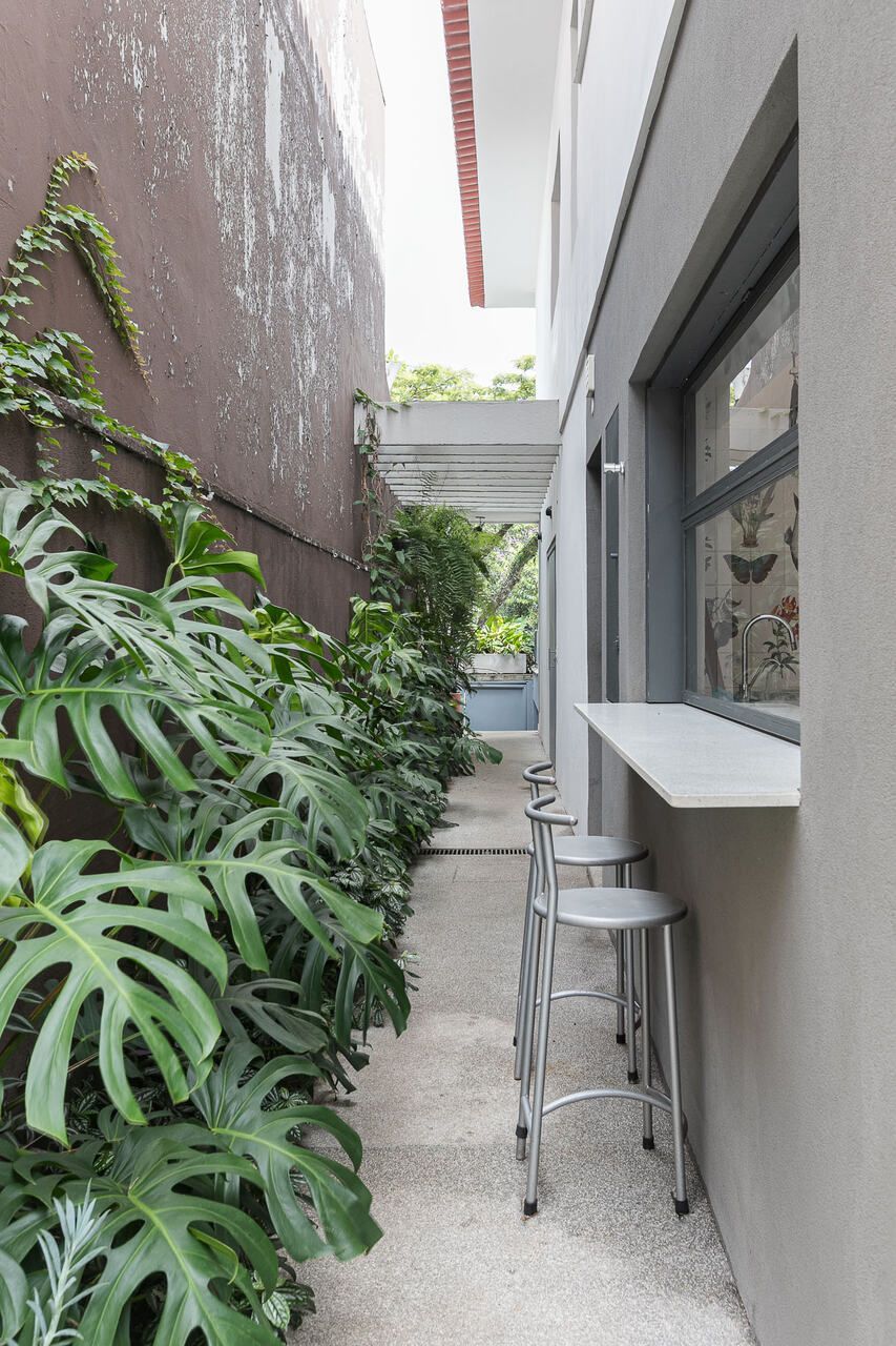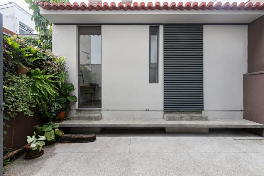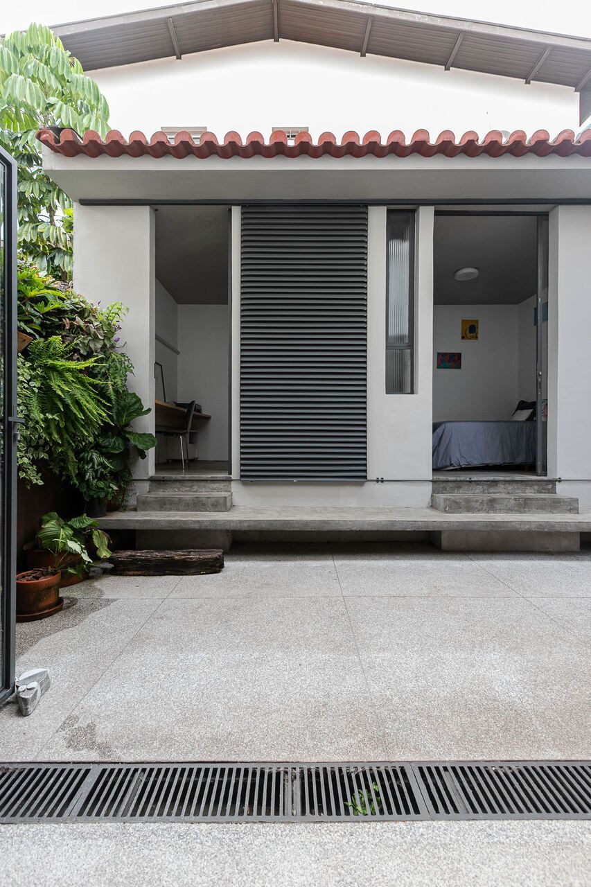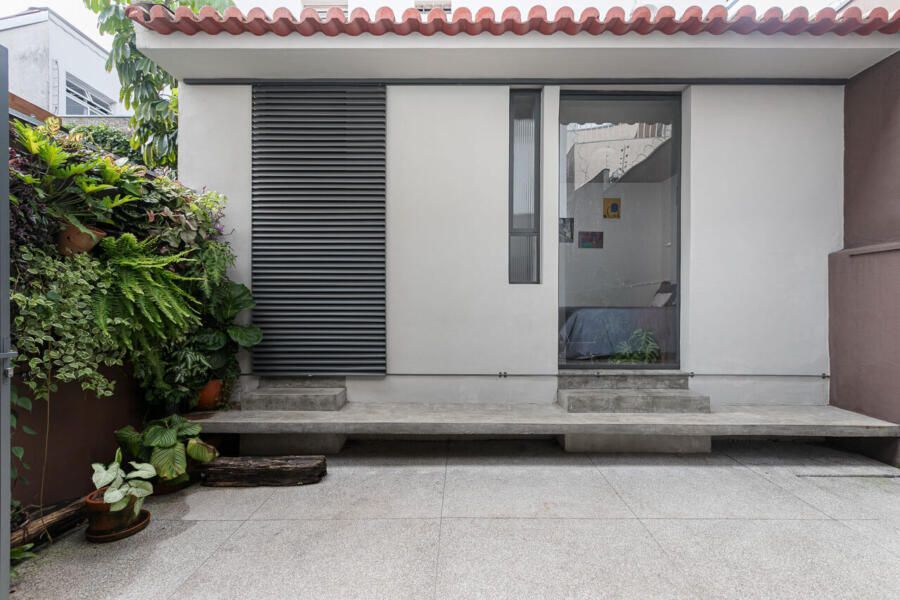 A reforma começou pela edícula, que antes funcionava como lavanderia. O espaço foi transformado em um quarto e um escritório, ambos projetados para aproveitar melhor a luz natural. O escritório recebeu uma grande folha de vidro interno e um brise externo, que ajudam a controlar a iluminação e garantir mais privacidade. Além disso, foi criado um banheiro canadense, compartilhado entre o dormitório e o home office.