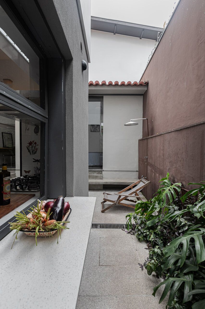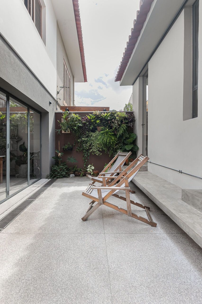 A reconfiguração dos ambientes trouxe um novo papel para o pátio central, que agora funciona como uma varanda aberta para uso comum da casa.