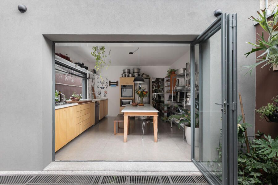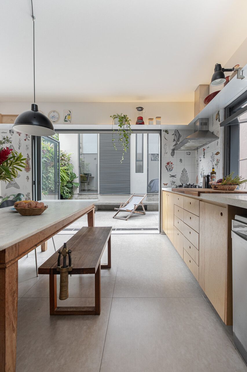 A cozinha se abre para o exterior por meio de grandes folhas móveis, permitindo entrada de luz natural, ventilação e mais integração com o pátio. Se você gosta de ambientes bem iluminados, veja também: Casa iluminada e bem ventilada.