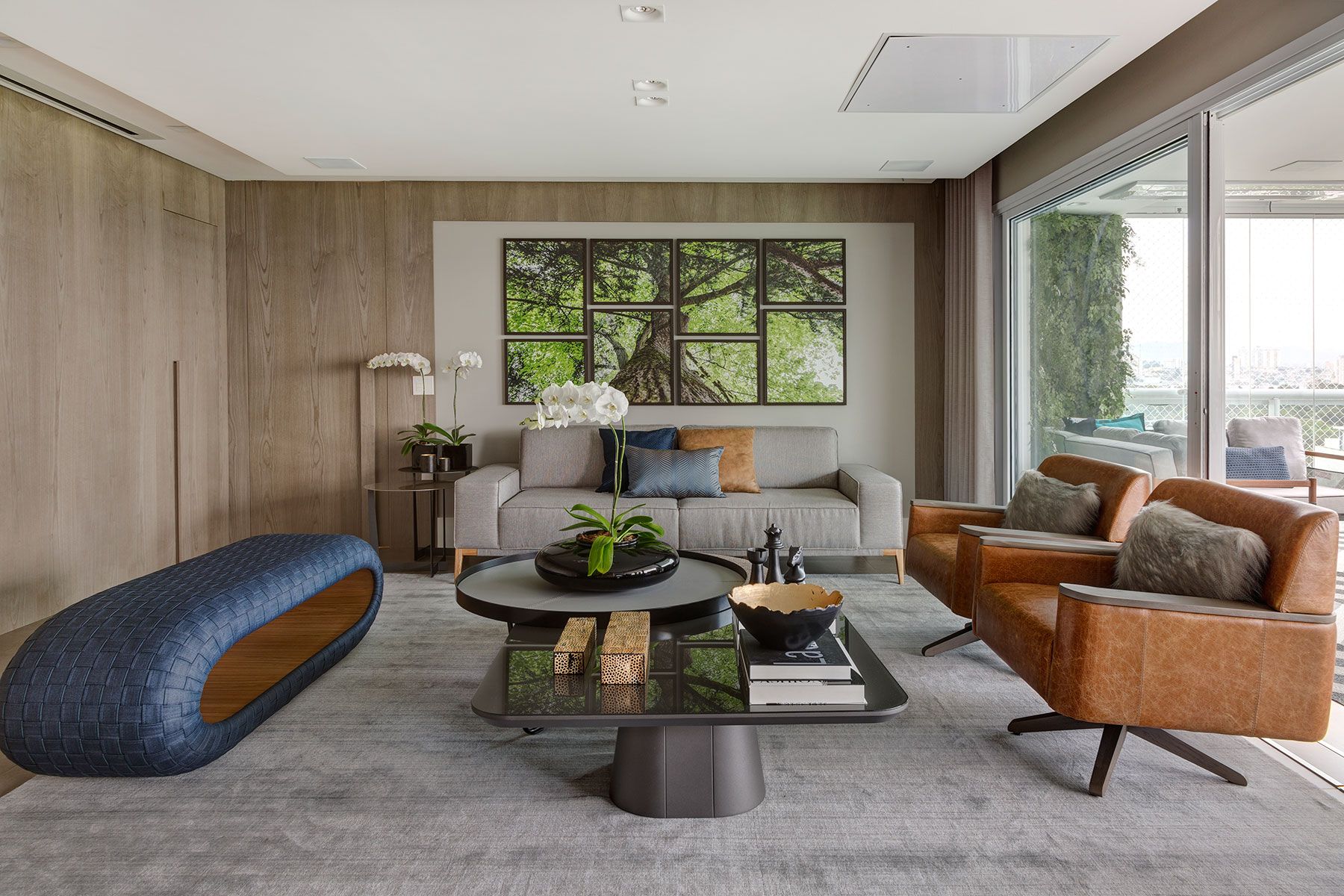 O apartamento de 283m² possui automação completa, com comando por voz em todos ambientes. Para completar, a decoração tem itens práticos e ao mesmo tempo sustentáveis, como por exemplo: o couro de avestruz sintético no lavabo, tecidos de fibra reciclável nos estofados.