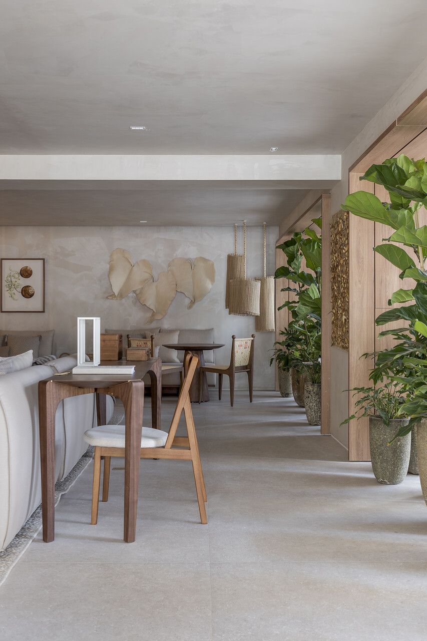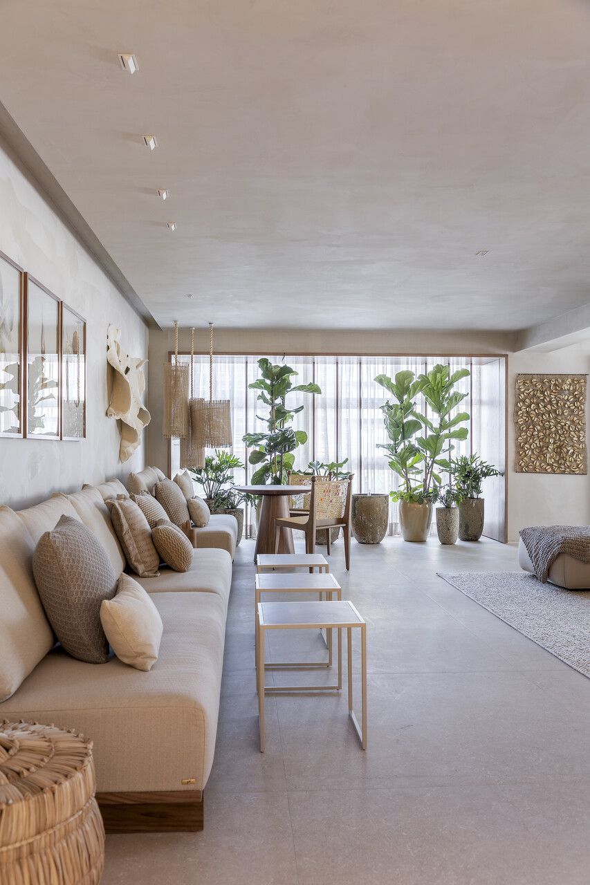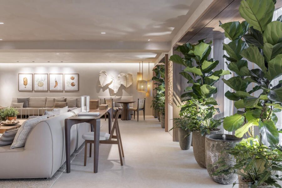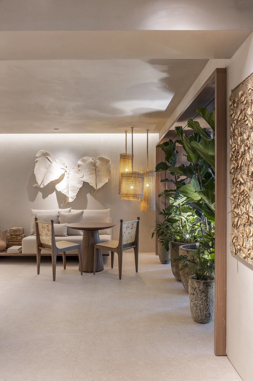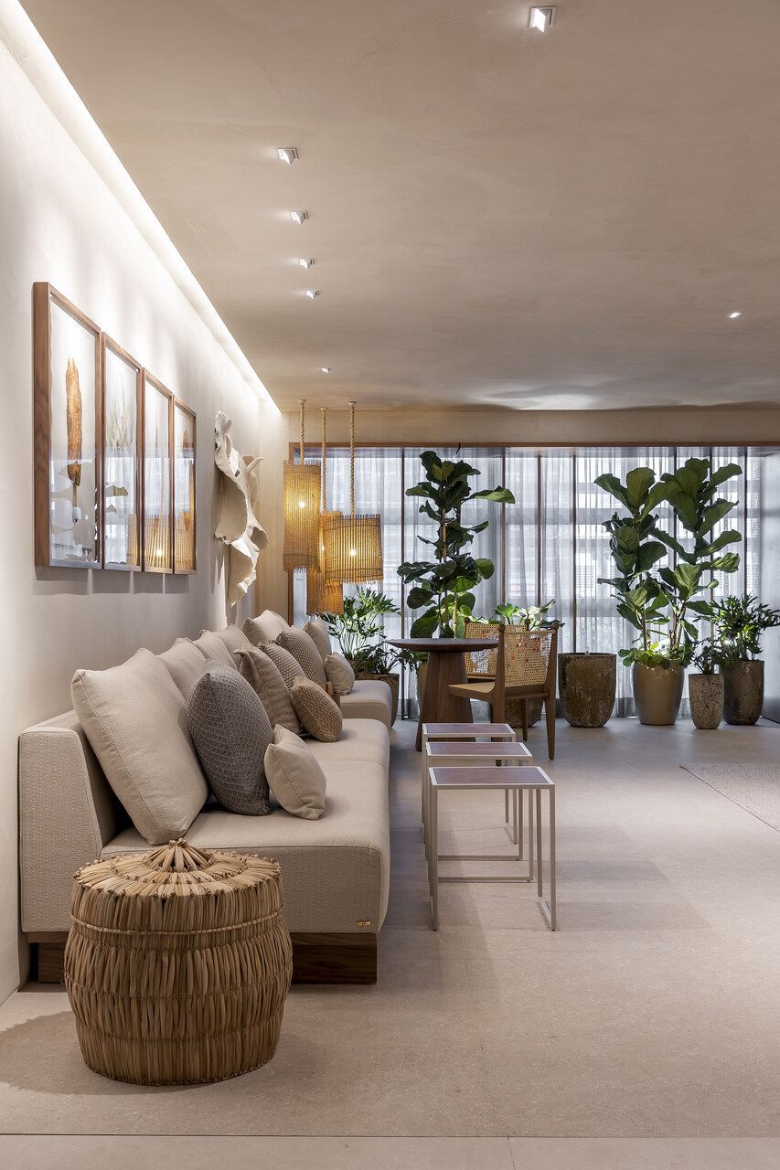 Concebido como uma grande sala de estar, a disposição do mobiliário definida por Isabella é acolhedora e possibilita a prática de múltiplas atividades como a leitura de um livro, conversas agradáveis, relaxamento e até mesmo o trabalho. Por isso, os materiais foram escolhidos cuidadosamente para promover a melhor experiência ao visitante.