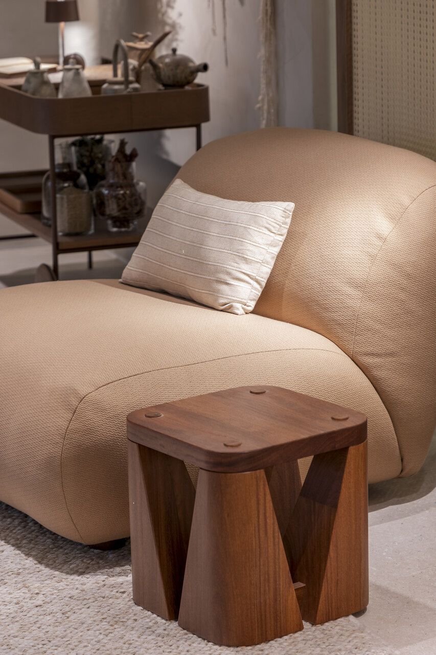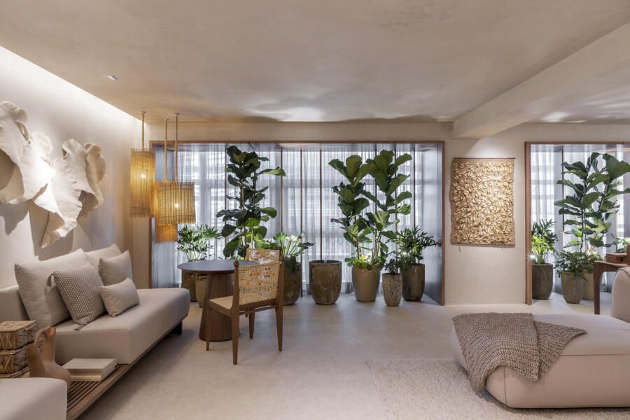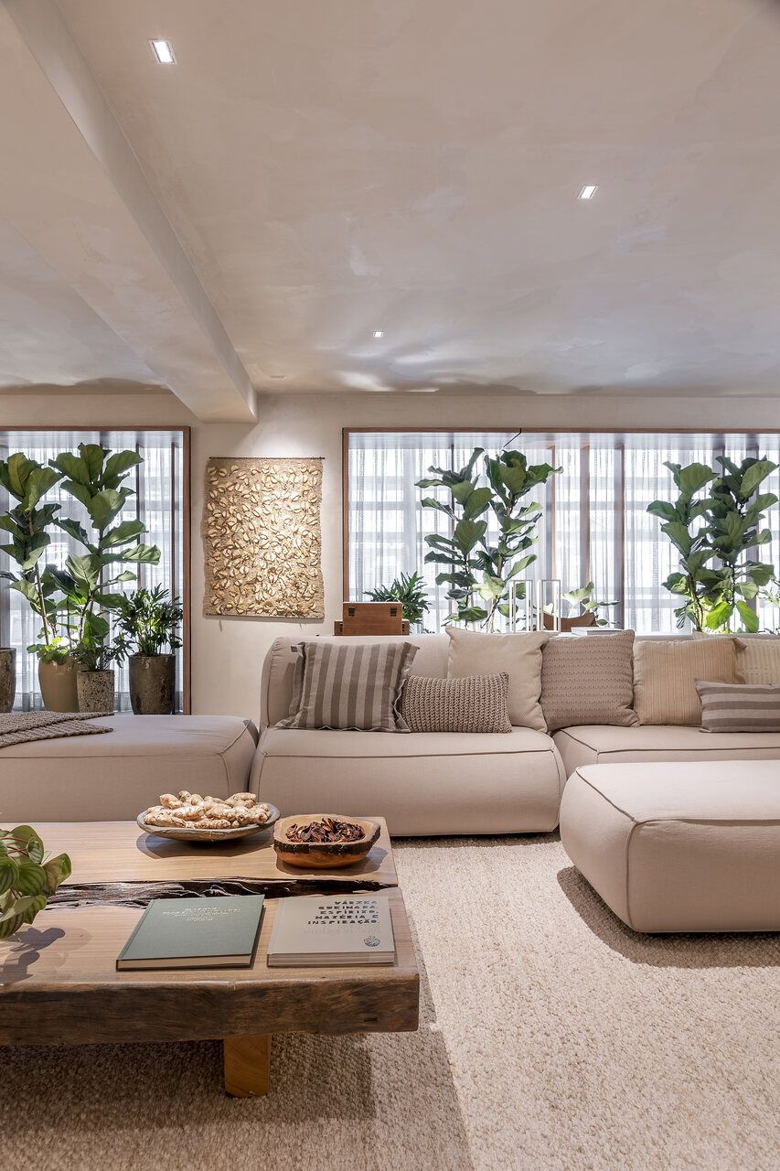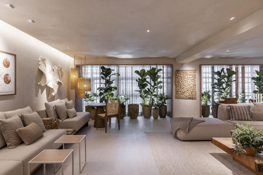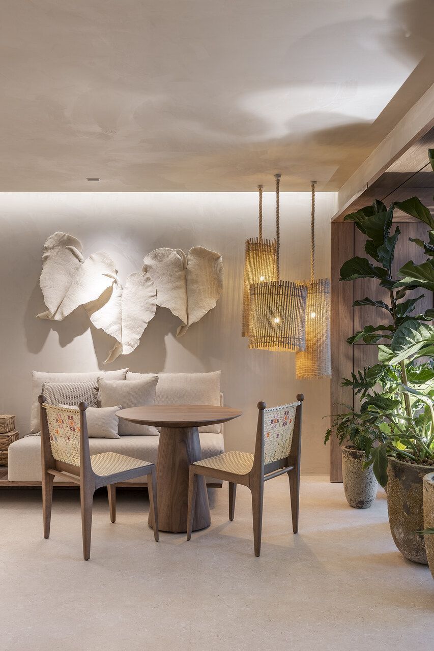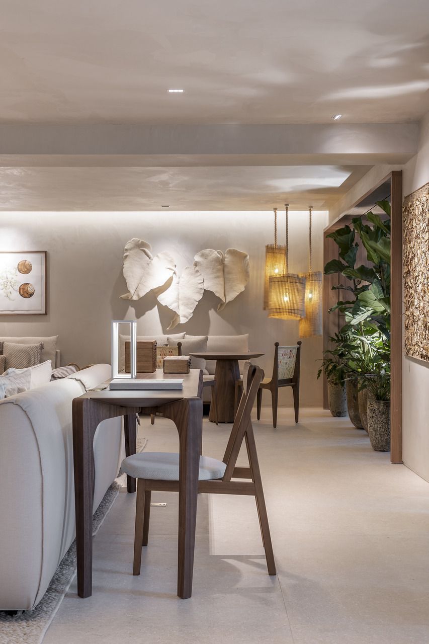 Concebido como uma grande sala de estar, a disposição do mobiliário definida por Isabella é acolhedora e possibilita a prática de múltiplas atividades como a leitura de um livro, conversas agradáveis, relaxamento e até mesmo o trabalho. Por isso, os materiais foram escolhidos cuidadosamente para promover a melhor experiência ao visitante.