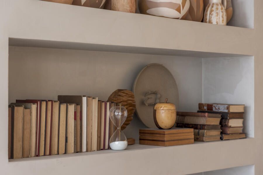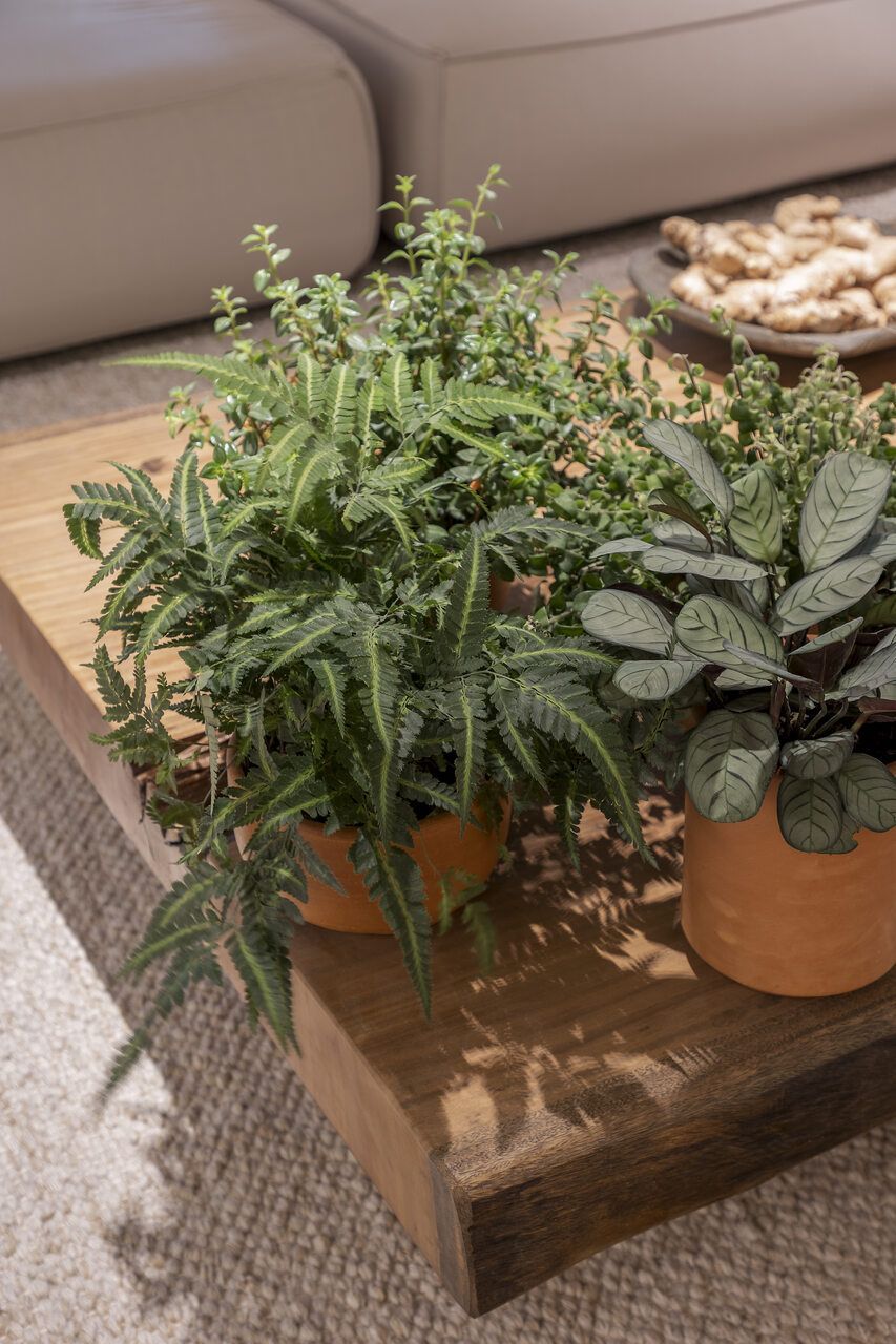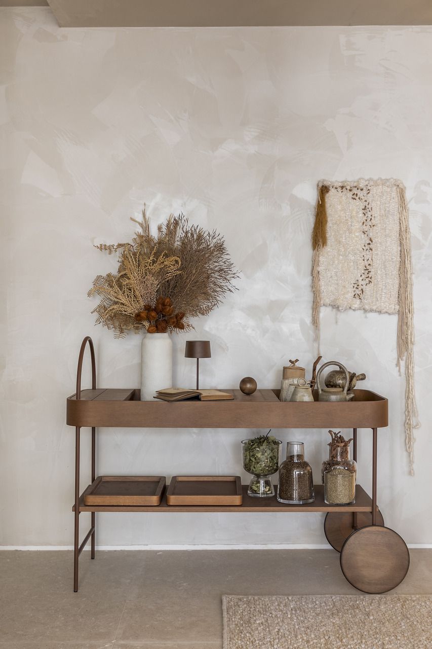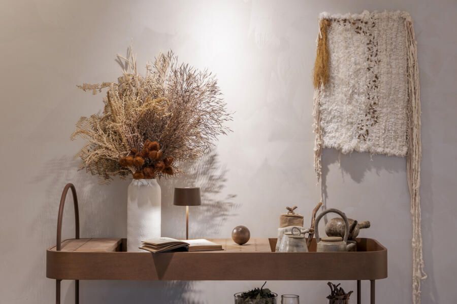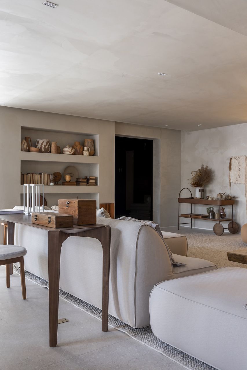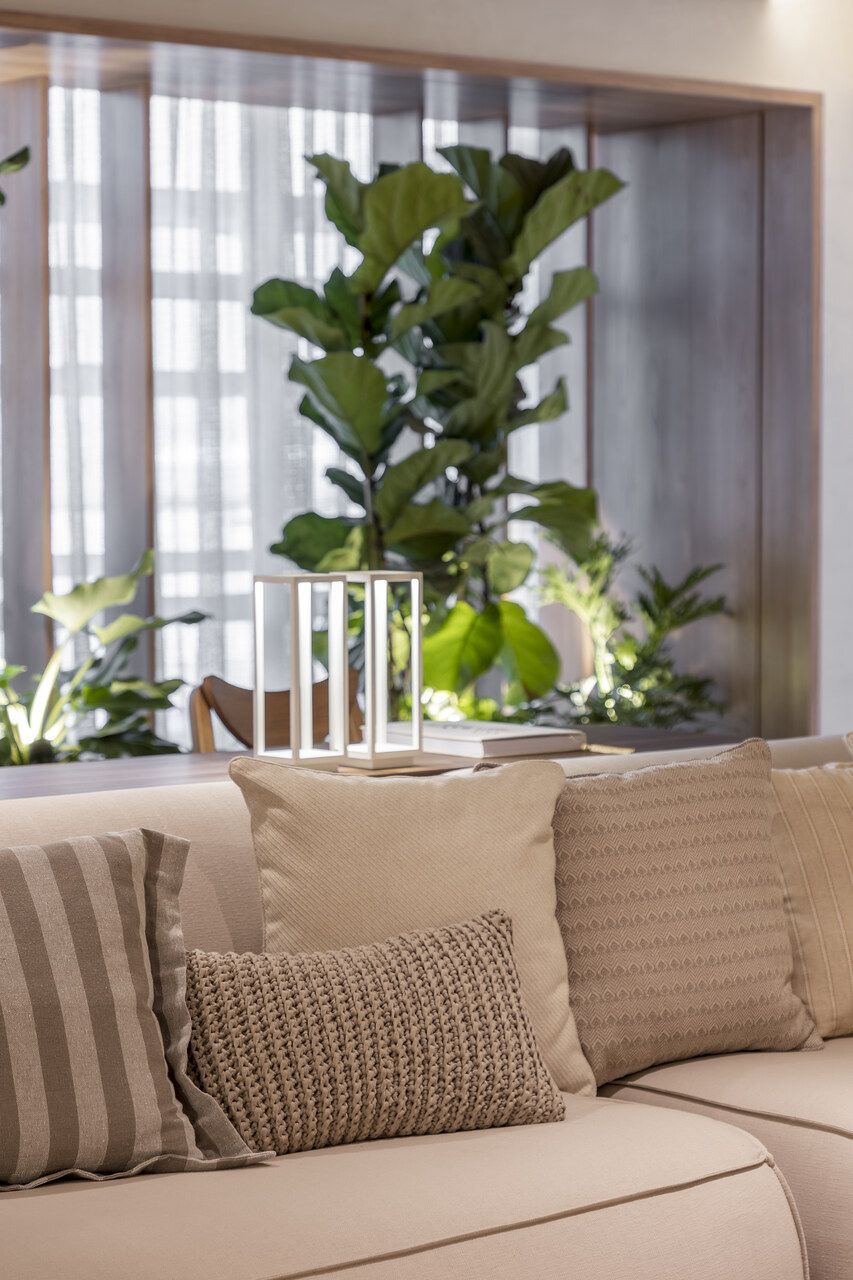 As luminárias sem fio da Zaff, Olivia Mini na cor Corten e Home na cor Branca, estão presentes no ambiente e proporcionam uma iluminação delicada. Já o Travertino da Portinari equilibra o ambiente entre conforto e sofisticação.