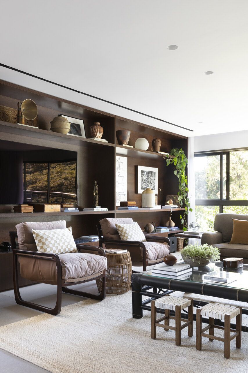 Essa fluidez também aparece na escolha da paleta. Tons terrosos, madeiras escuras, cerâmicas e fibras naturais se misturam a móveis de design e peças vintage. O piso em cinza quente, com aparência de pedra, contrasta com o assoalho rústico da área íntima, criando uma transição suave. O sofá xadrez, as poltronas em lona cacau e os sofás em linho café trazem textura e conforto, enquanto cortinas brancas e paredes claras suavizam o conjunto, criando o refúgio urbano contemporâneo perfeito.