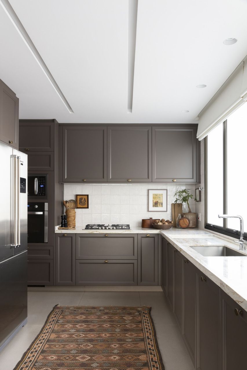 A cozinha do chef, como os arquitetos a chamam, foi desenhada para encontros menores, com lugar para até oito pessoas e uma vista generosa para a praça. Ali, o preparo das refeições é um ritual compartilhado. O mobiliário em tons escuros dialoga com as bancadas em quartzito Dolomita Gold, enquanto o acabamento em laca nocciola e os azulejos retrô evocam o charme europeu. A integração visual com a sala de jantar reforça a fluidez que guia todo o projeto.