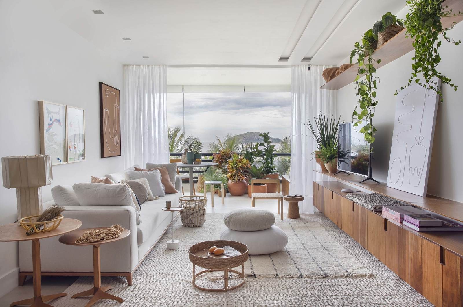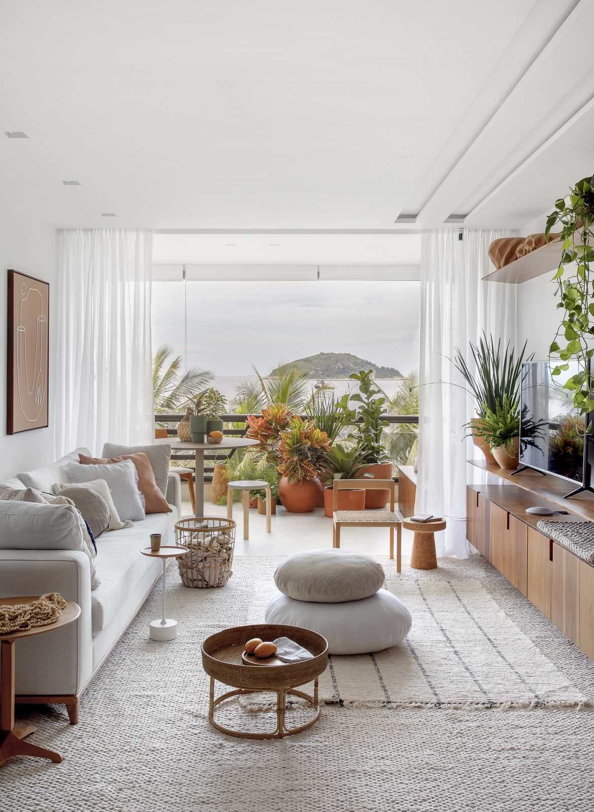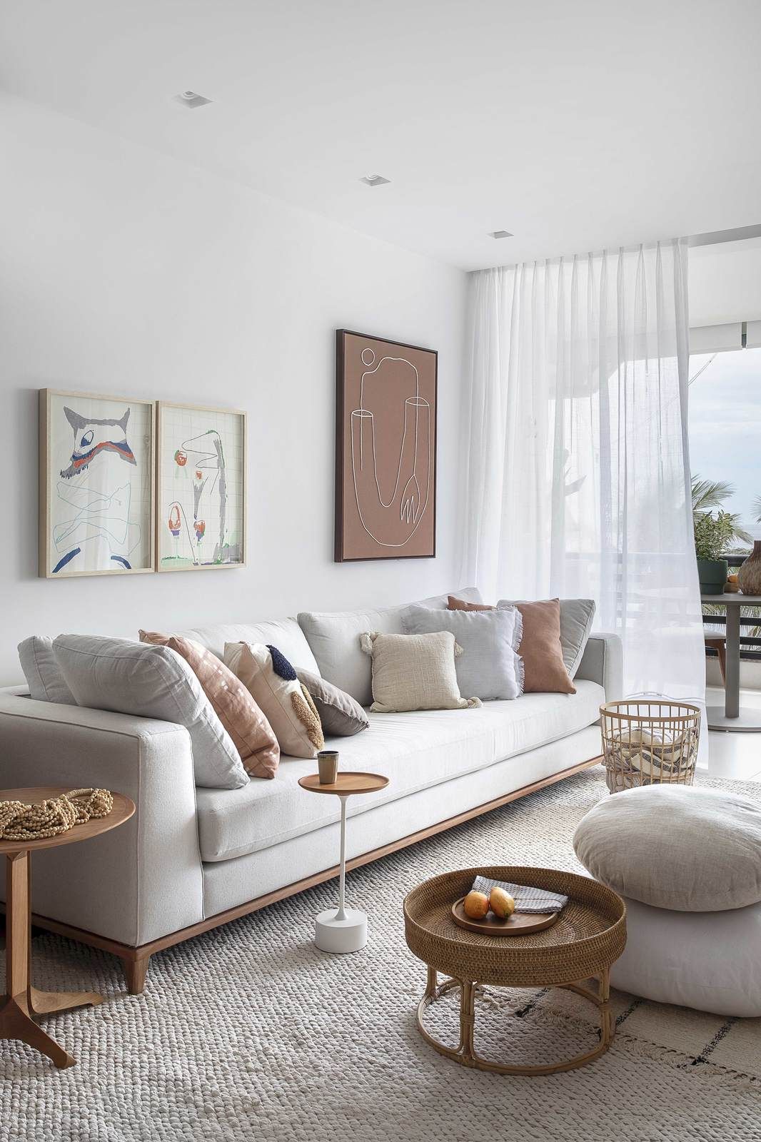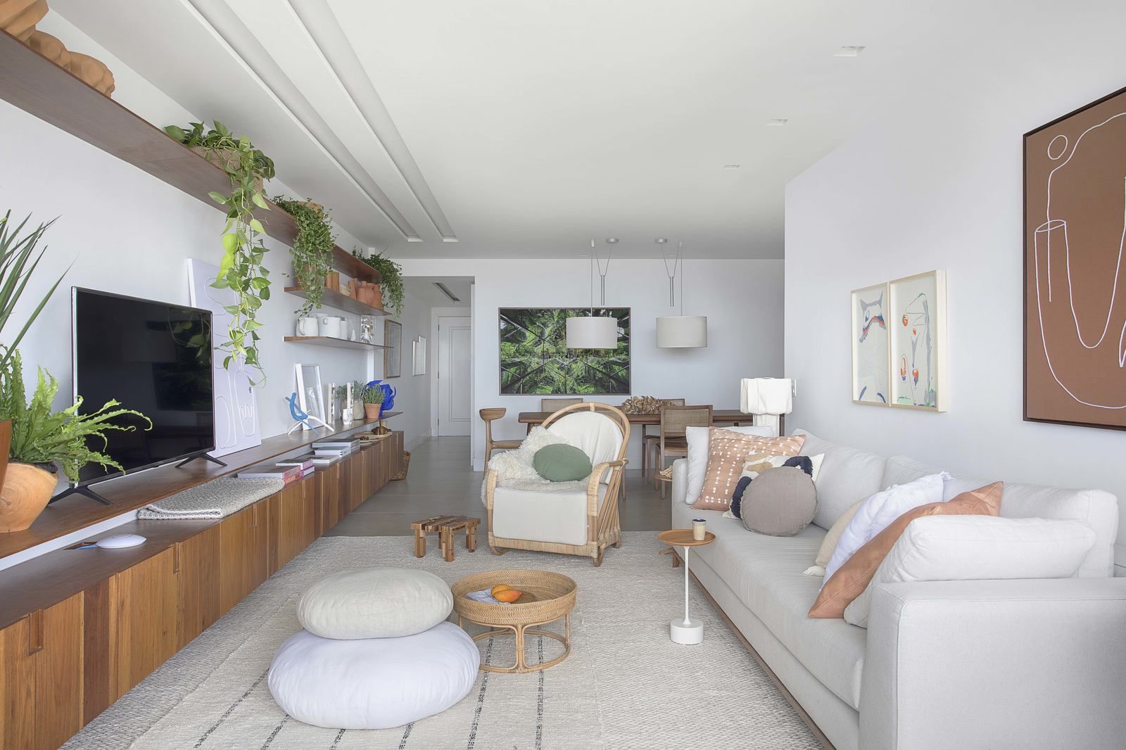 “Escolhemos os elementos de forma que entrassem de forma discreta e não tirassem o protagonismo da vista para o mar. Para a sala, optamos por nuances de branco e nude, com toques de verde, rosa, azul e tons terrosos nos detalhes, além de muito material natural. Buscamos cores agradáveis e convidativas ao olhar e para apreciar o ambiente. Nada de contrastes fortes.”
