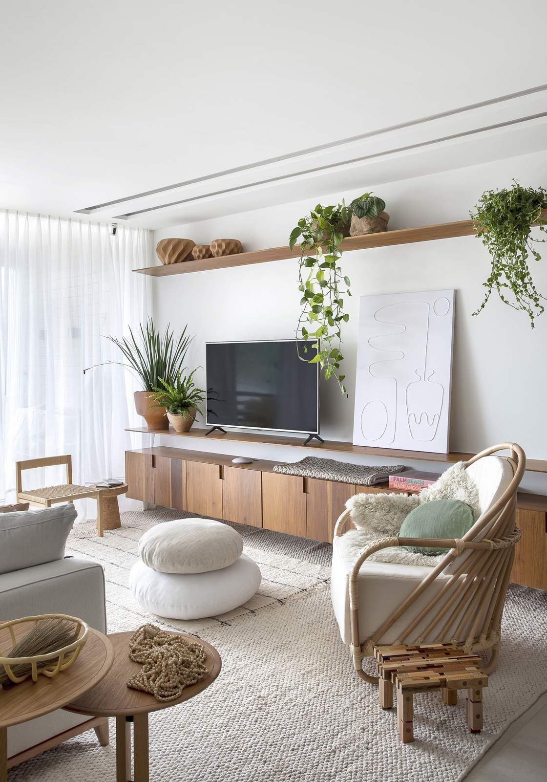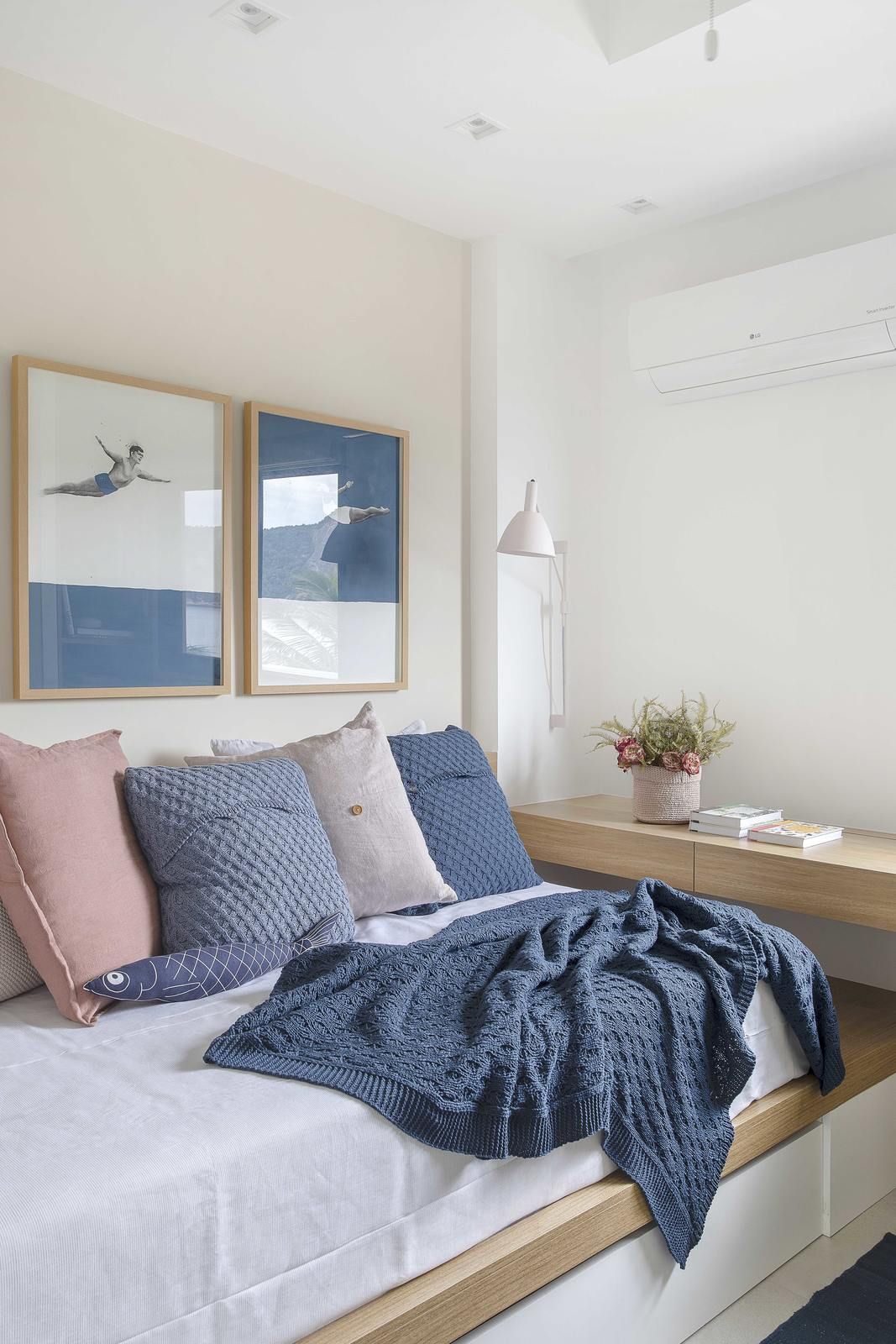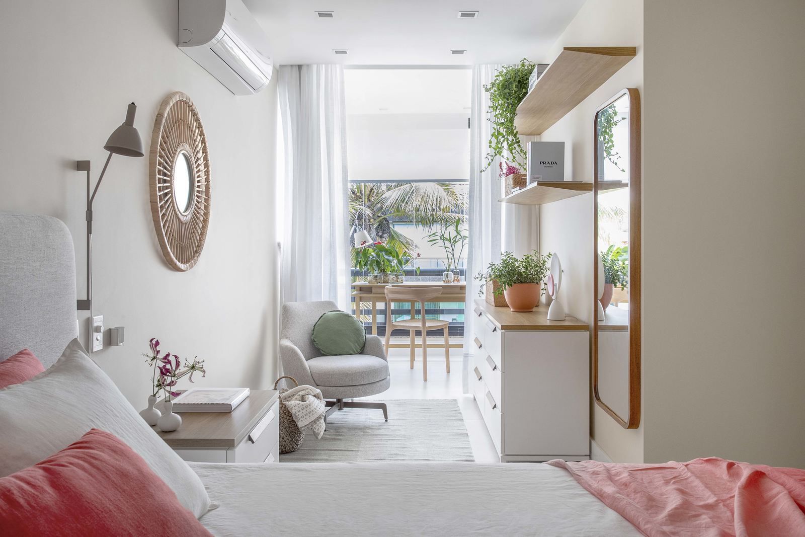 “Escolhemos os elementos de forma que entrassem de forma discreta e não tirassem o protagonismo da vista para o mar. Para a sala, optamos por nuances de branco e nude, com toques de verde, rosa, azul e tons terrosos nos detalhes, além de muito material natural. Buscamos cores agradáveis e convidativas ao olhar e para apreciar o ambiente. Nada de contrastes fortes.”