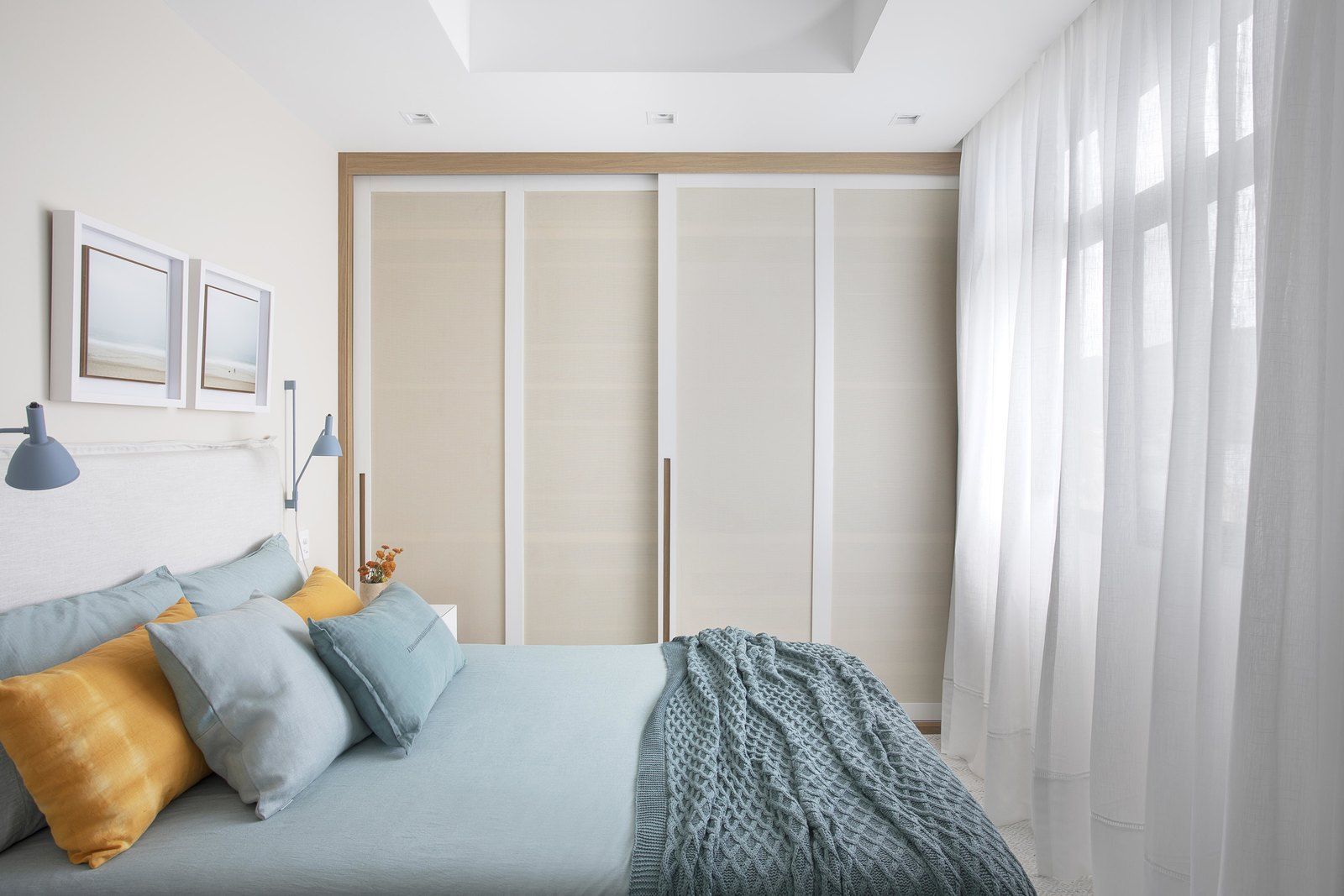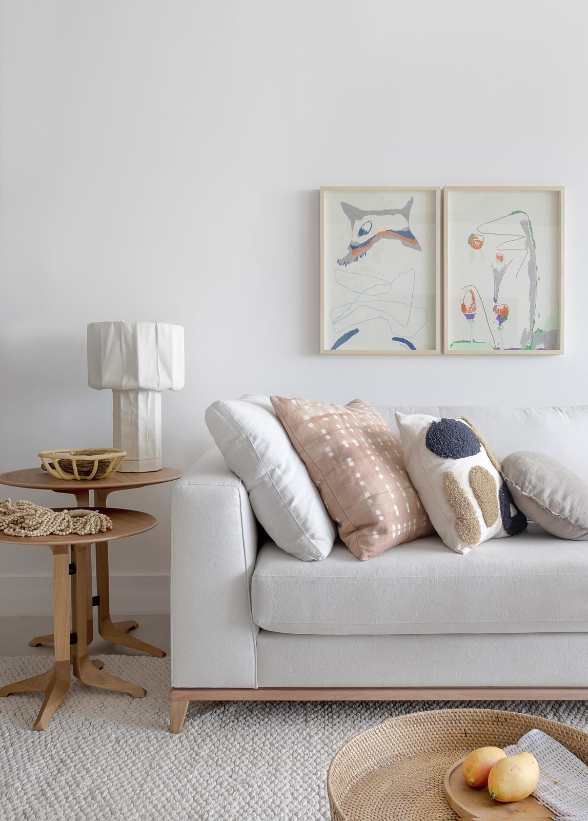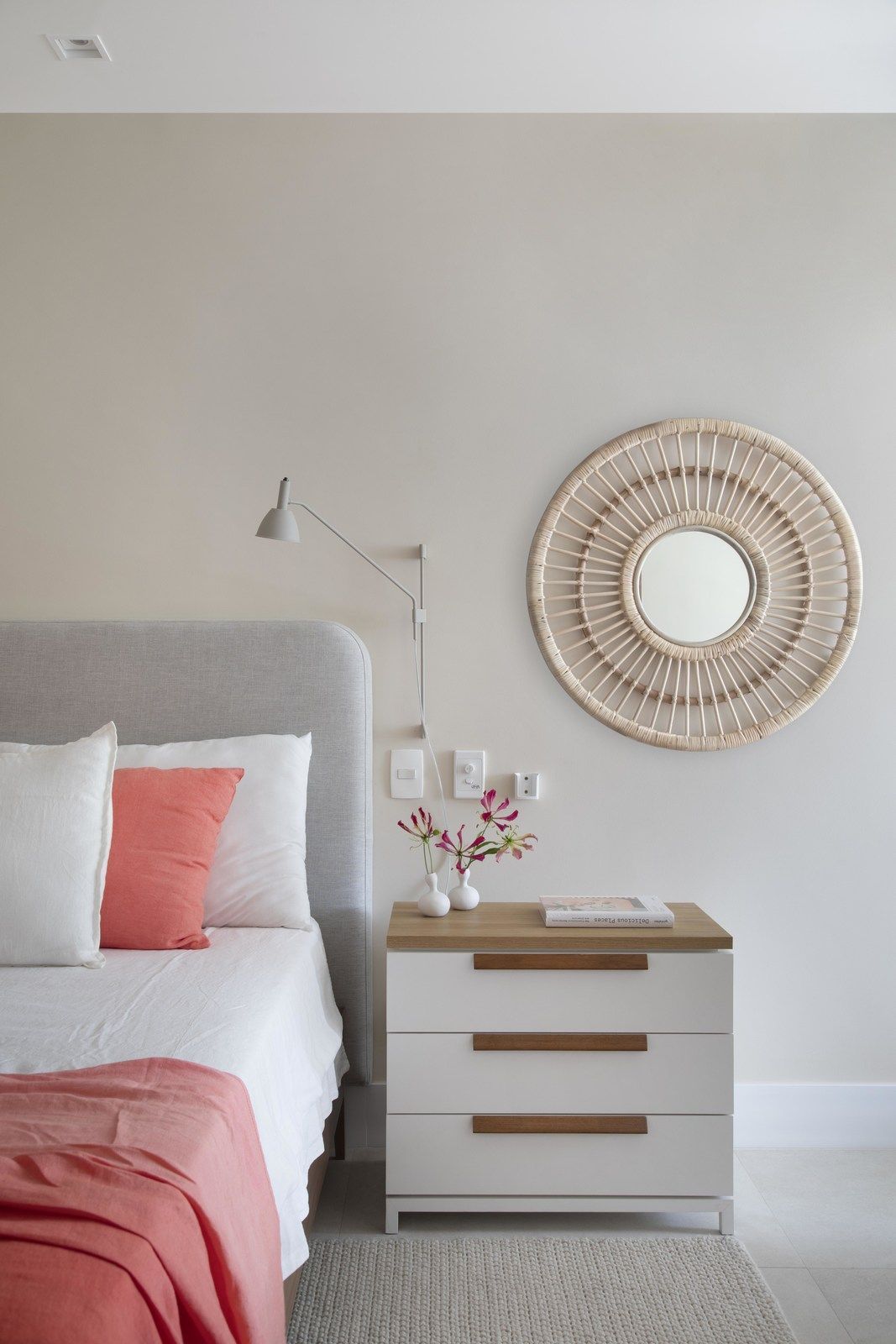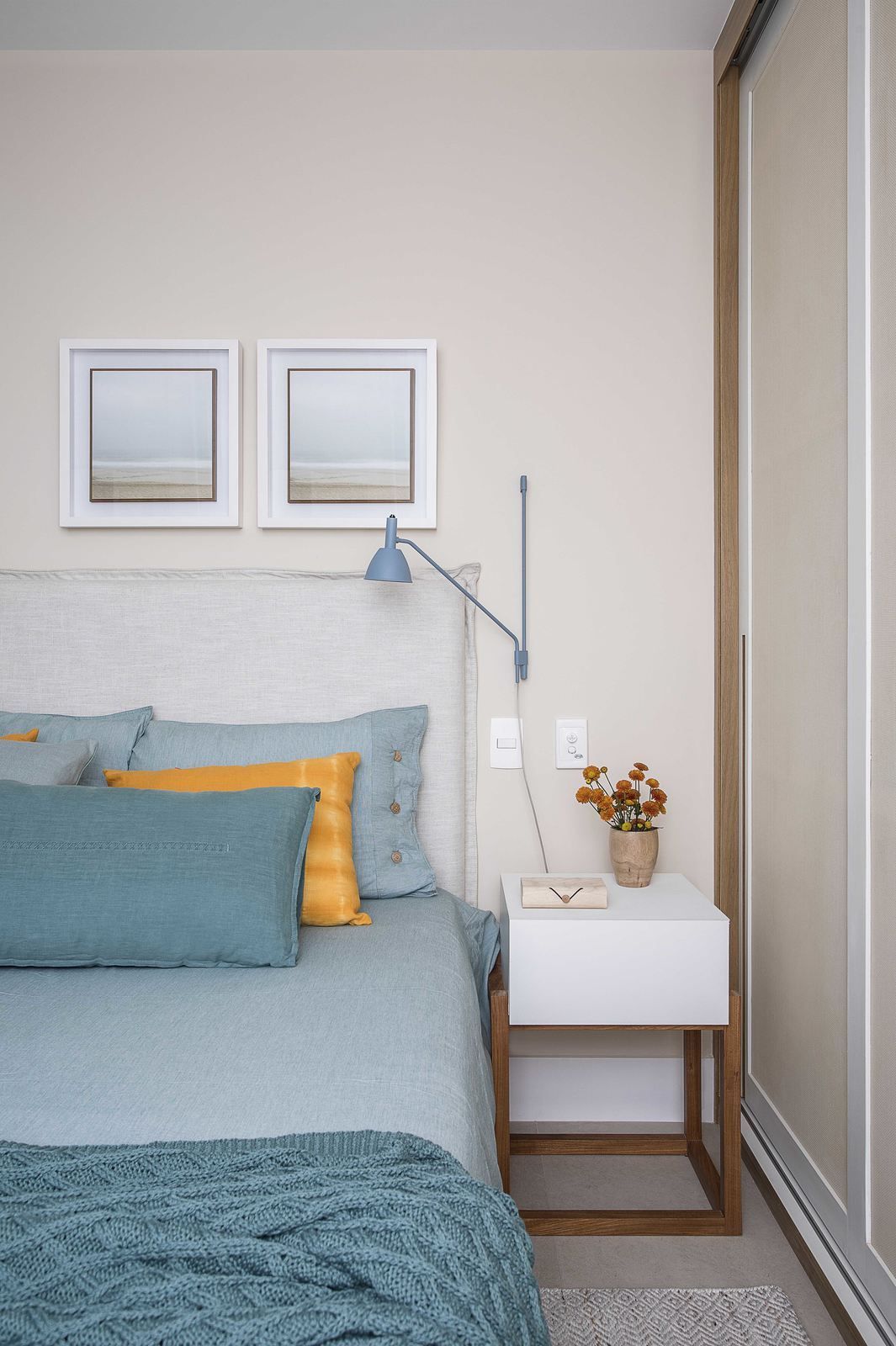 “Escolhemos os elementos de forma que entrassem de forma discreta e não tirassem o protagonismo da vista para o mar. Para a sala, optamos por nuances de branco e nude, com toques de verde, rosa, azul e tons terrosos nos detalhes, além de muito material natural. Buscamos cores agradáveis e convidativas ao olhar e para apreciar o ambiente. Nada de contrastes fortes.”