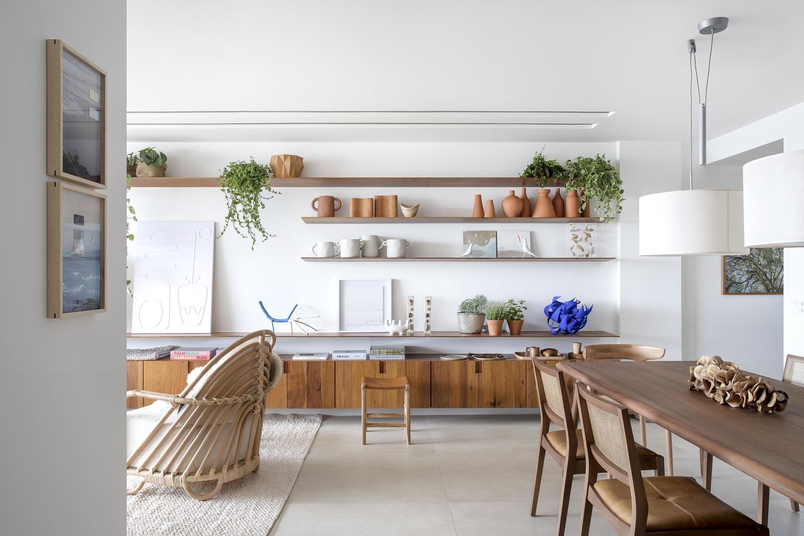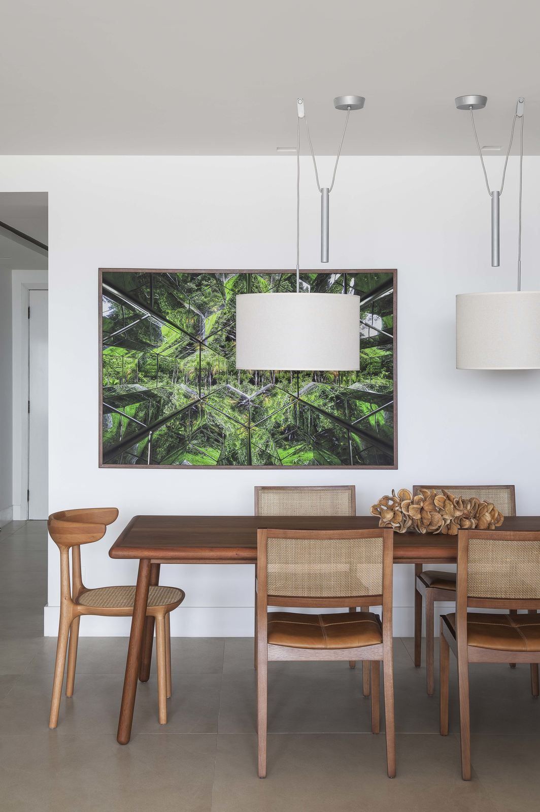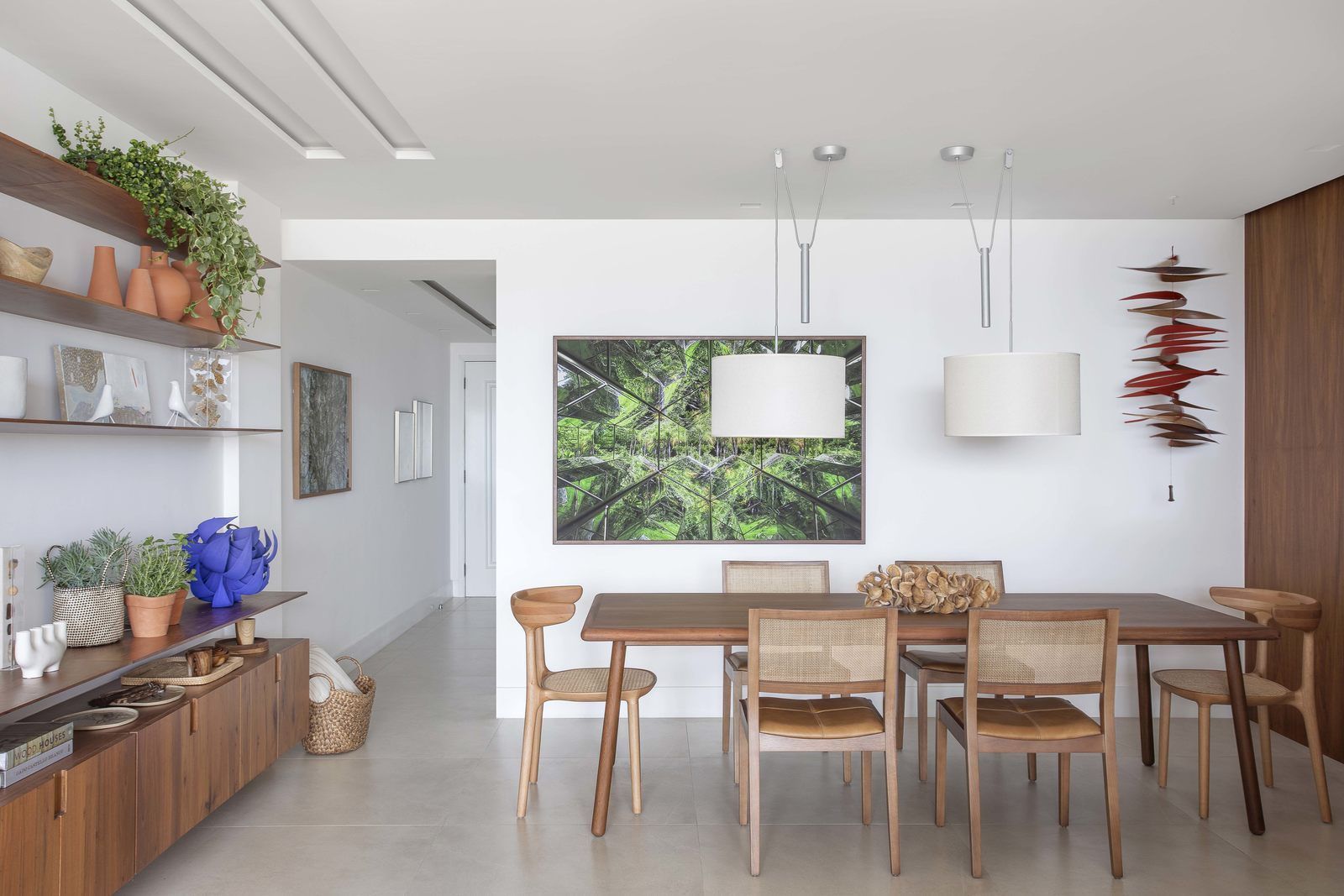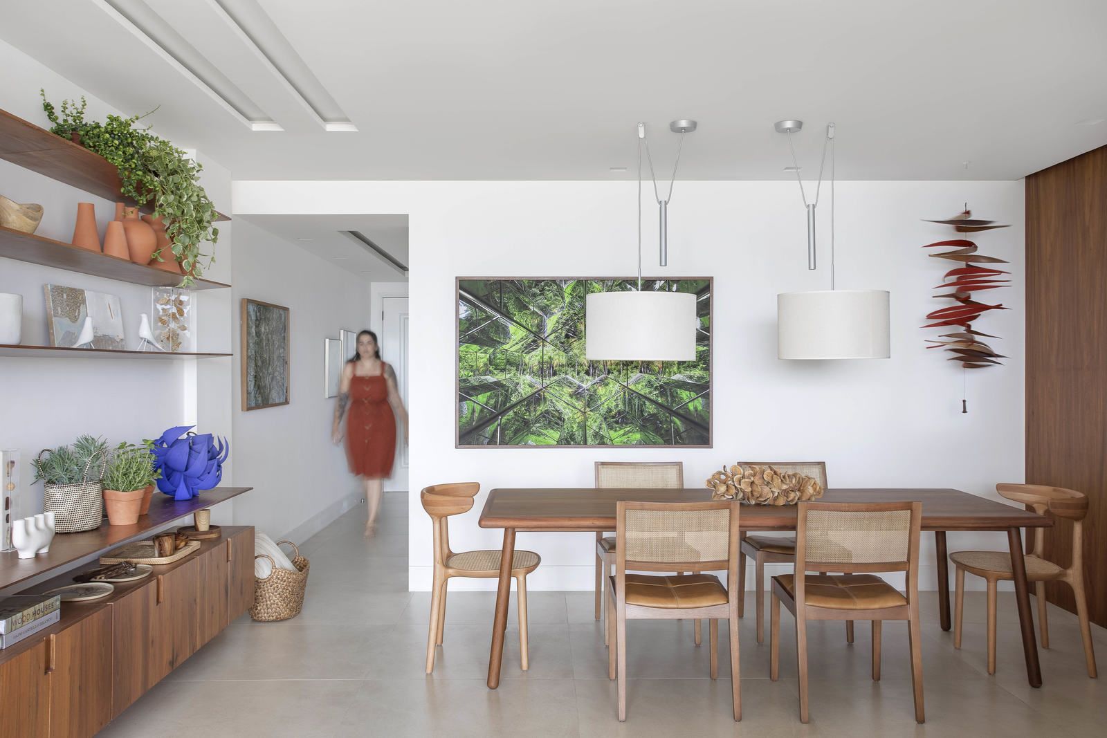 “O cliente, por ser sueco, valoriza muito o design de mobiliário, principalmente em madeira. Isso nos levou para um caminho híbrido, como um ‘hygge praiano’, com muita madeira, design arrojado e texturas naturais. Destaca-se também o mobiliário de design arrojado, com peças assinadas por Jader Almeida, Aristeu Pires, Alvar Aalto e Jasper Morrison, e a marcenaria de linhas retas em freijó natural. O móvel feito em marcenaria, por exemplo, que vai da sala de jantar até a sala de estar, é coringa: ele integra os espaços, gera bastante lugar para armazenagem e ainda direciona o olhar para a vista.”