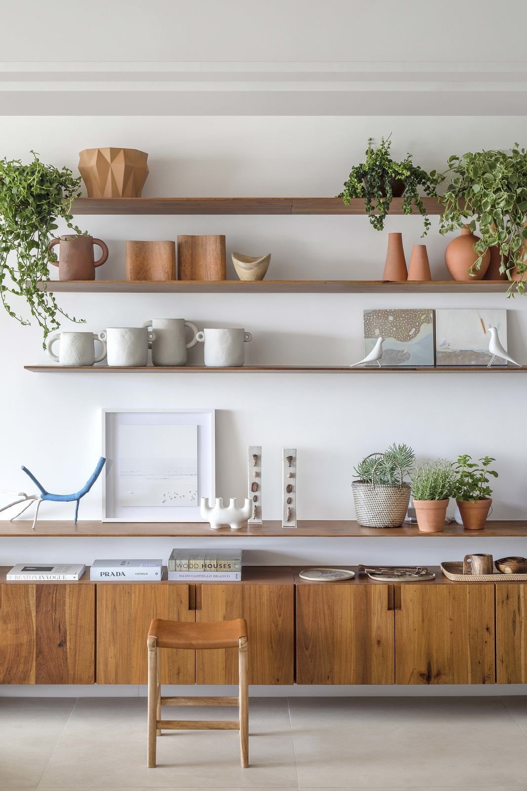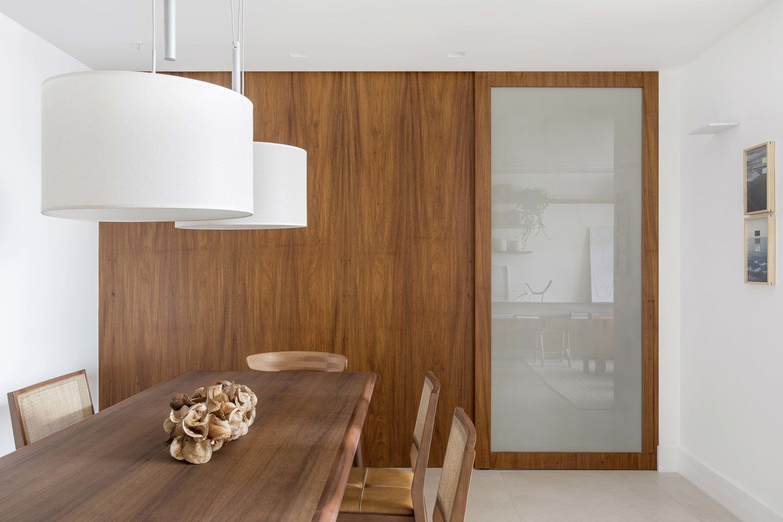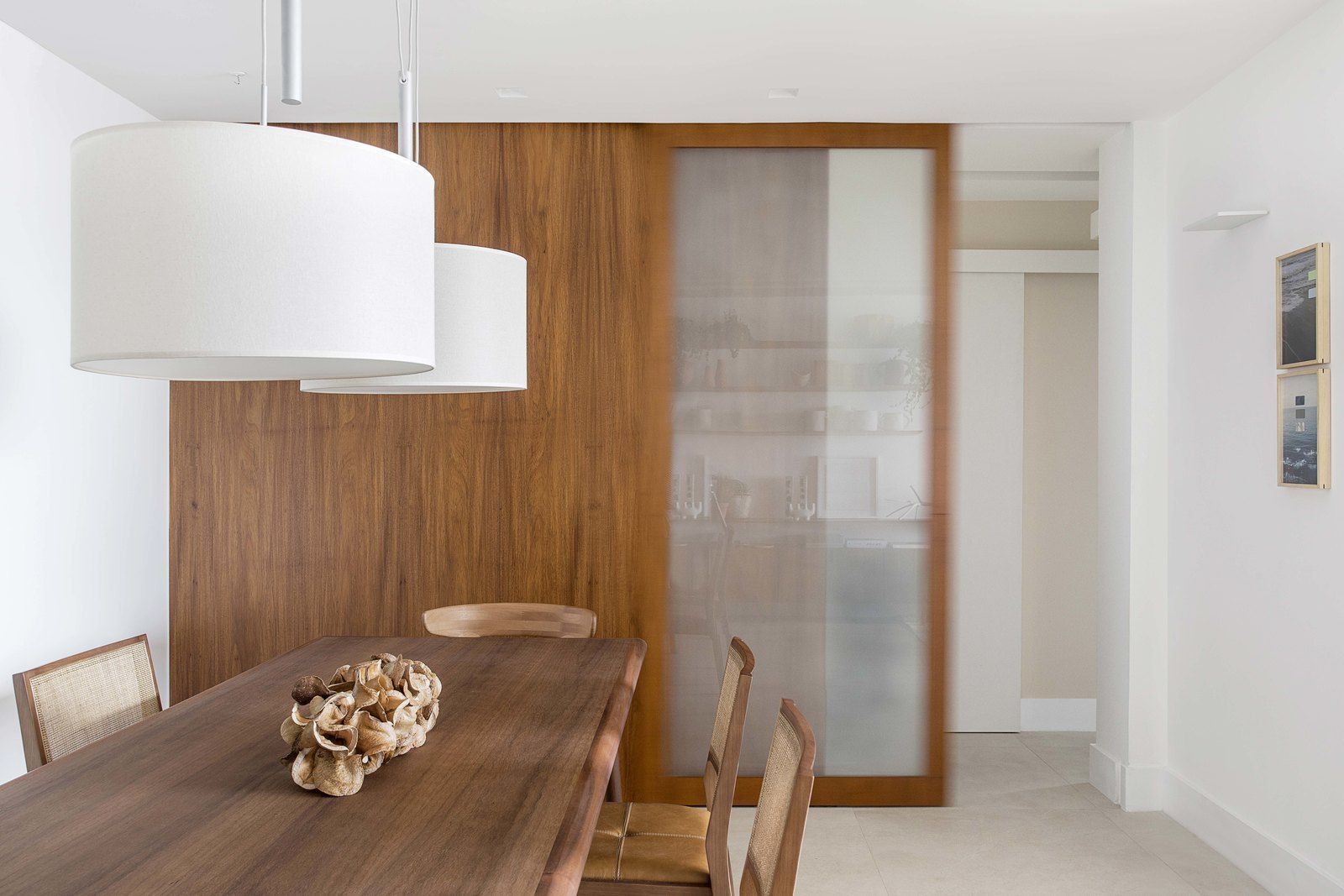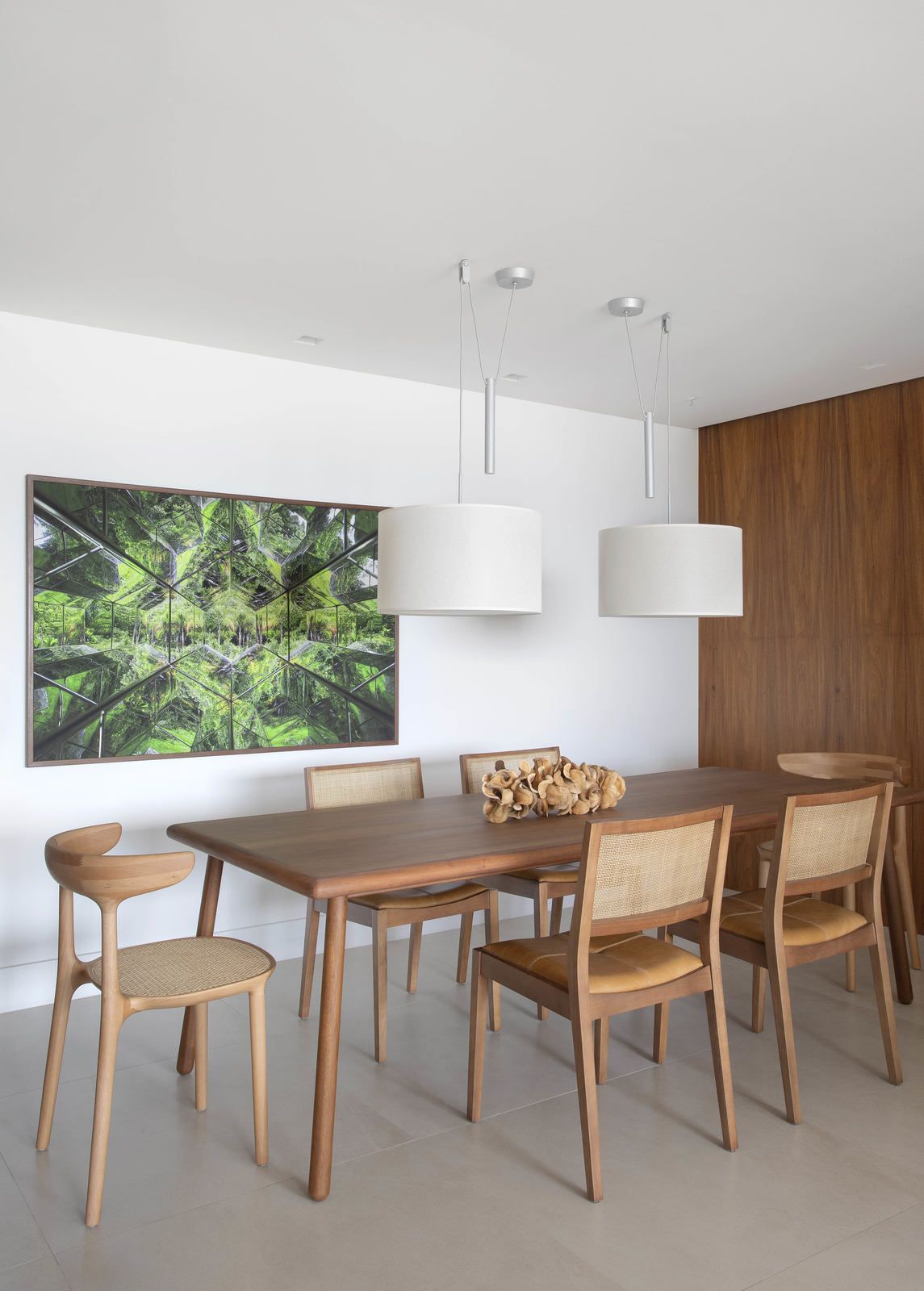 “O cliente, por ser sueco, valoriza muito o design de mobiliário, principalmente em madeira. Isso nos levou para um caminho híbrido, como um ‘hygge praiano’, com muita madeira, design arrojado e texturas naturais. Destaca-se também o mobiliário de design arrojado, com peças assinadas por Jader Almeida, Aristeu Pires, Alvar Aalto e Jasper Morrison, e a marcenaria de linhas retas em freijó natural. O móvel feito em marcenaria, por exemplo, que vai da sala de jantar até a sala de estar, é coringa: ele integra os espaços, gera bastante lugar para armazenagem e ainda direciona o olhar para a vista.”