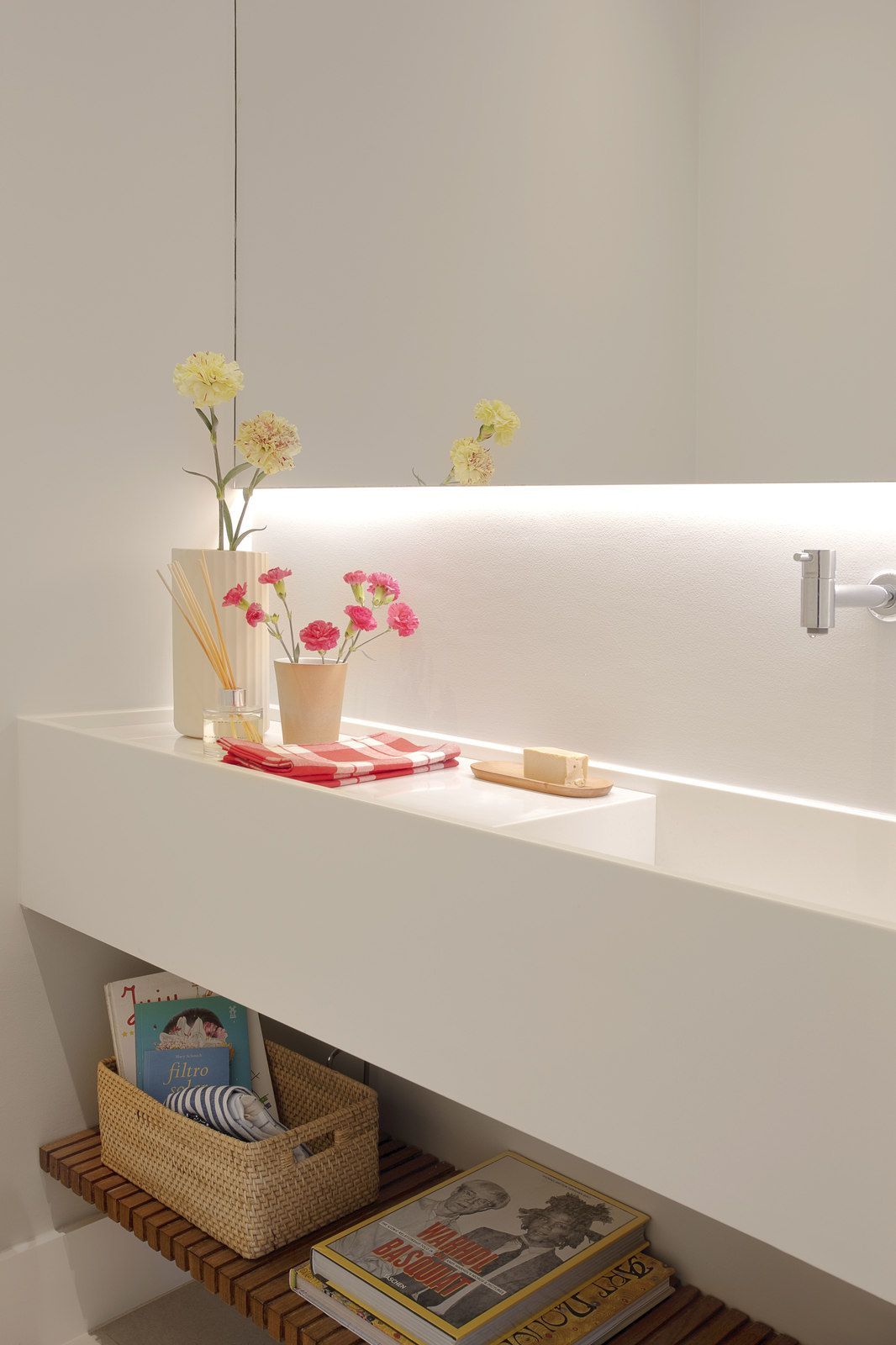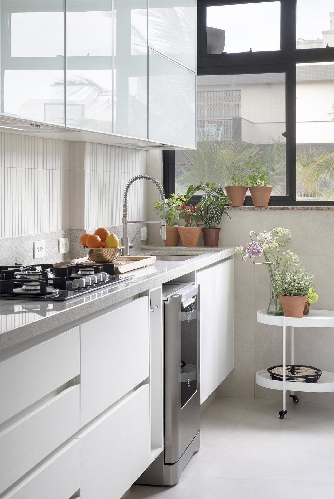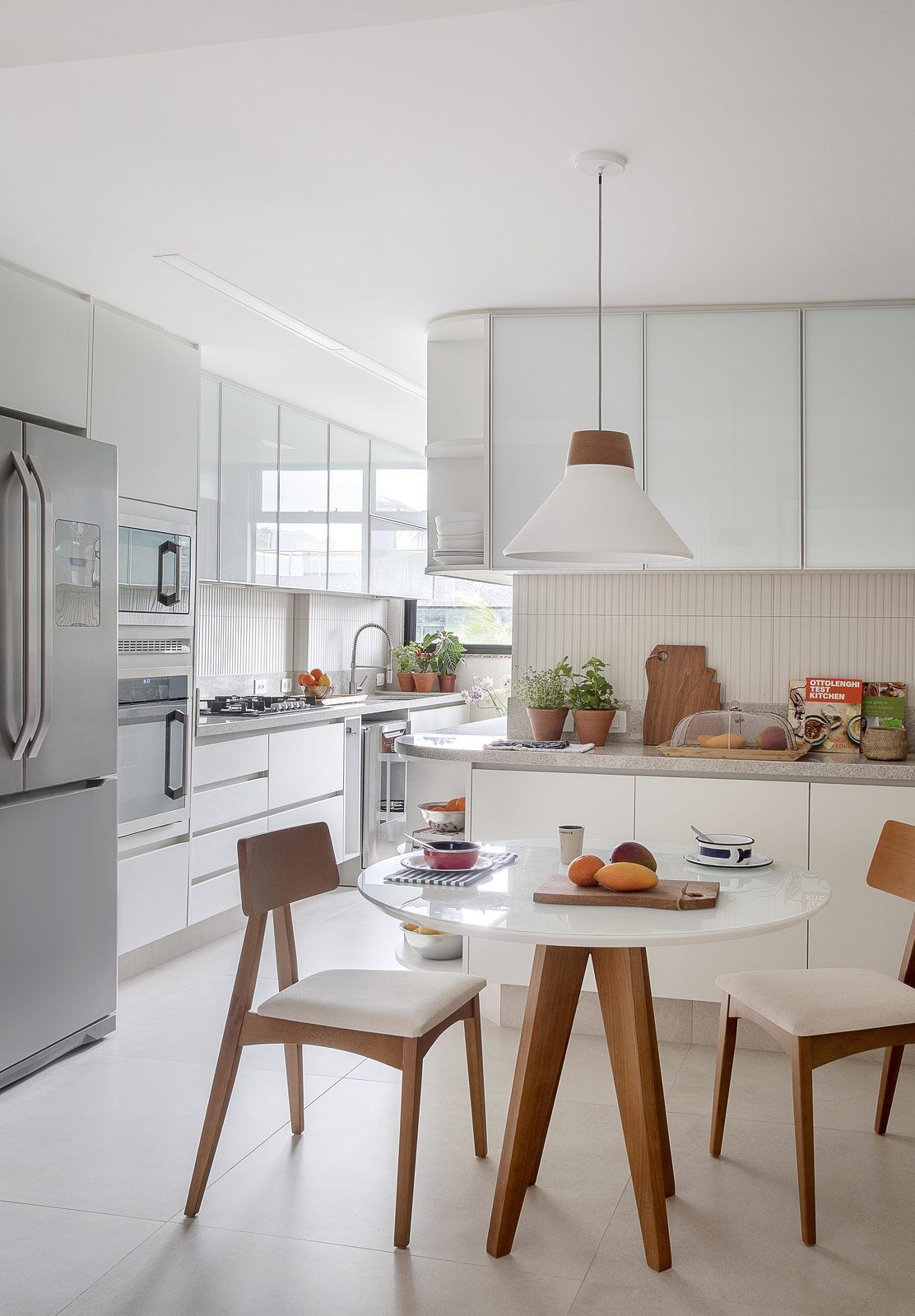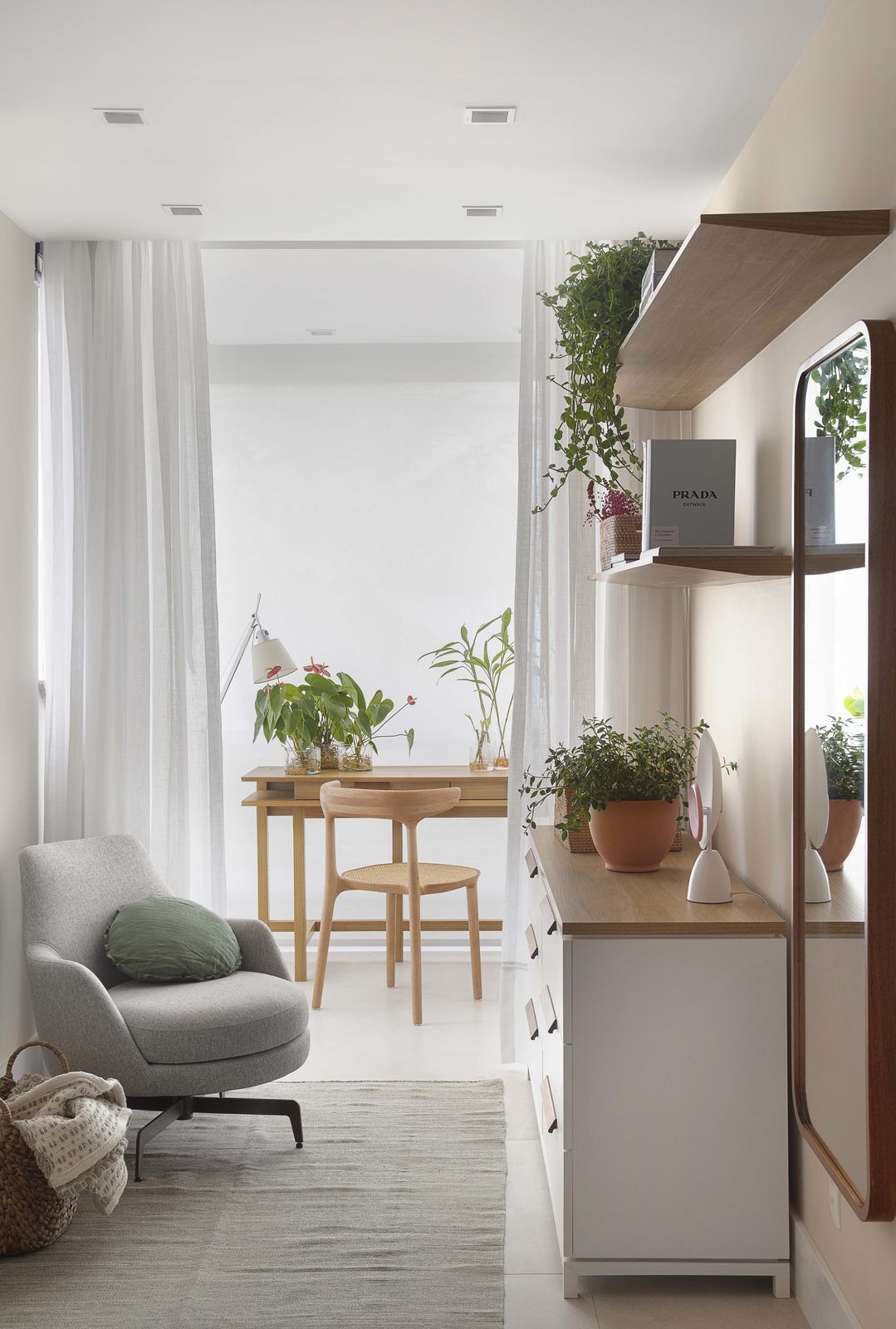 “A reforma contemplou todos os cômodos, com novo mobiliário e alterações pontuais na planta. As maiores mudanças foram a integração da varanda com a sala, da varanda lateral com a suíte principal e a criação de uma nova área de serviço, que saiu da cozinha e passou a ocupar o extinto quarto de serviço. Com essas modificações, o apartamento ganhou ares de casa.”