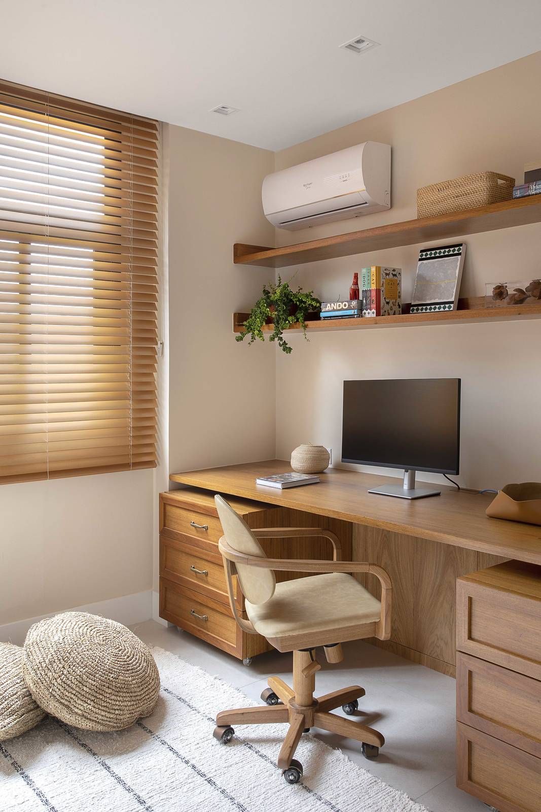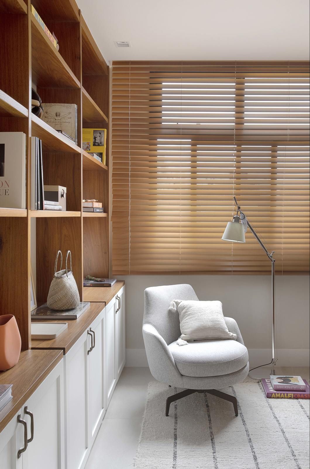 “O espaço dispõe de uma generosa estante para comportar livros e servir de fundo para eventuais reuniões online. Do outro lado do cômodo, a bancada de ponta a ponta proporciona um espaço de trabalho amplo e confortável.”
