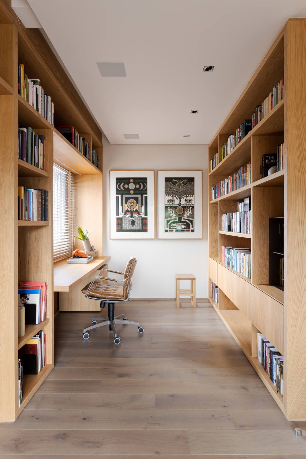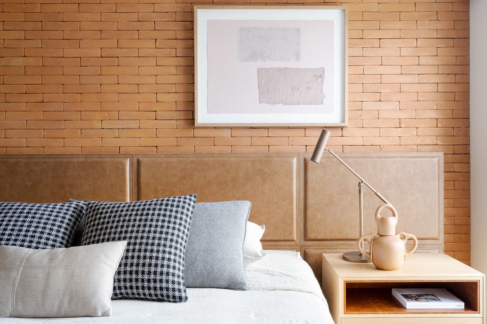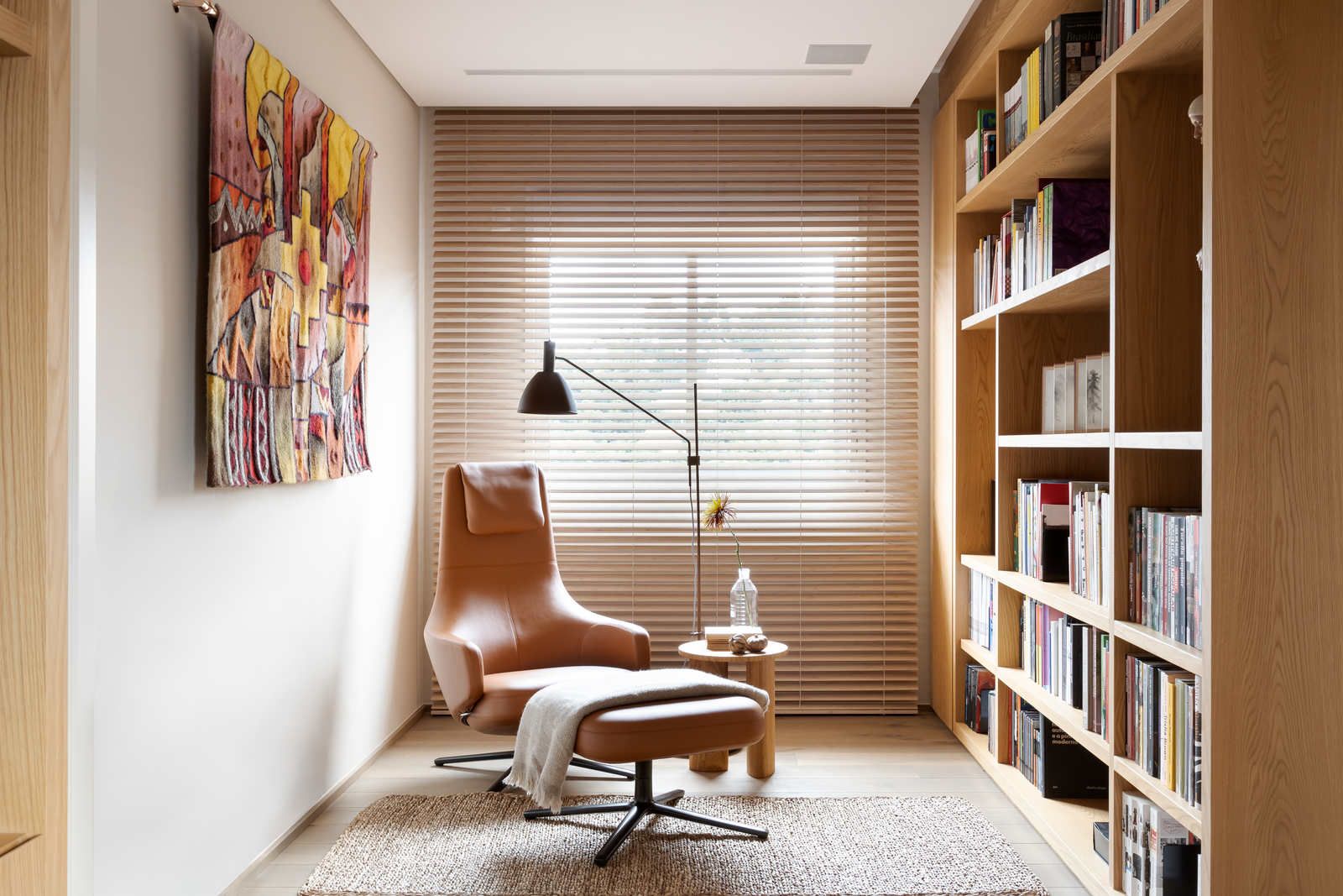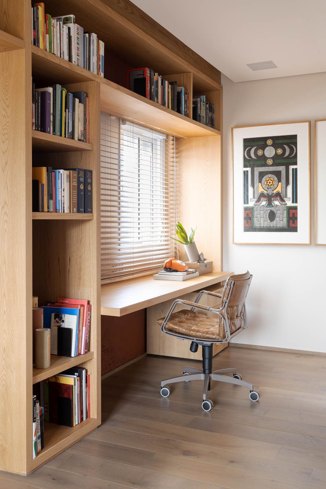 “Ele é advogado e adora trabalhar, então fizemos um espaço que atendesse a essa necessidade. Já ela é artista plástica, então o apartamento é recheado de cantinhos especiais com obras de arte.”