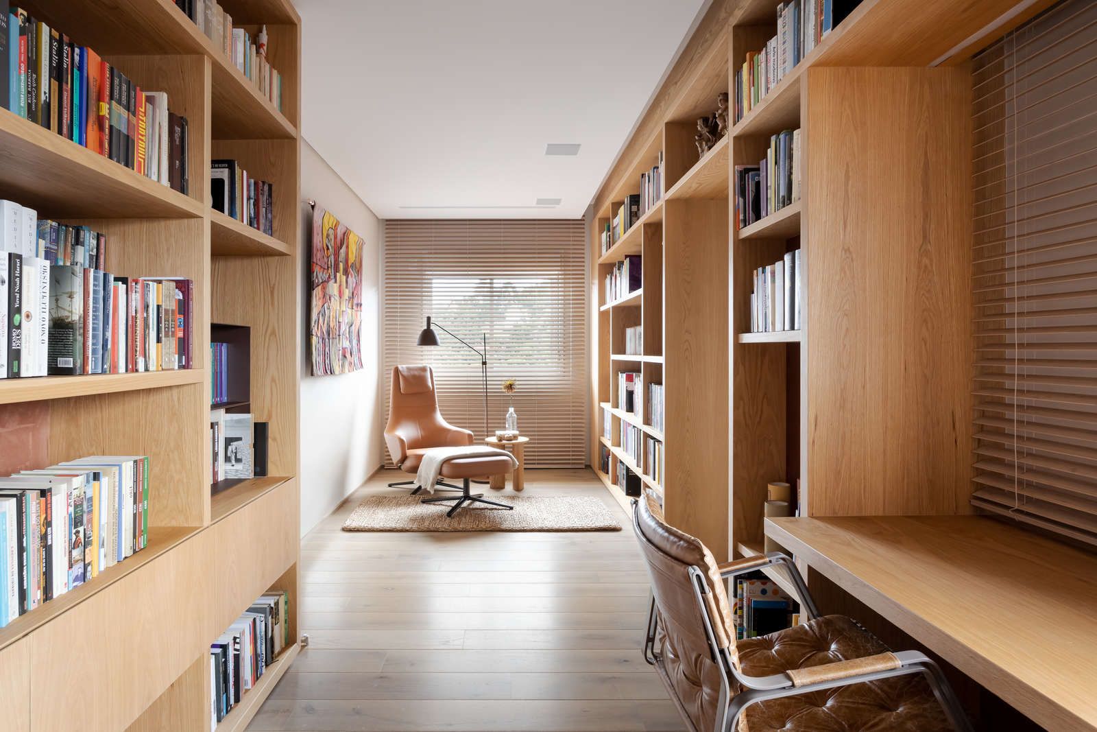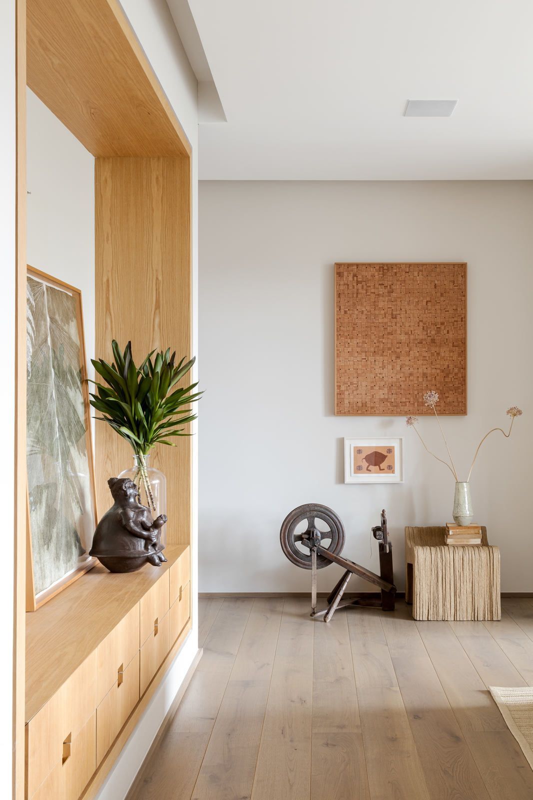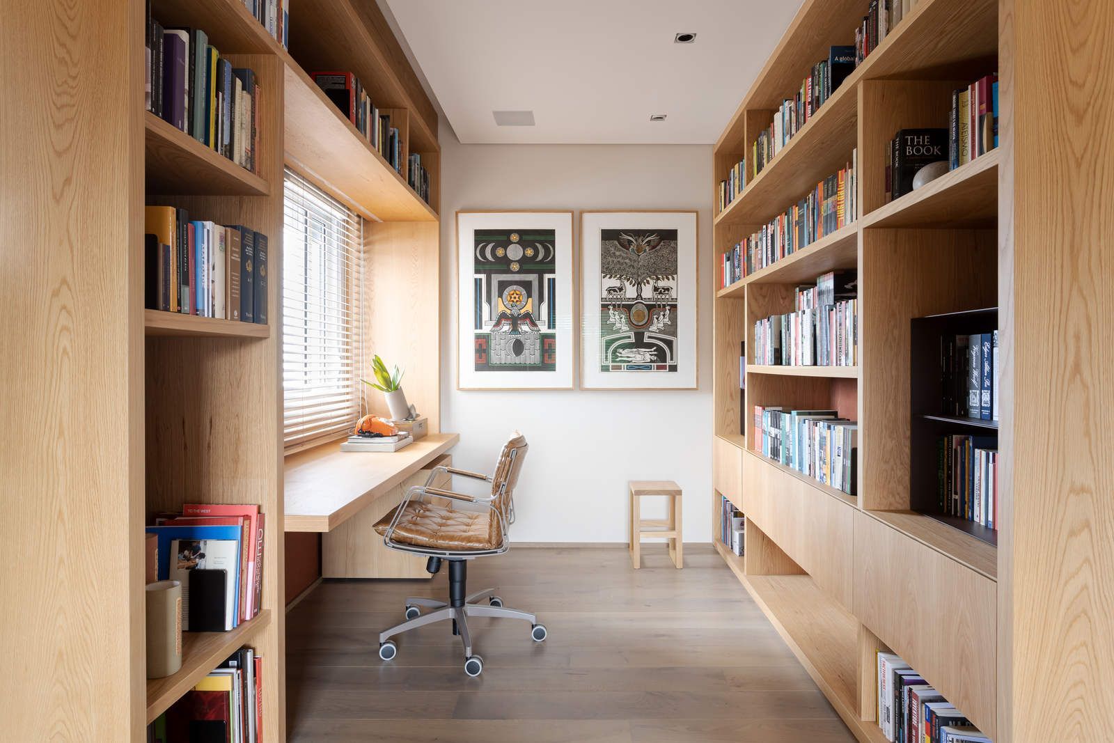 “Ele é advogado e adora trabalhar, então fizemos um espaço que atendesse a essa necessidade. Já ela é artista plástica, então o apartamento é recheado de cantinhos especiais com obras de arte.”