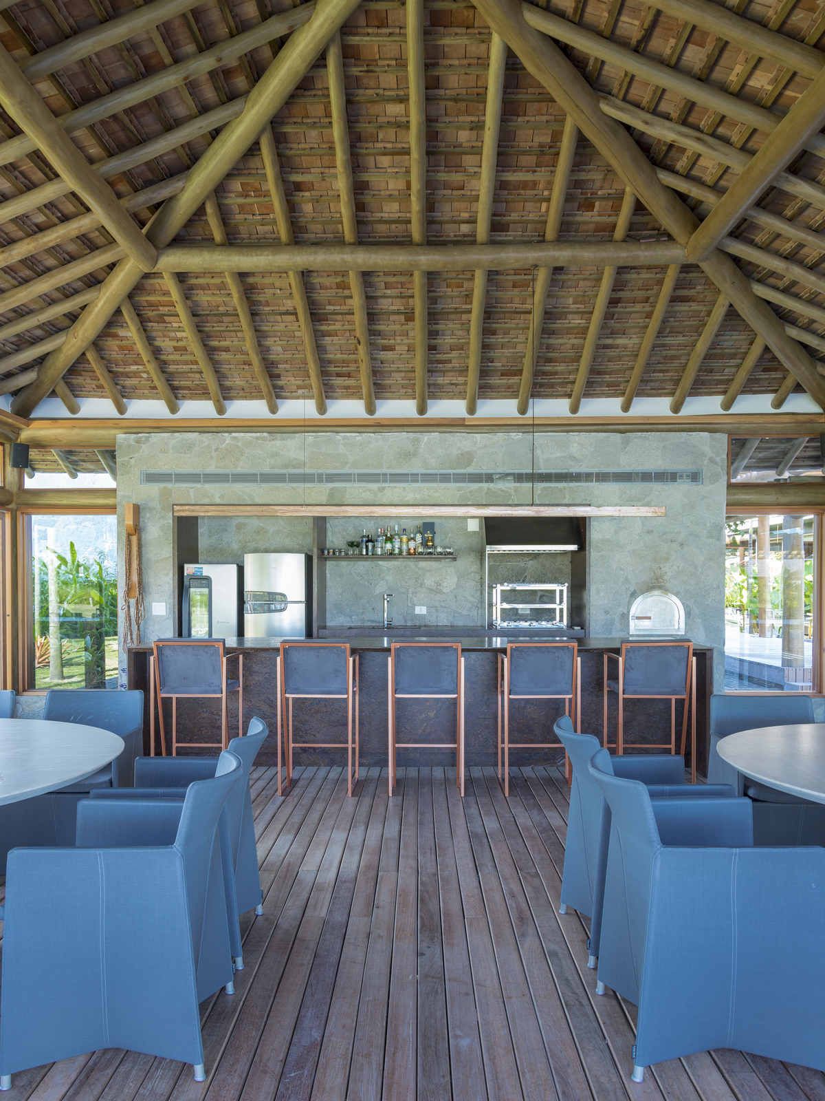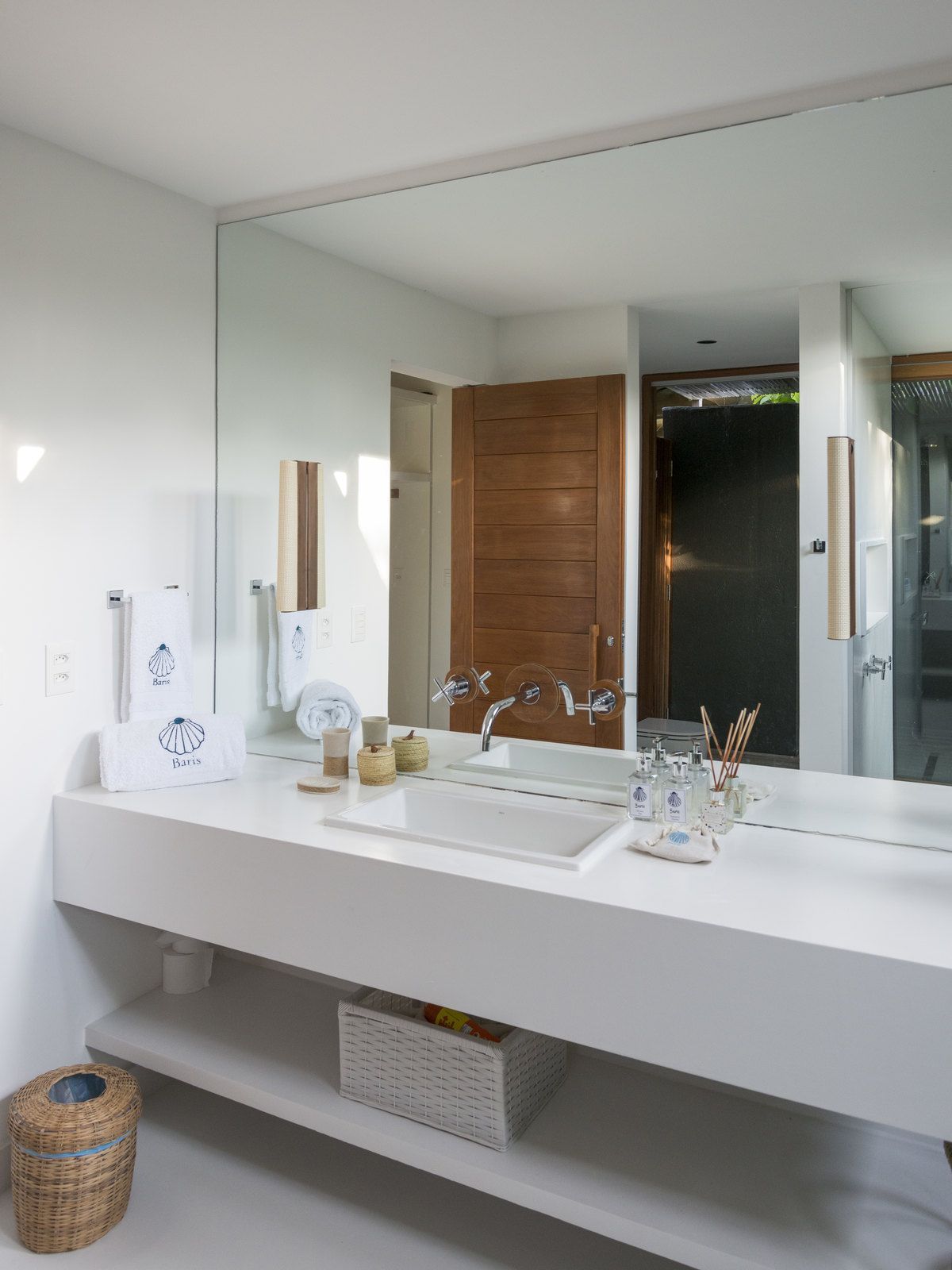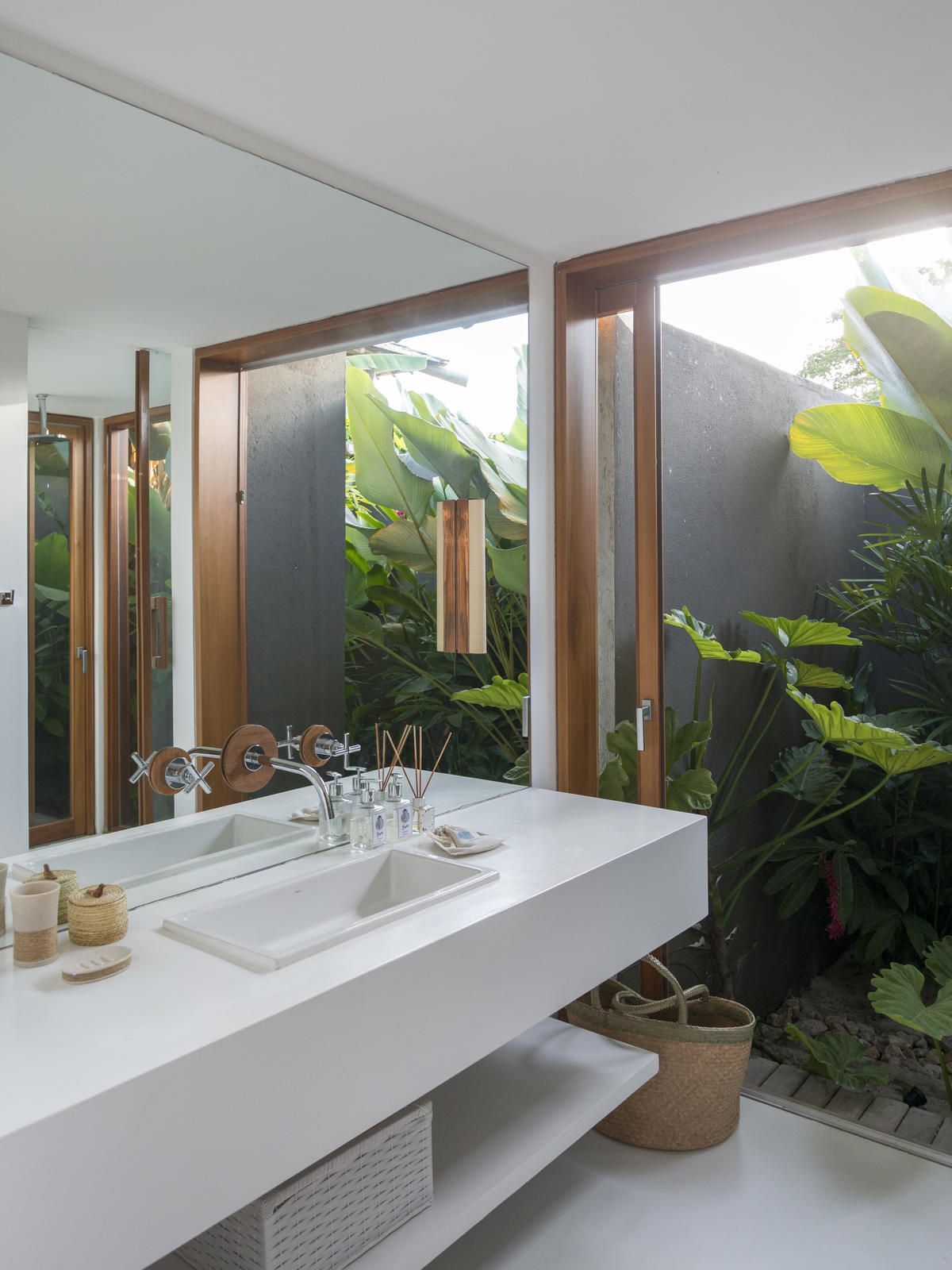 “A combinação de elementos rústicos com atuais formam o que há de mais precioso na casa, sem contar a vista exuberante que pode ser admirada de vários ambientes, como do living, jantar, gourmet, deck, piscina, e dos quartos do pavimento superior. O terreno e o projeto formam uma simbiose única e particular, e trazem uma beleza ímpar ao local. Tudo especialmente pensado com toques brasileiros, como o piso em cimento queimado na cor branco, os decks em madeira e piscina com acabamento que imita a areia da praia.”