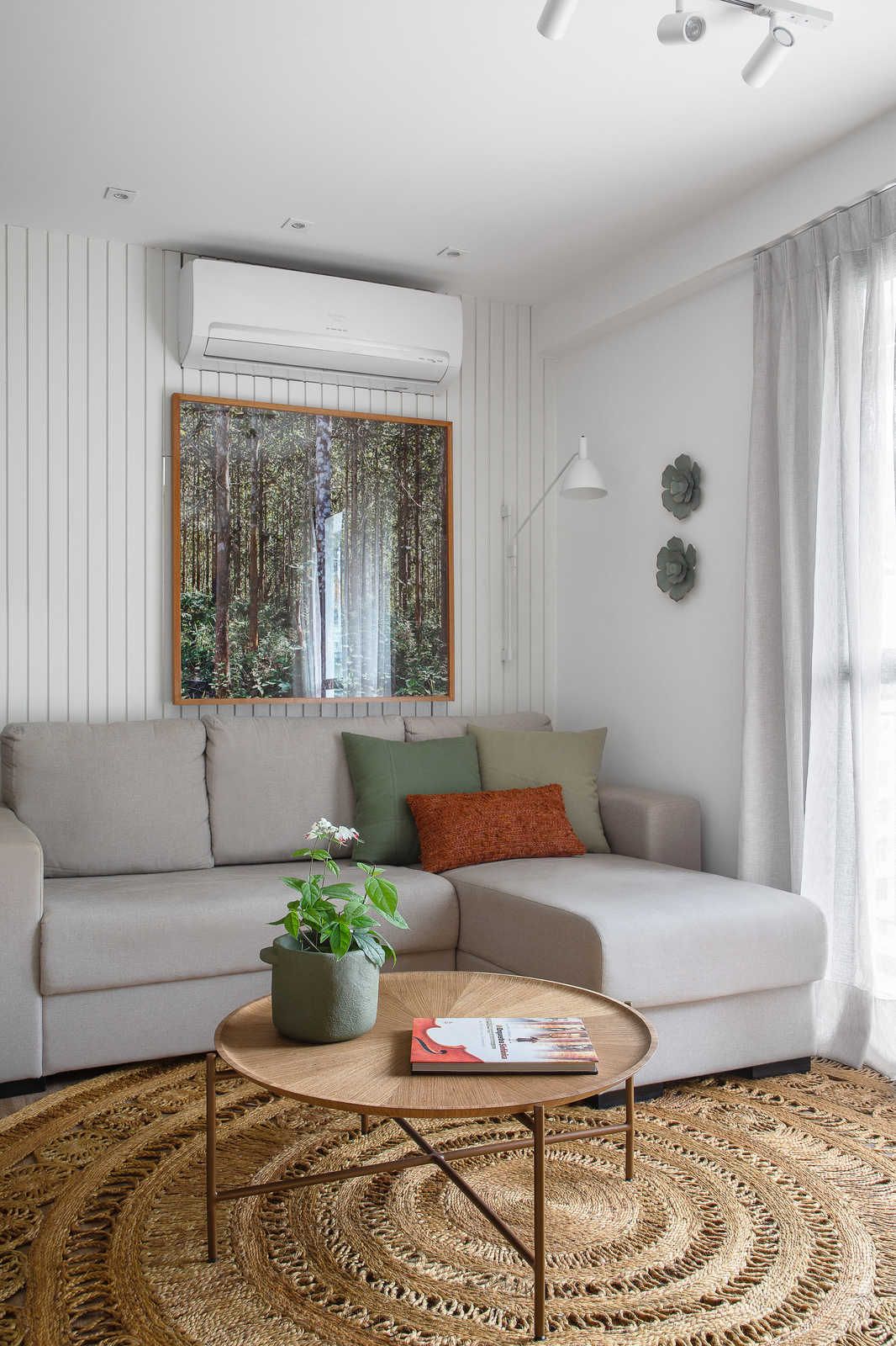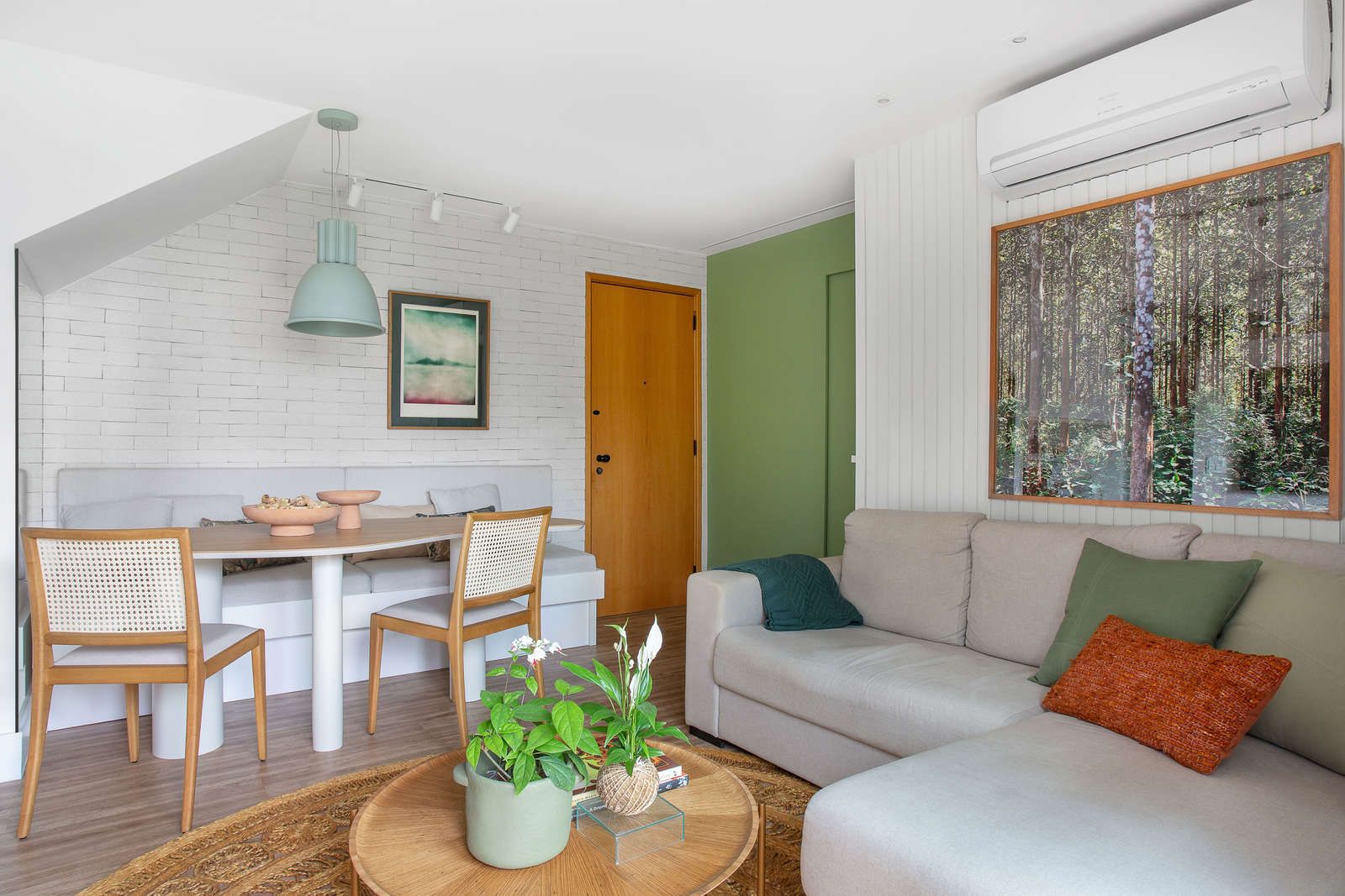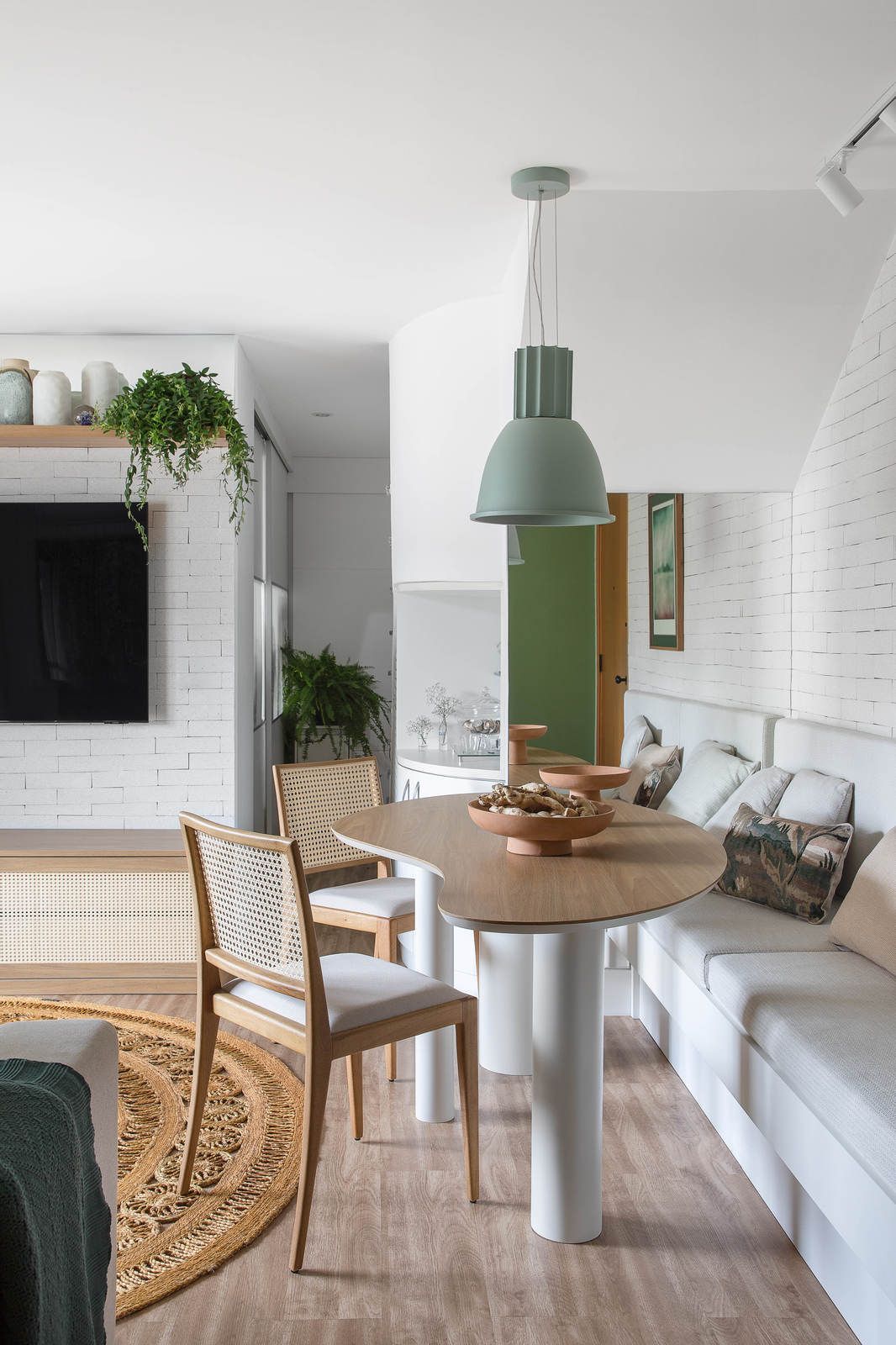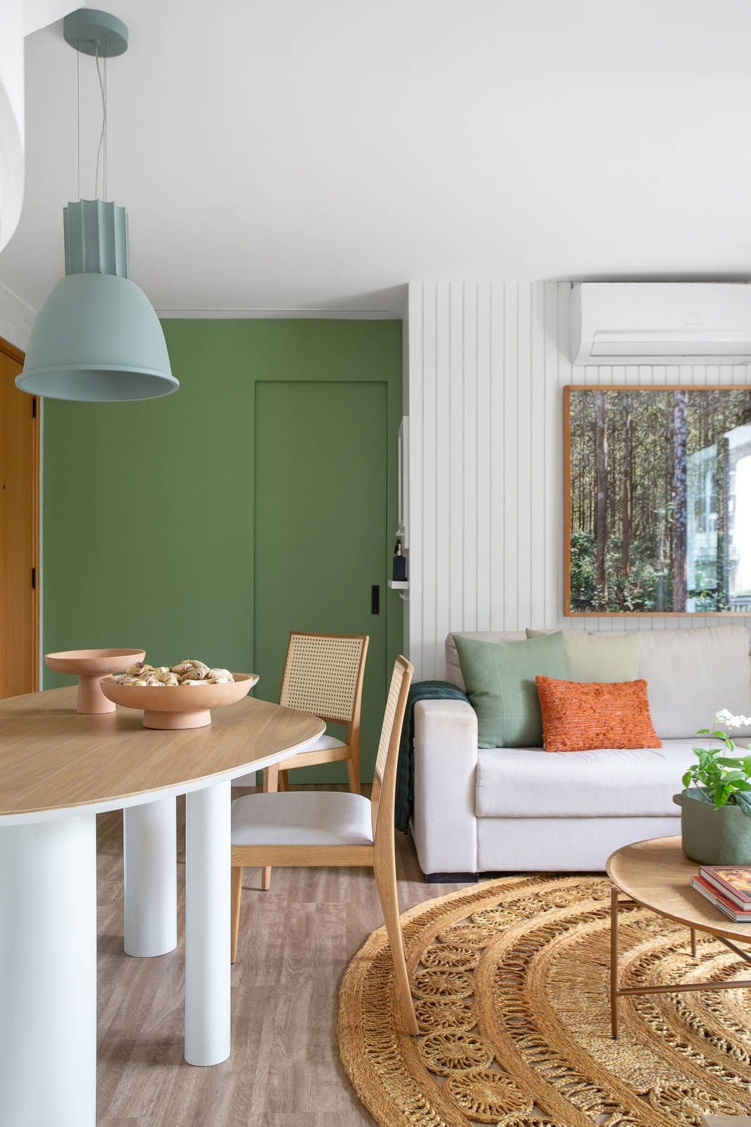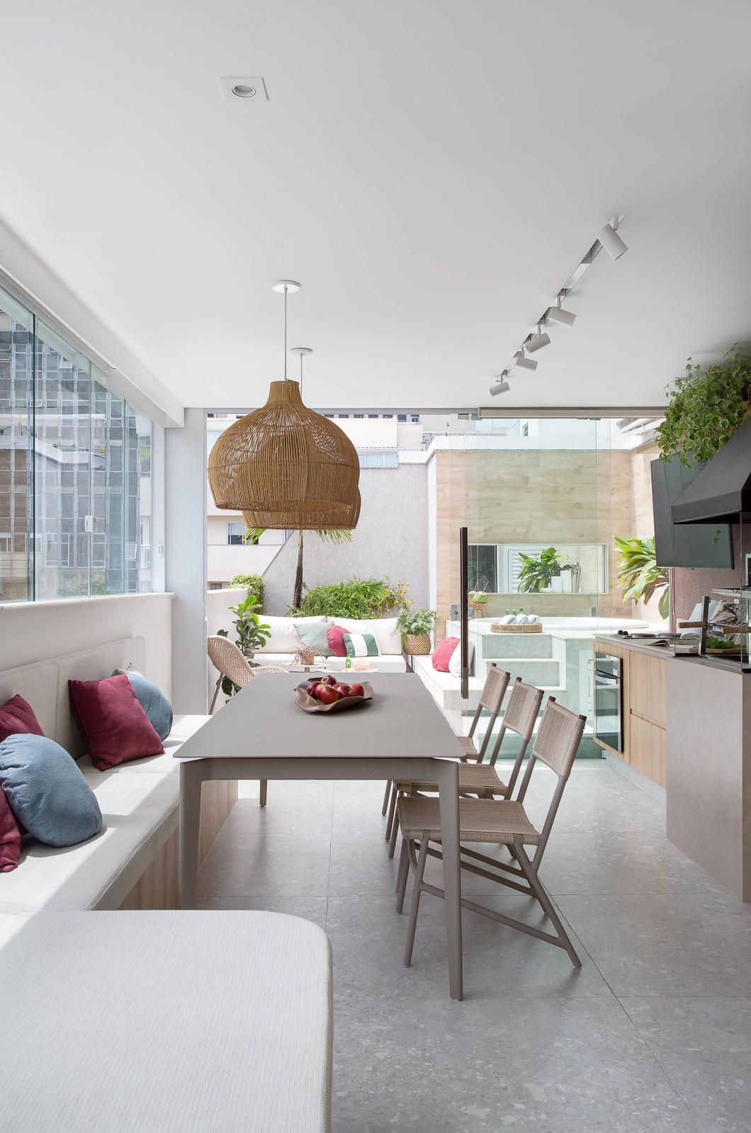 “Me inspirei na arquitetura escandinava, com um toque de Boho-chic, para definir o conceito do projeto, mesclando cores claras e tons terrosos associados ao verde com materiais que remetem à natureza, como a palha natural presente em luminárias, portas de armários e tapetes, o porcelanato que imita textura de rocha e as plantas naturais. A farta presença de luz natural nos espaços também contribuiu para aumentar a sensação de conforto e aconchego.”