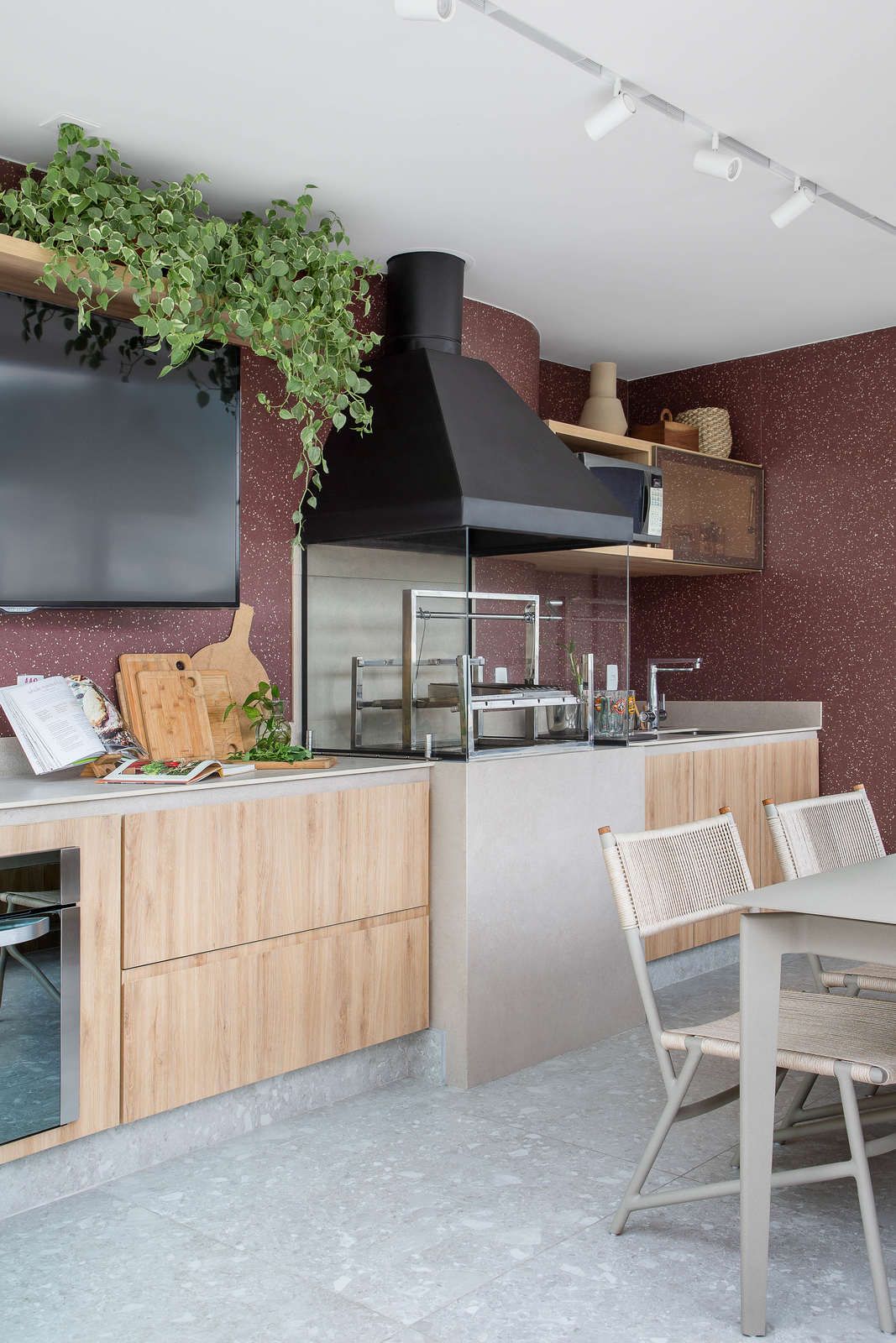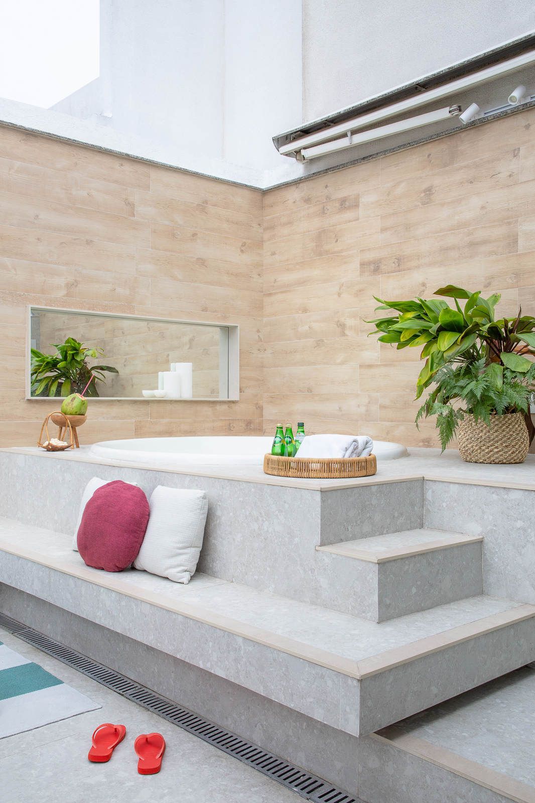 “Eles também queriam uma ampla mesa de refeição no espaço da área gourmet, já que a sala do pavimento inferior é mais compacta. Ainda, pediram para remover o deck de madeira do spa, pois gerava manutenção constante, e, no lugar dele, projetar uma estrutura de alvenaria revestida com porcelanato.”